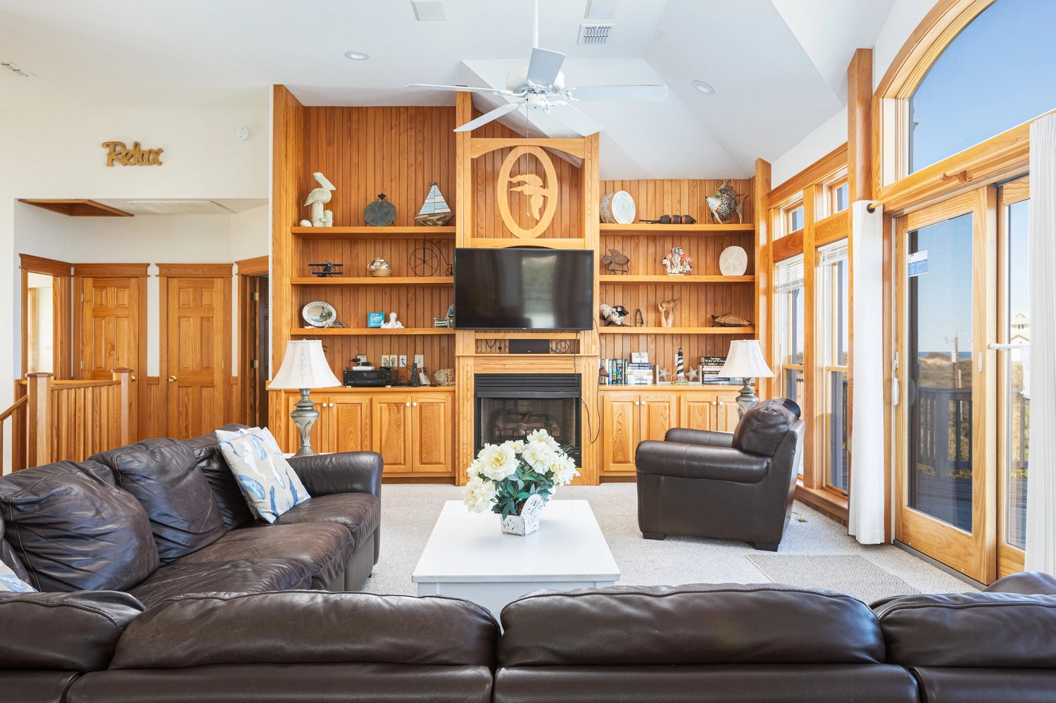 Great room; kitchen; dining area; screened porch; open decks with ocean views.