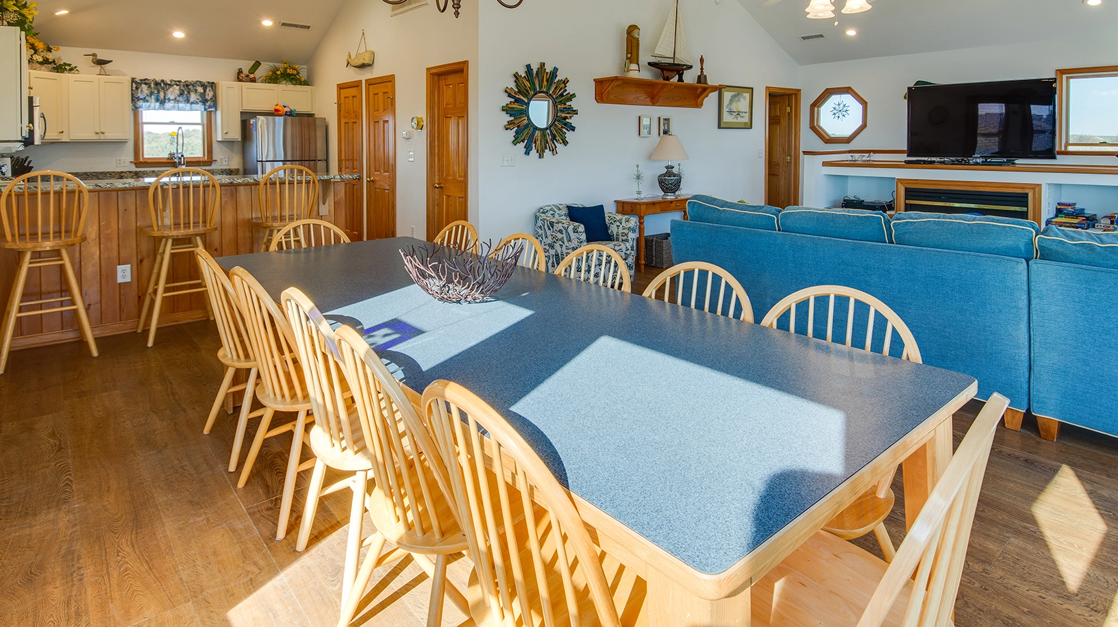 Open great room; kitchen; dining area; sunroom.