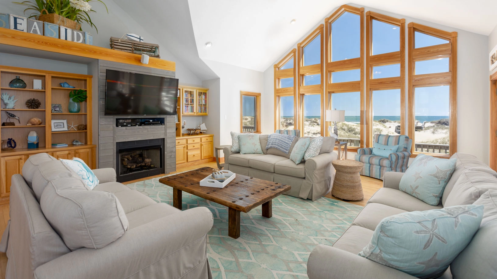 "We've stayed in Carova several times, this home was our favorite so far! It's absolutely beautiful from the layout, the furnishings, appliances, pool area....it had everything we needed to accommodate our large group. We usually travel with 4-6 families and all the master King rooms were fantastic. The kitchen was very well stocked and with good quality items to use. We loved the double sinks and dishwashers. The decks being brand new was a nice extra. The elevator helped out greatly with move in/move out day. If we had to be picky about anything I'd have to say it needs to offer a larger grill. A very small charcoal one was provided per description, but was difficult to use for grilling for so many people. The only other small issue was with trash pick up. Again we were a large group and our bins stayed pretty full throughout the week. We called Twiddy a few times to request extra pick up for fear the animals would scatter it or the horses would get into it. Twiddy responded and sent someone out. We love Carova and will be back again!"
