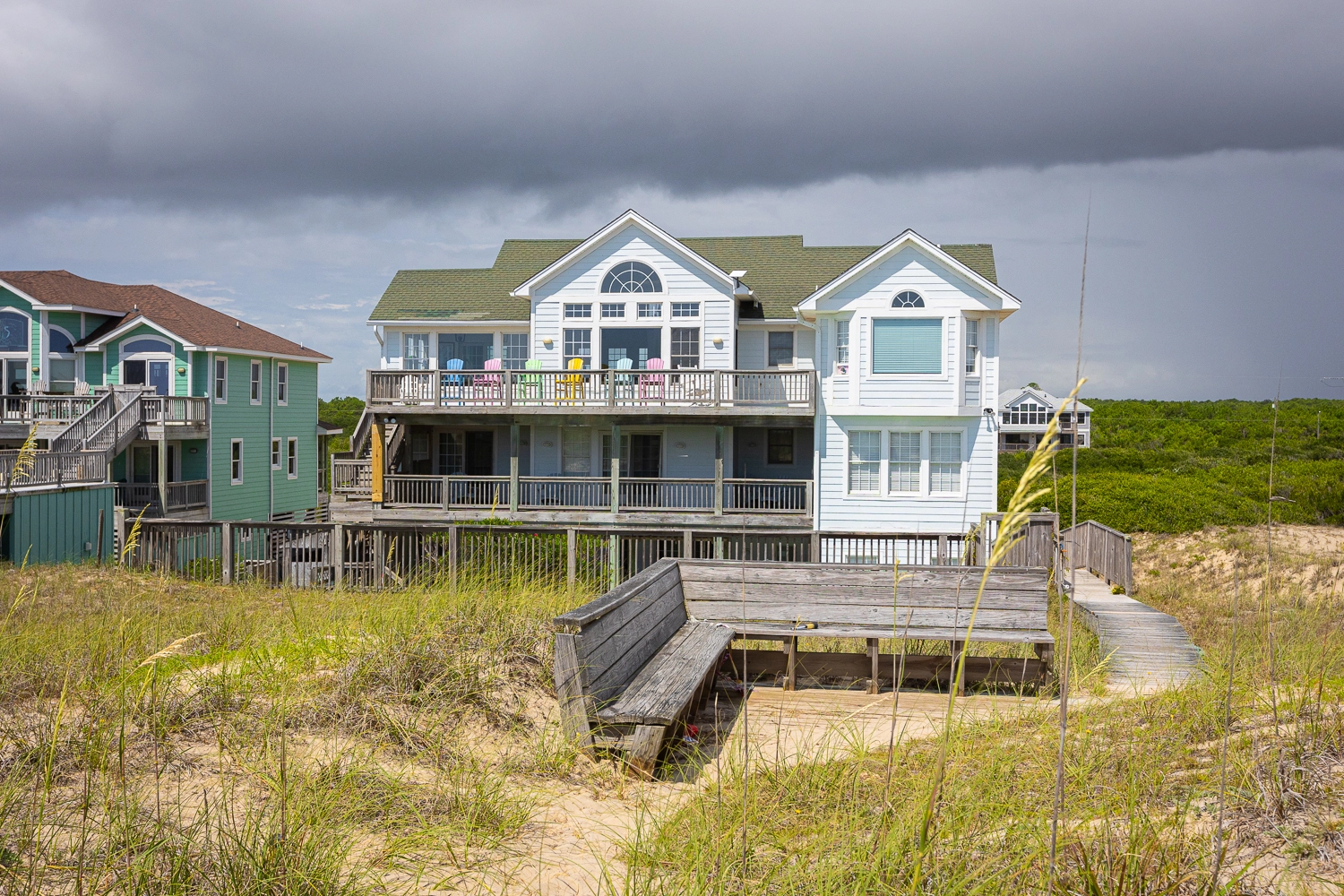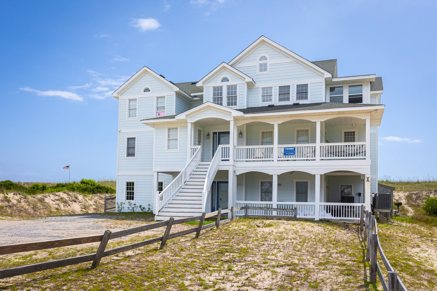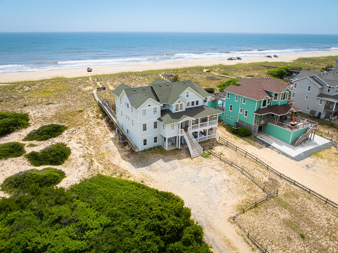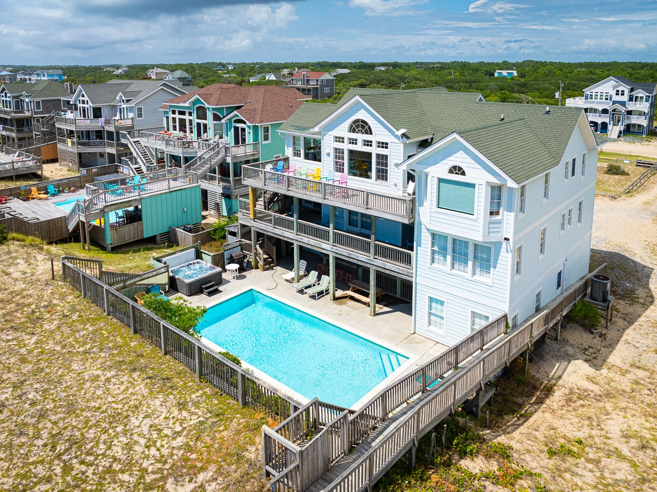 Private pool with tiki bar, hot tub, handicap-friendly ramp from parking area to top of dunes, elevator, multiple TVs/DVDs, two gas fireplaces, two washers/dryers.