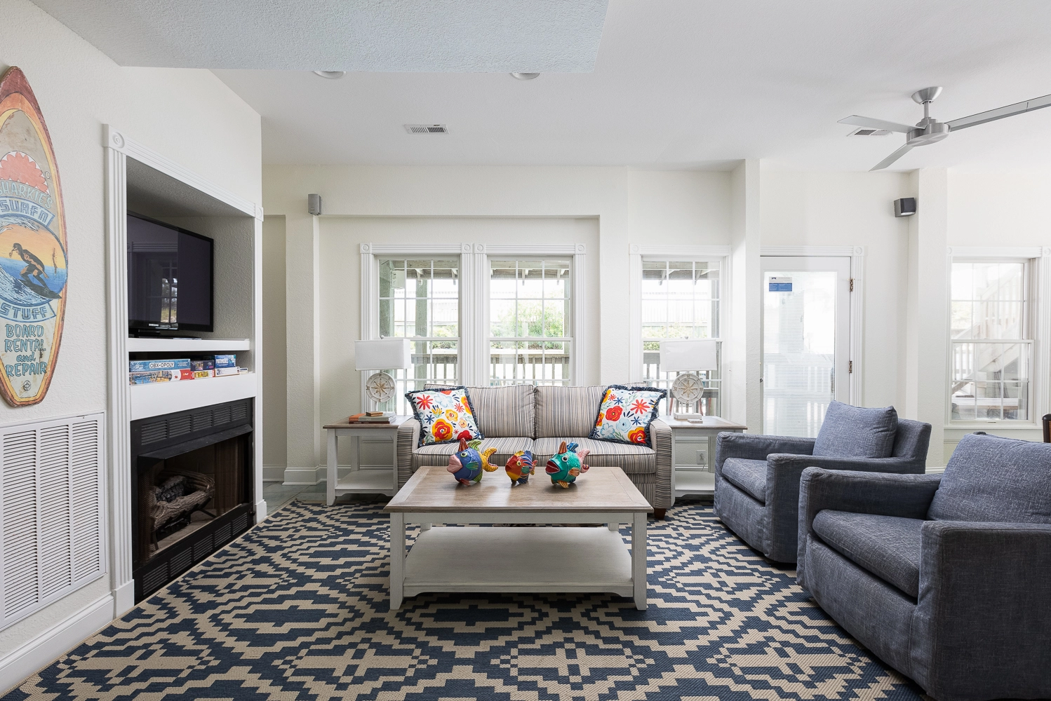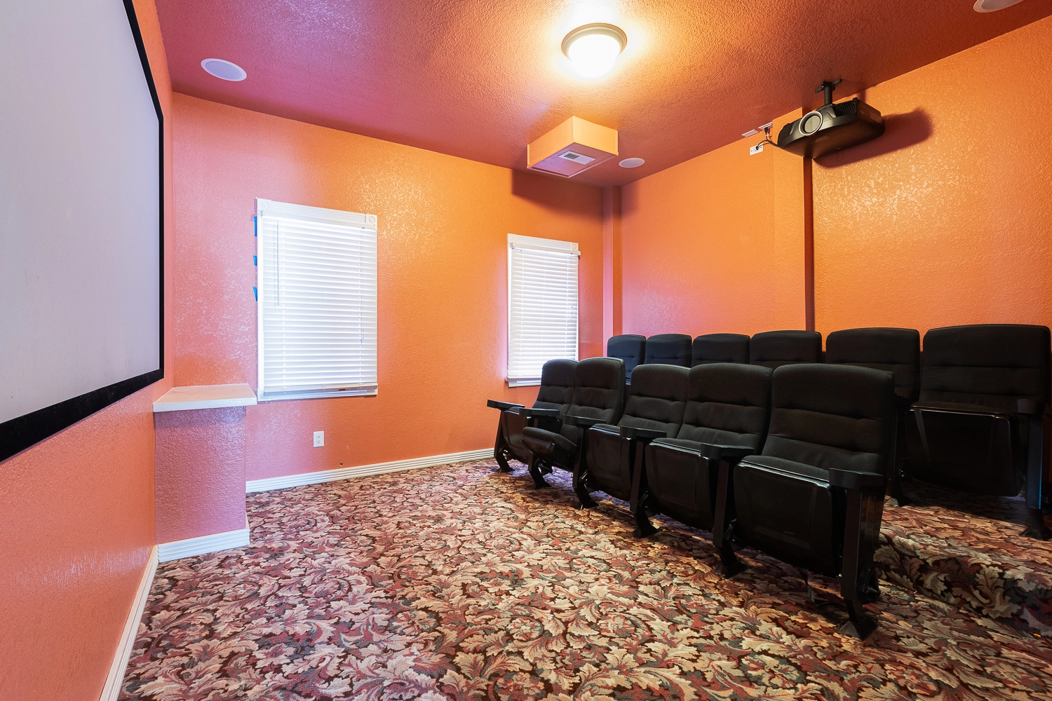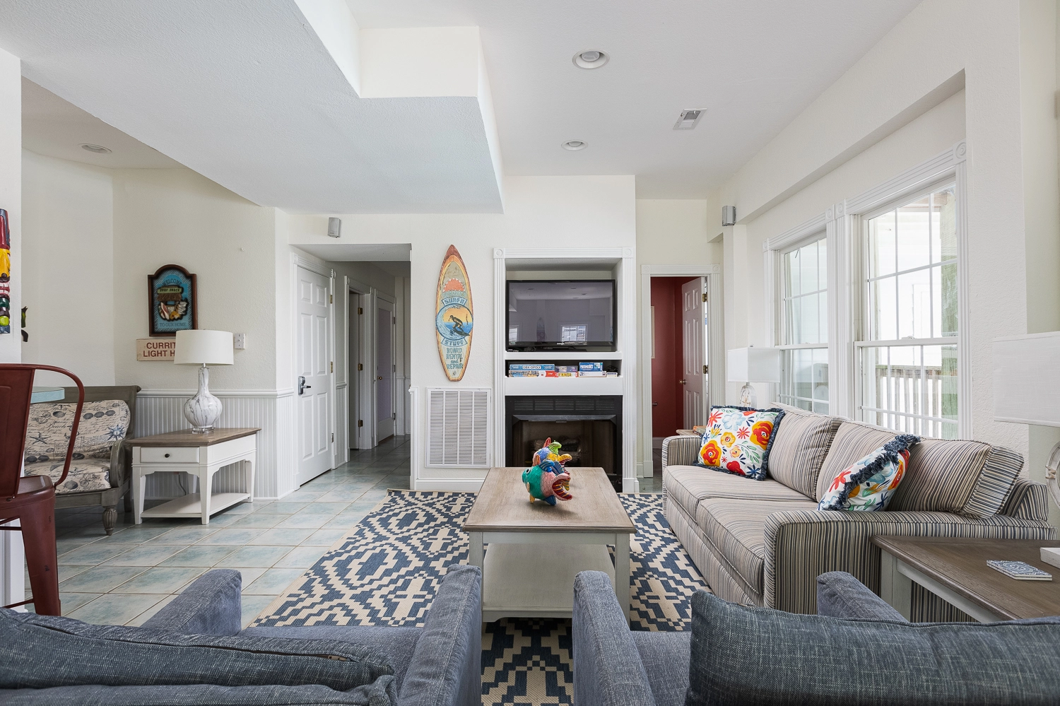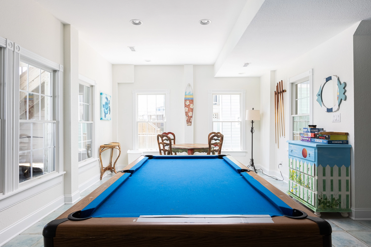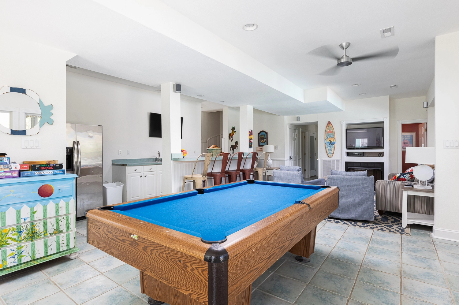 Theater room; game room with pool table and arcade game; den with gas fireplace.