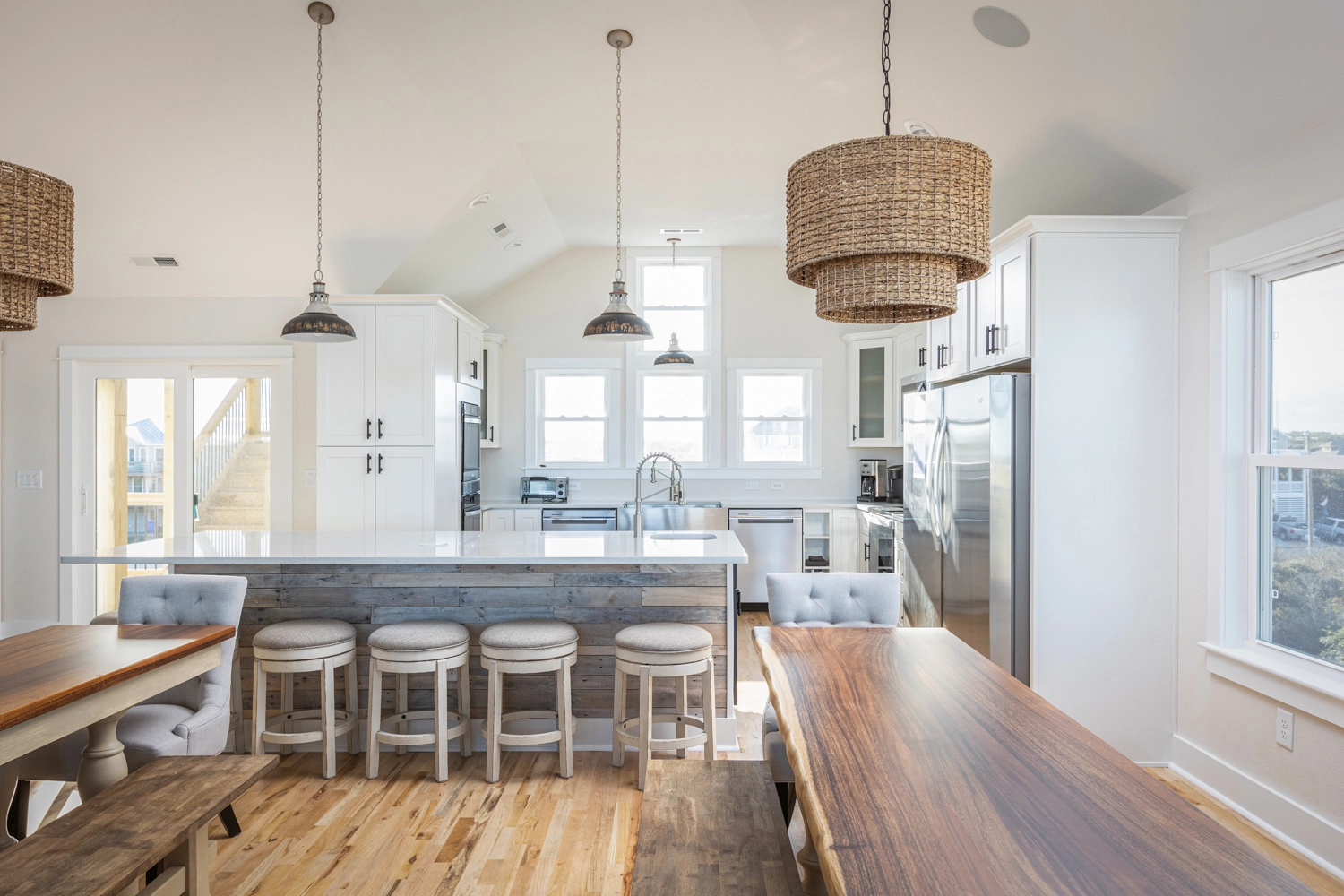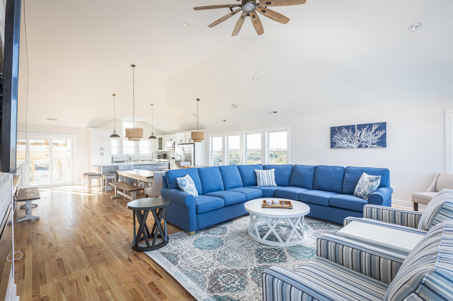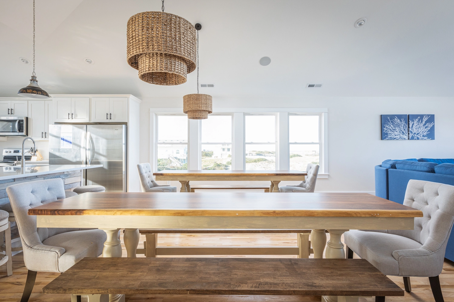 Great room with electric fireplace; kitchen with two refrigerators and two dishwashers; dining area.