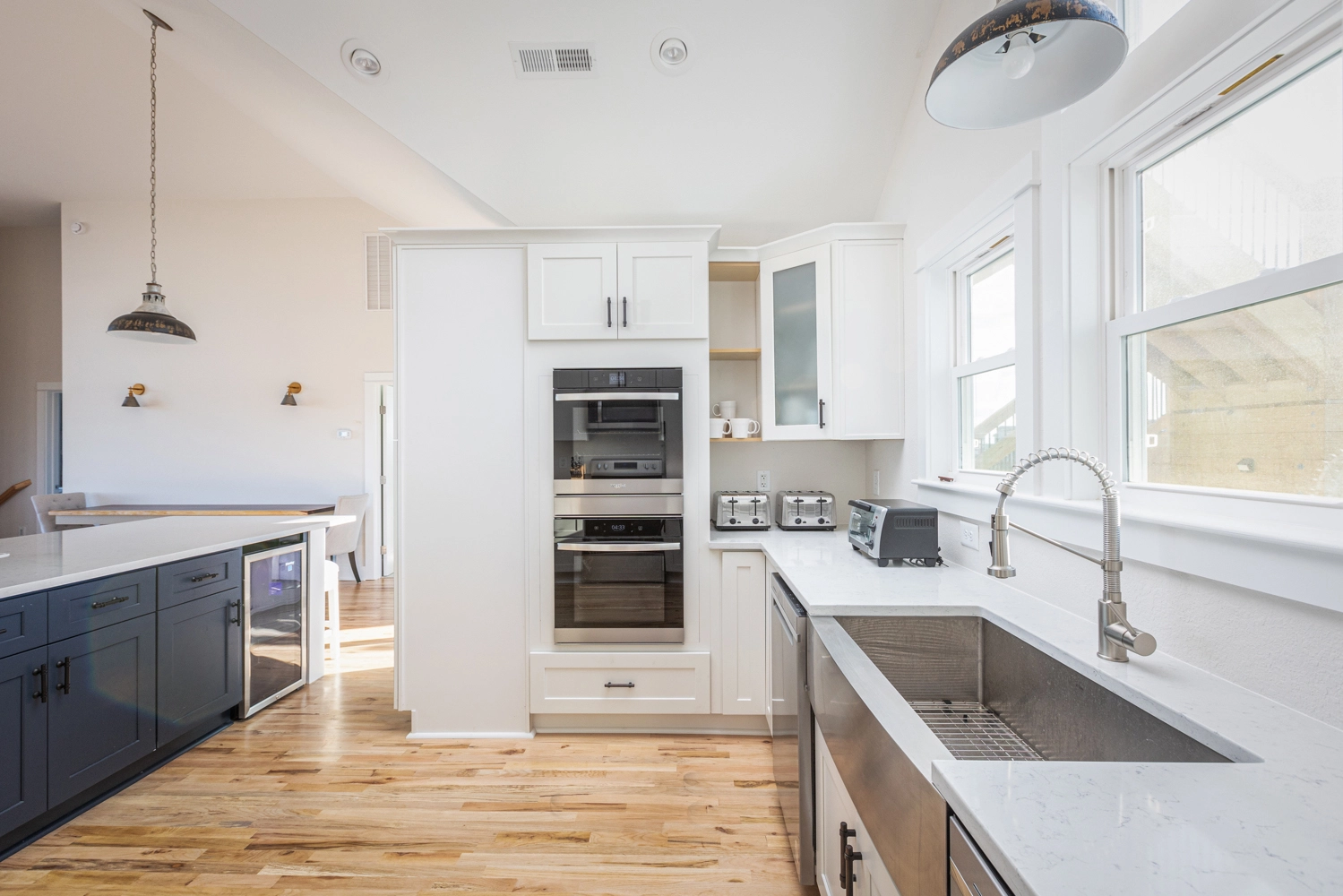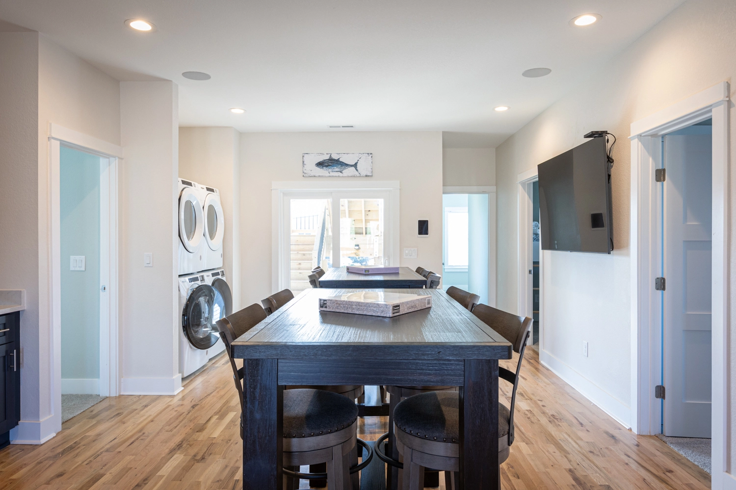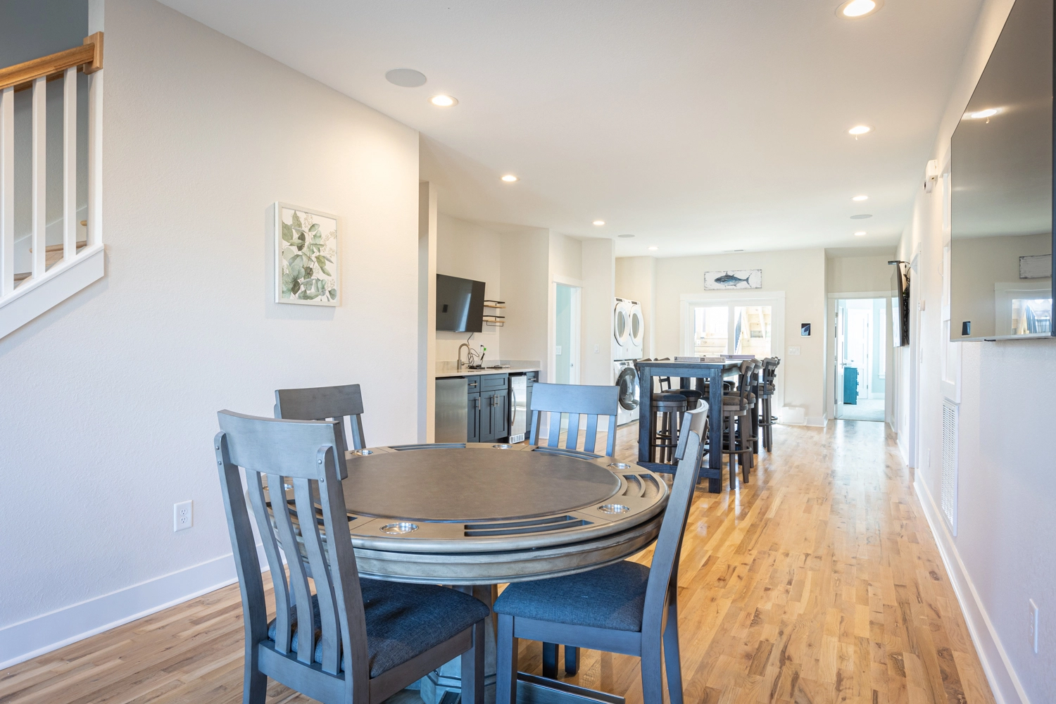 Great room with electric fireplace; kitchen with two refrigerators and two dishwashers; dining area.