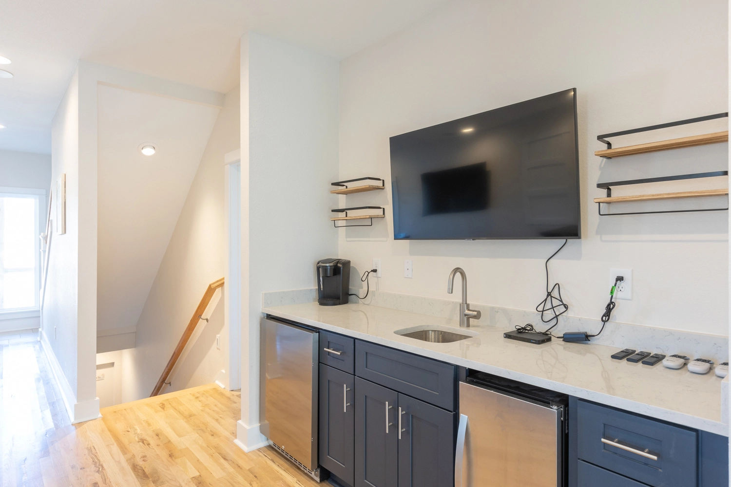 Sitting area with electric fireplace and wet bar; double laundry.