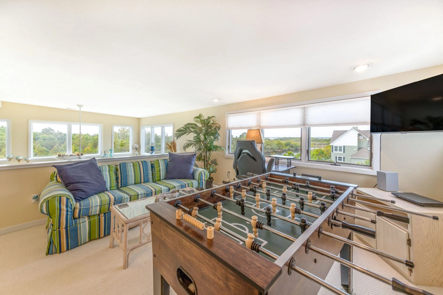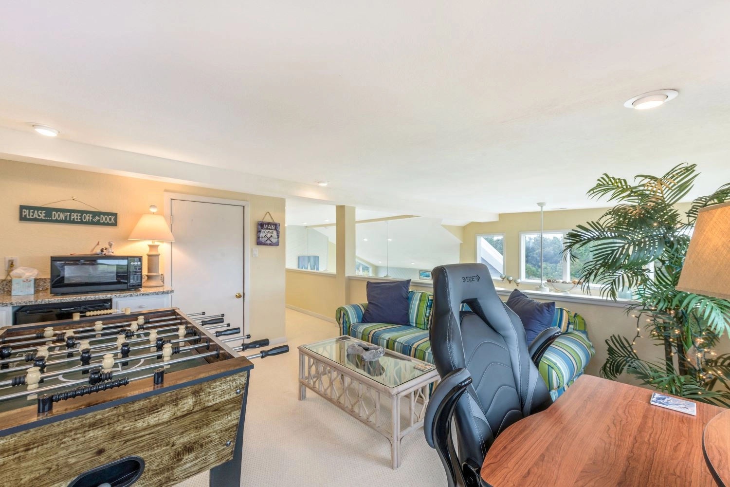 Den with foosball and wet bar with beverage refrigerator.