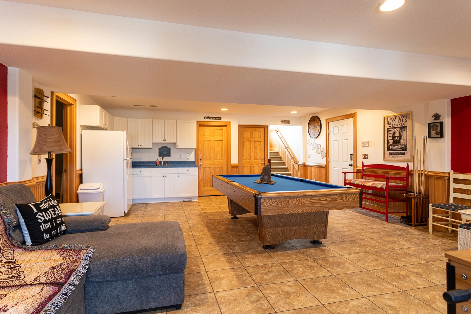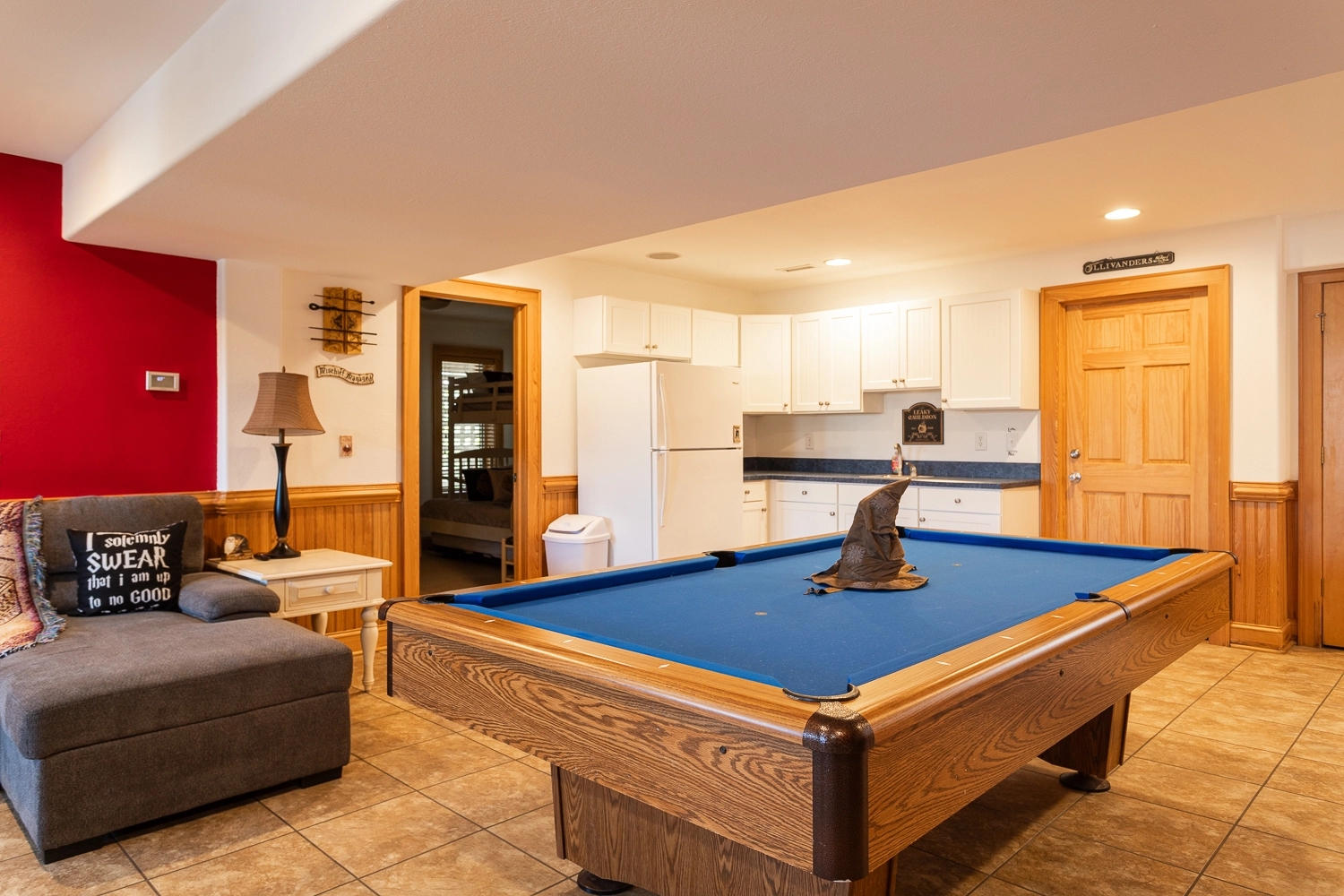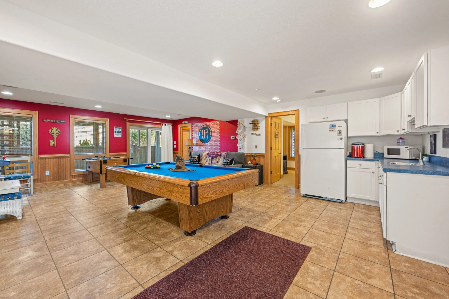 Rec room with pool table, arcade game, foosball, and kitchenette with refrigerator.
