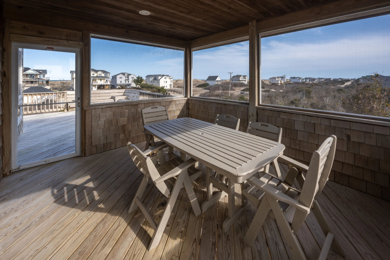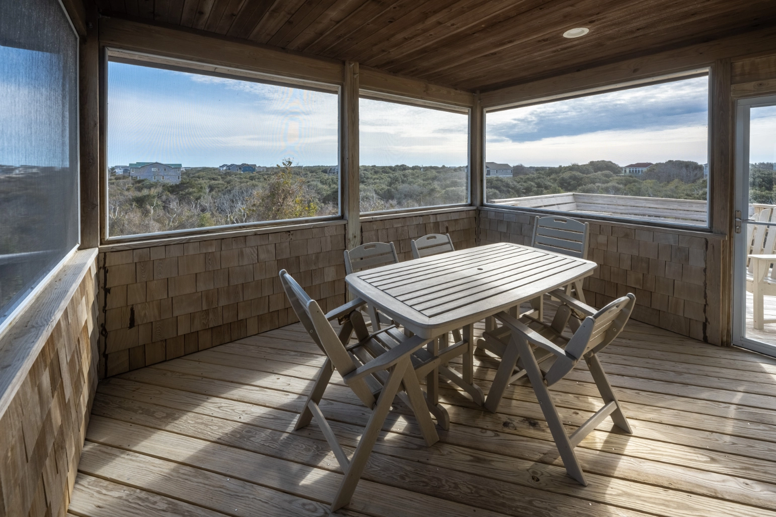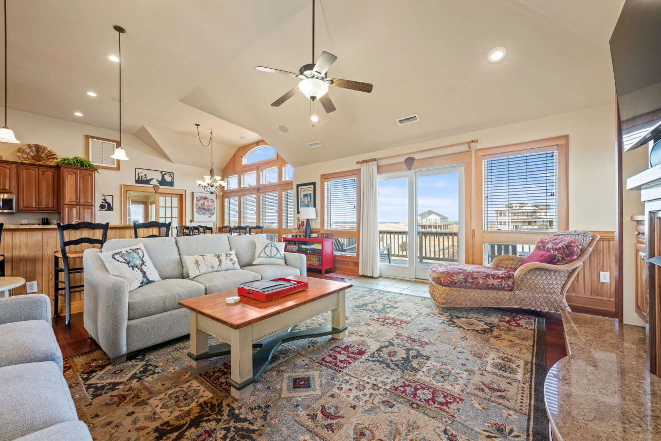 Great room; kitchen; dining area; screened porch.