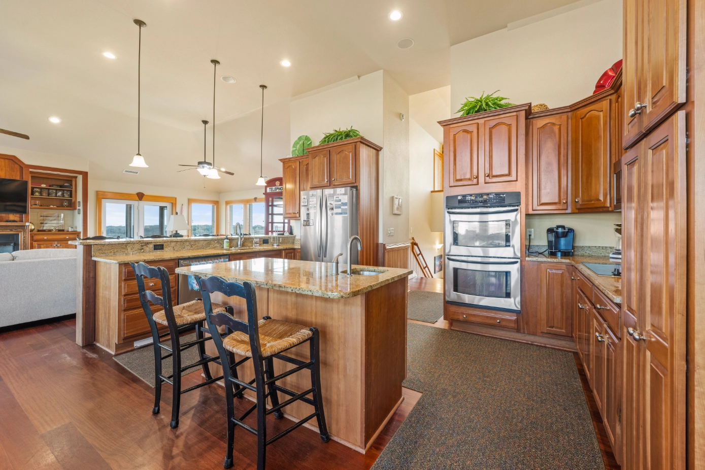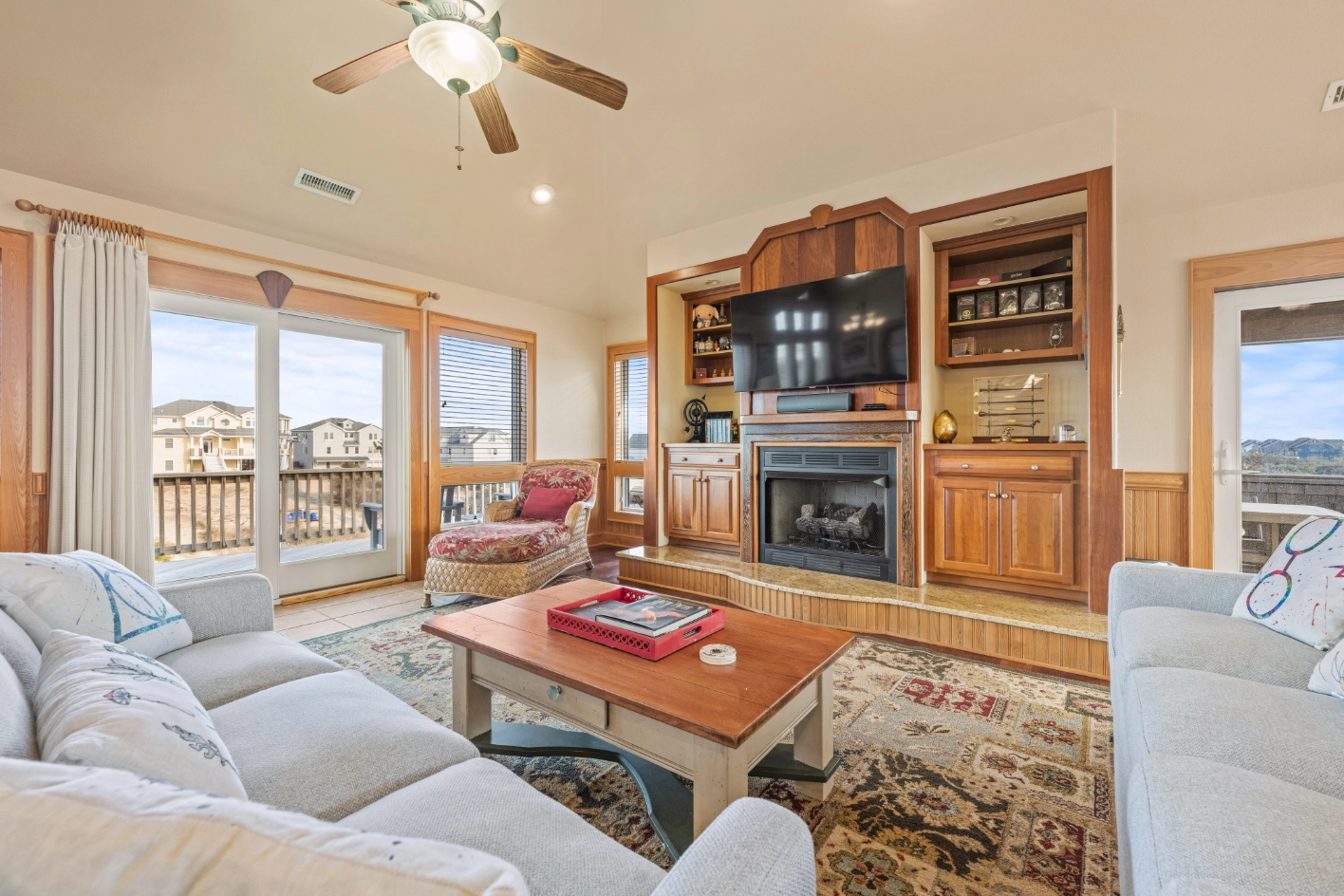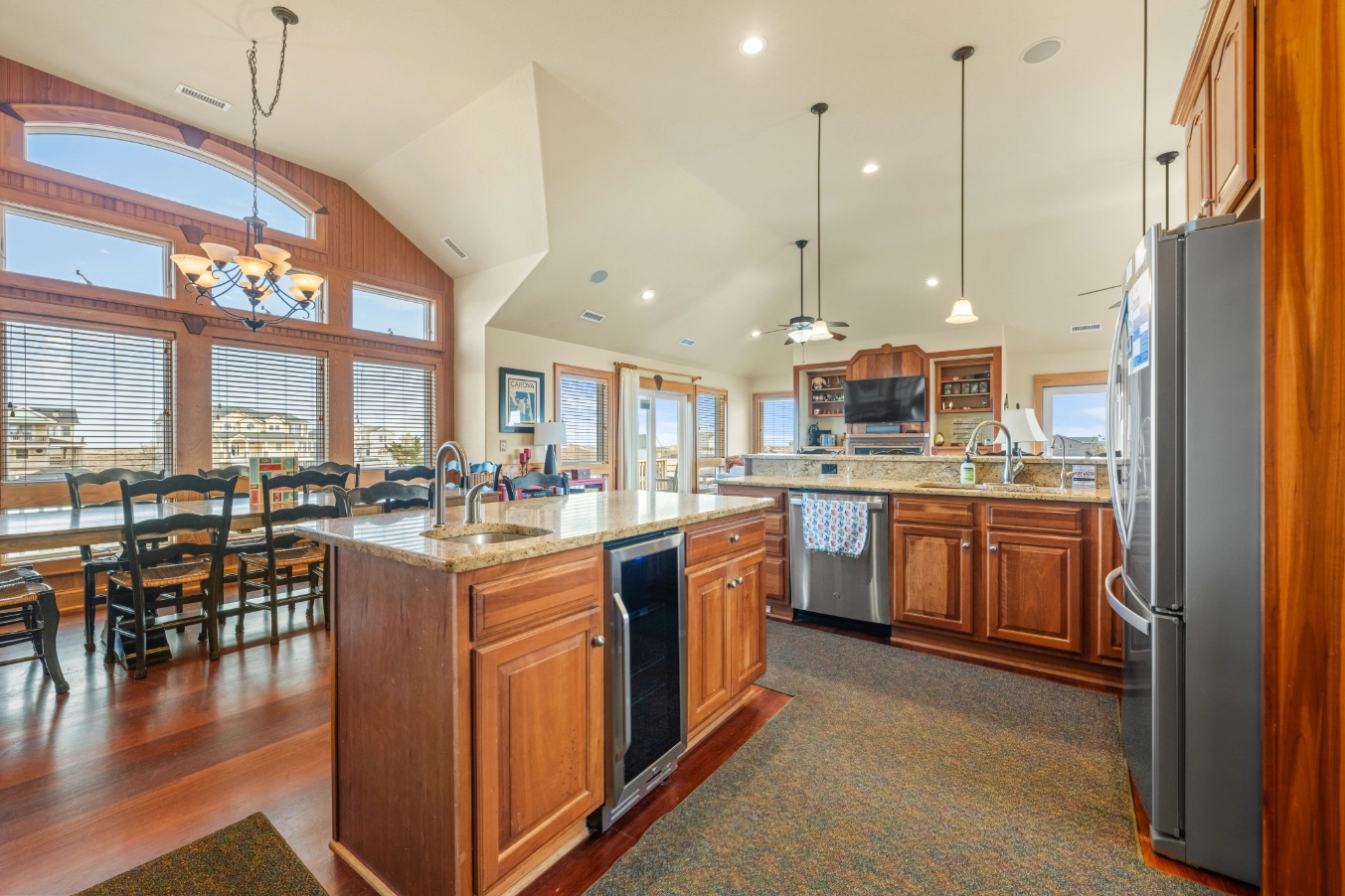 Great room; kitchen; dining area; screened porch.