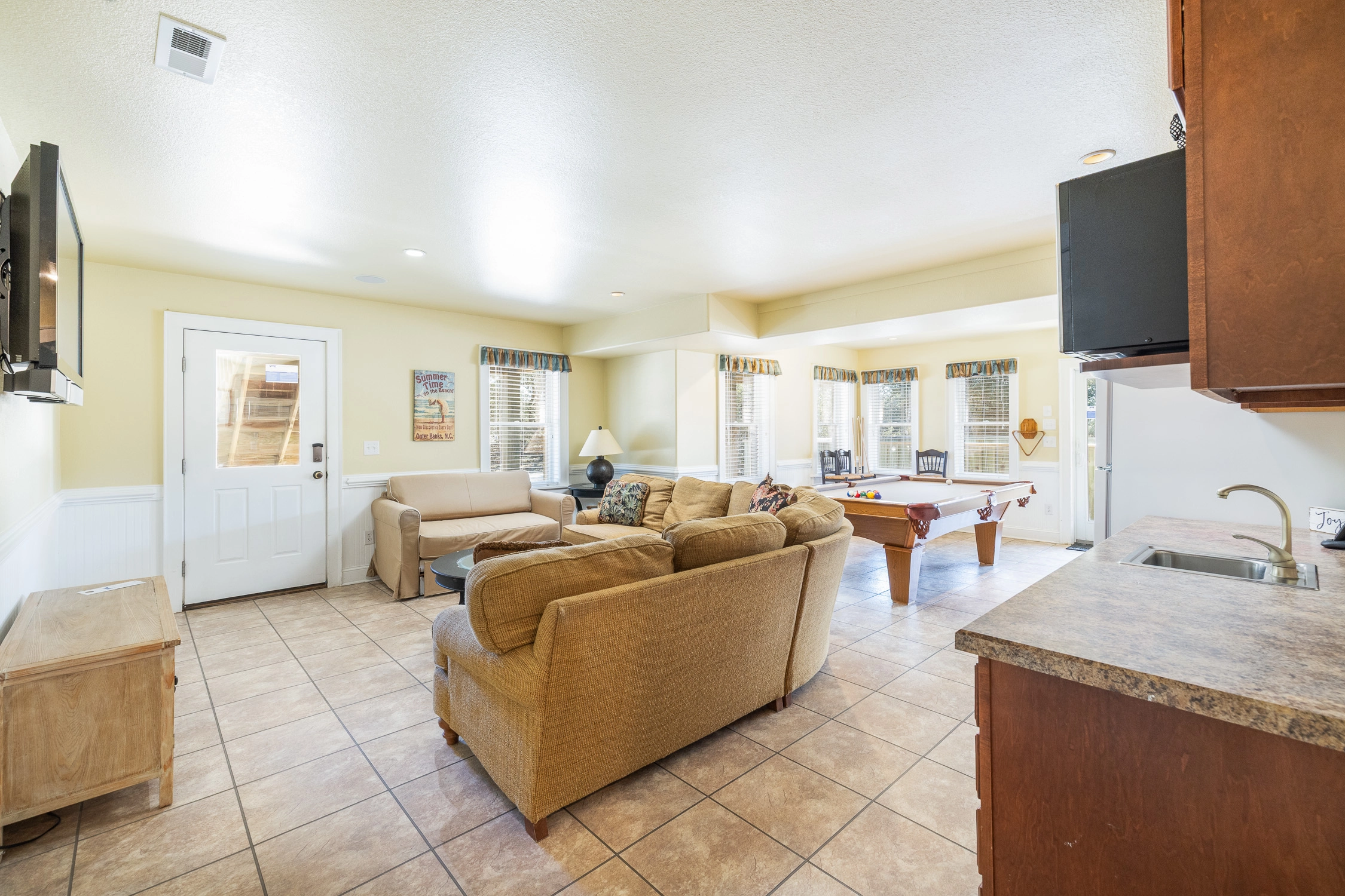 Multiple TVs, pool table.