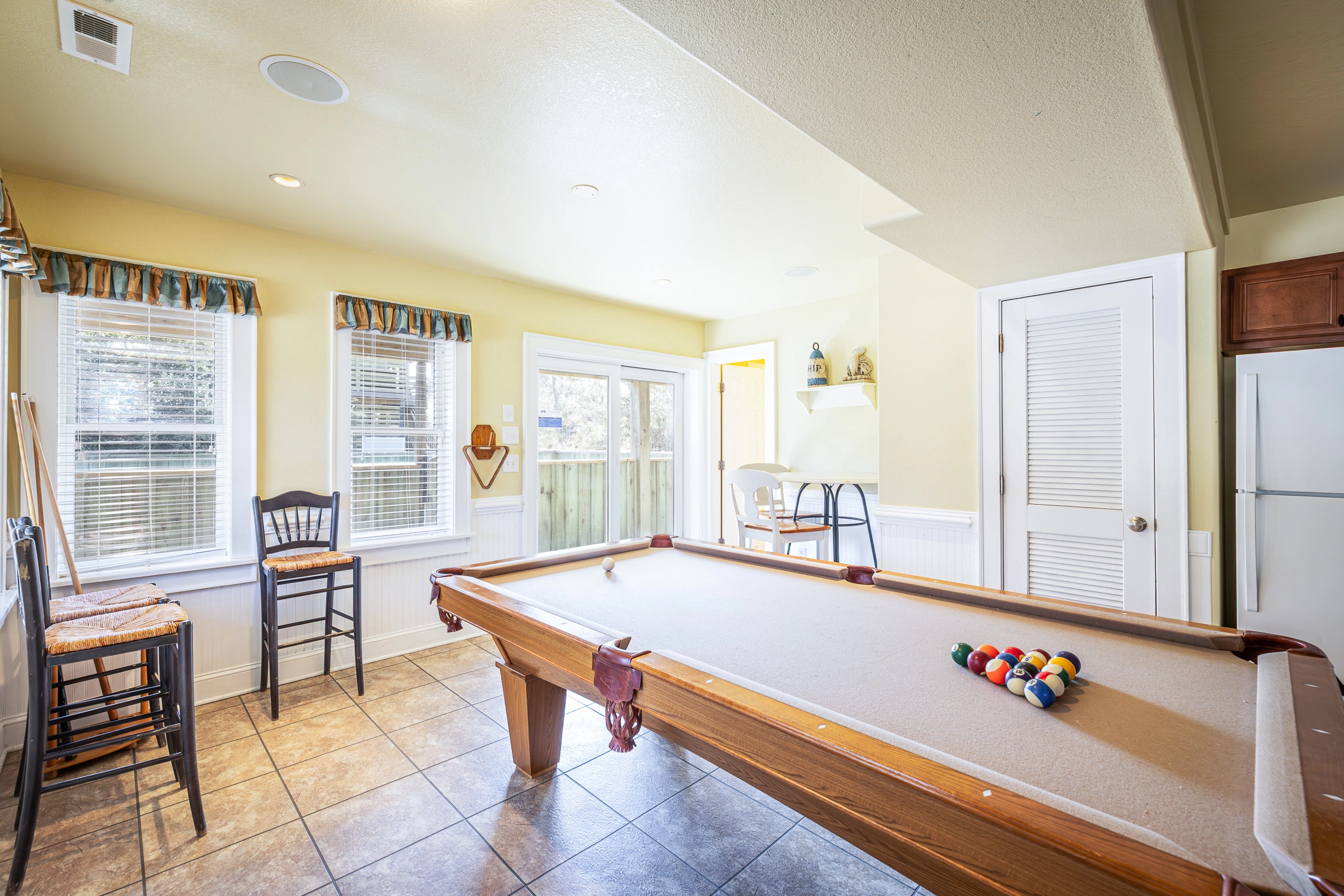 Rec room with pool table, refrigerator; access to hot tub and private pool; outside shower; garage.