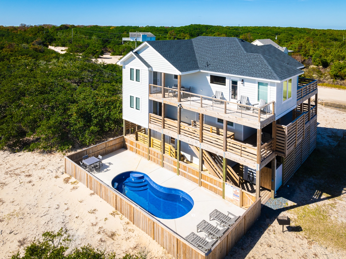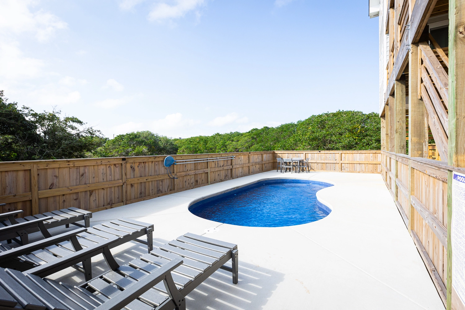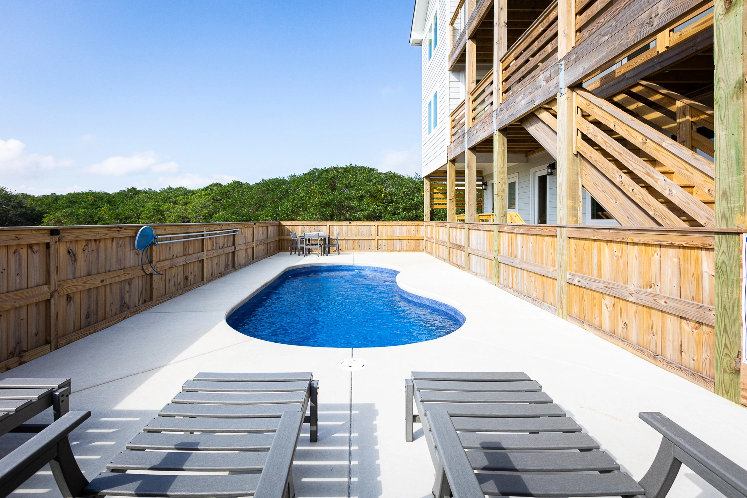 "This house was beautiful and very clean. The beds in all rooms were so comfortable and we loved that each bedroom had its own bathroom. The pool area was so nice, we enjoyed it every day. The beach is so close and we loved being able to drive our truck right to the ocean and set up easily each day. We had 3 young kids with us including a baby and they had a blast in the game room. We appreciated that a high chair was provided. It would be nice if the bedrooms had fans as it was very hot, as well as some umbrellas in the pool area to provide shade."