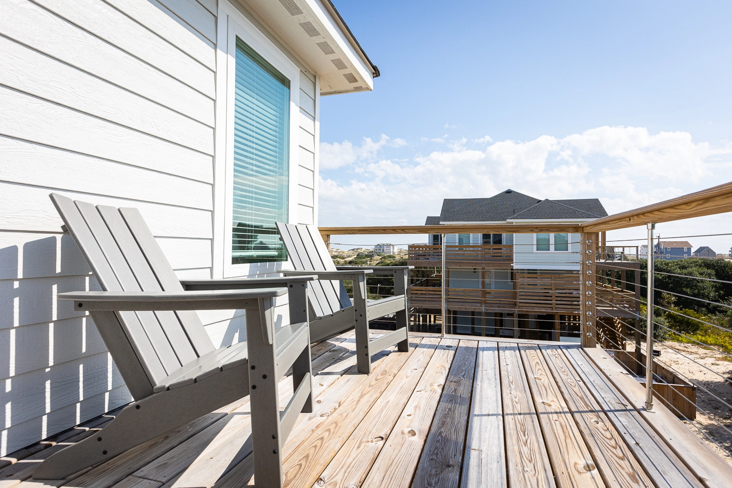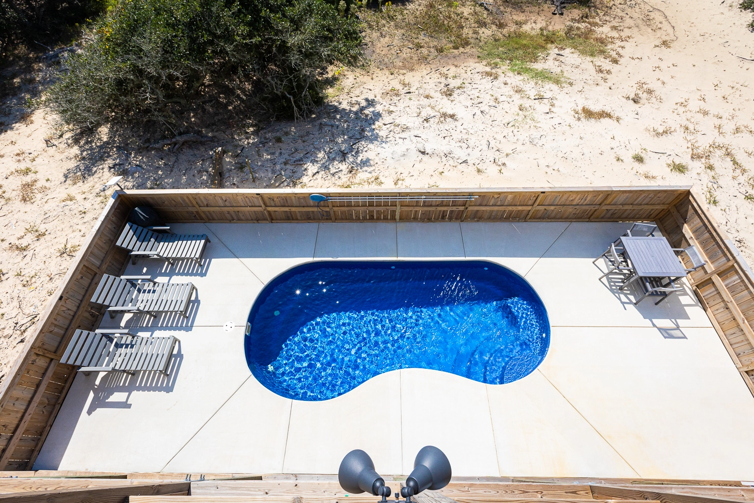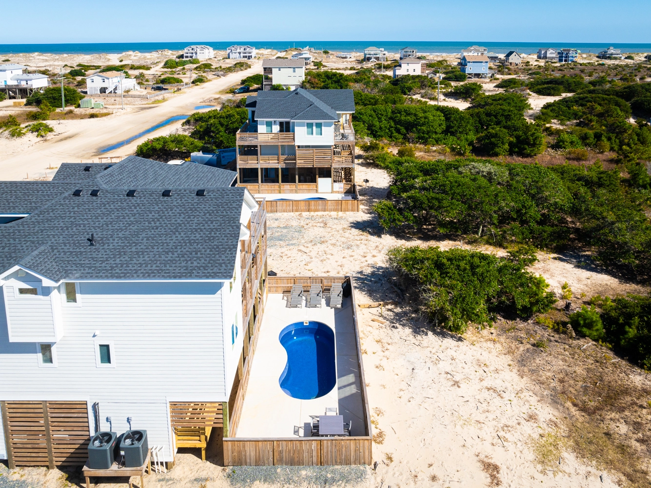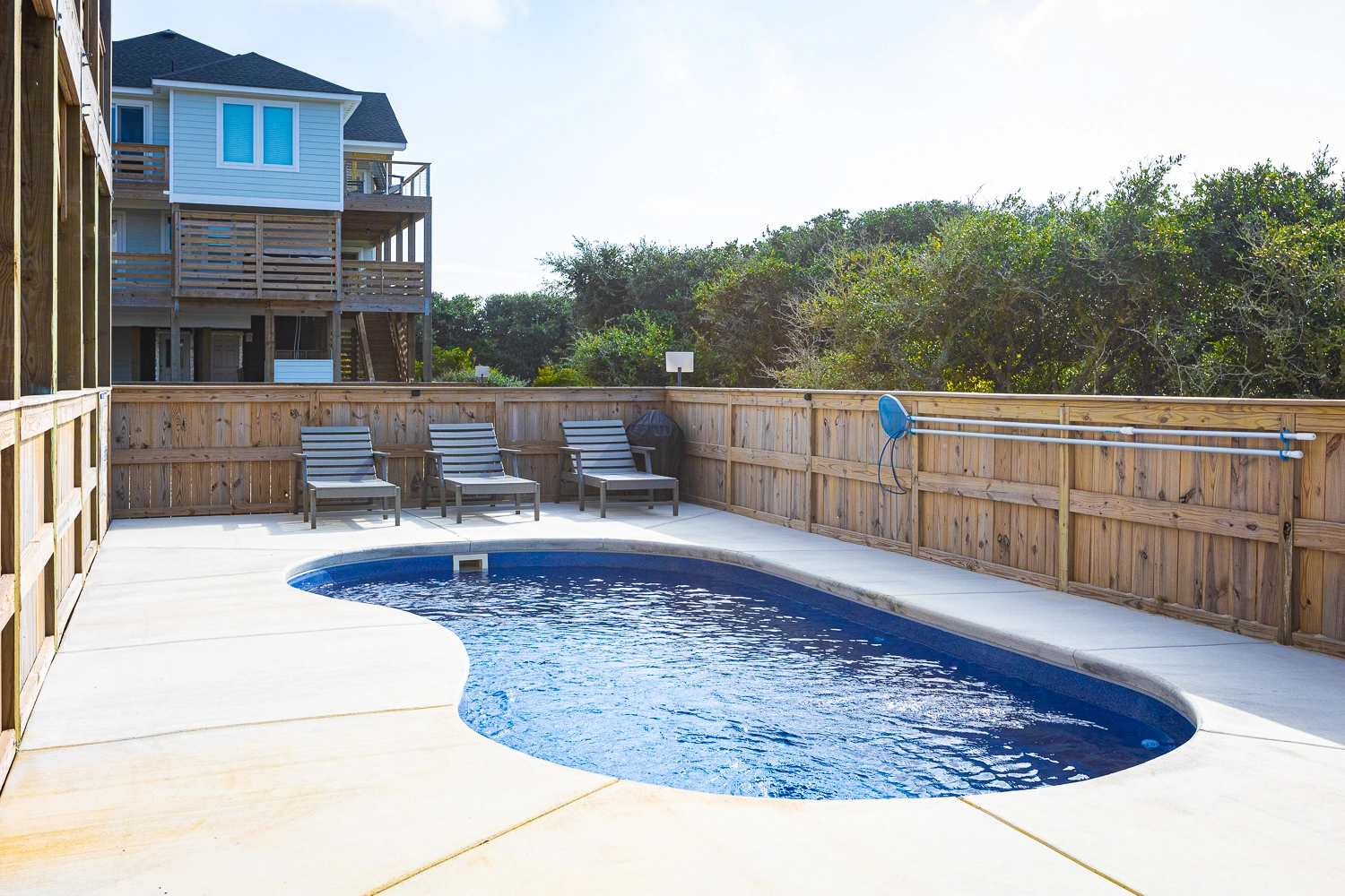 "This house was beautiful and very clean. The beds in all rooms were so comfortable and we loved that each bedroom had its own bathroom. The pool area was so nice, we enjoyed it every day. The beach is so close and we loved being able to drive our truck right to the ocean and set up easily each day. We had 3 young kids with us including a baby and they had a blast in the game room. We appreciated that a high chair was provided. It would be nice if the bedrooms had fans as it was very hot, as well as some umbrellas in the pool area to provide shade."