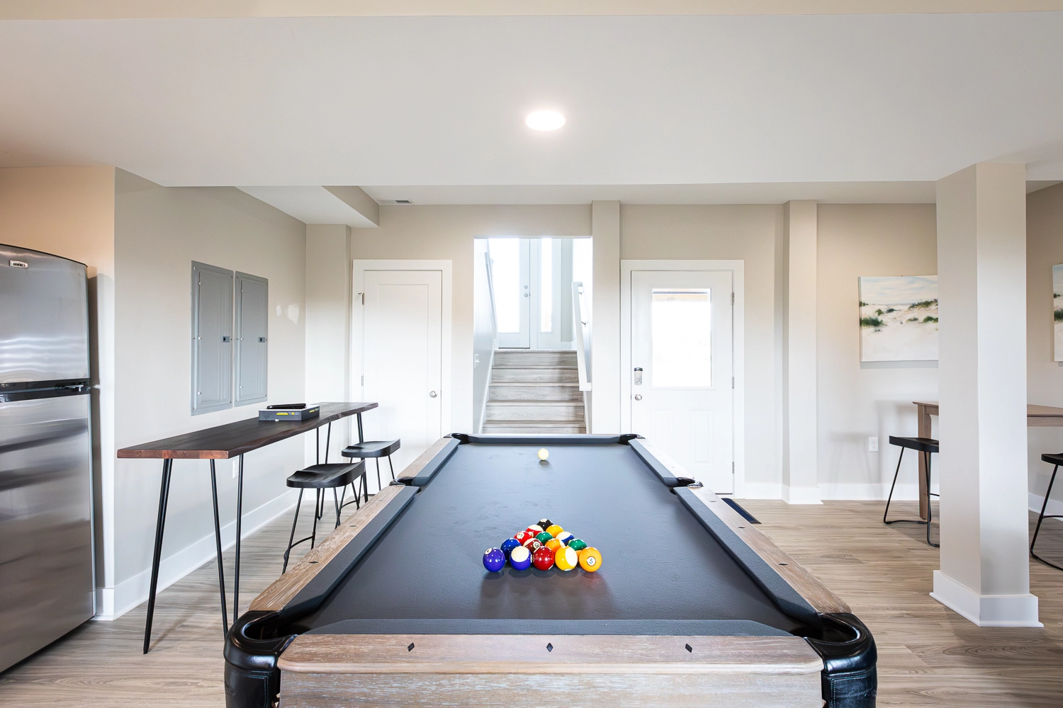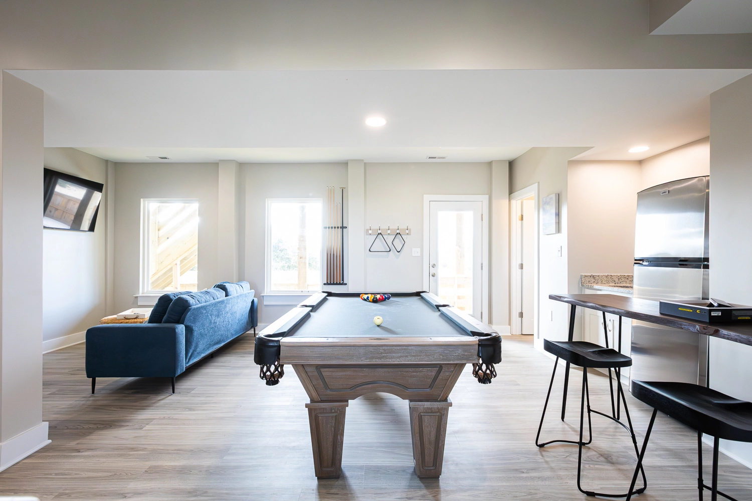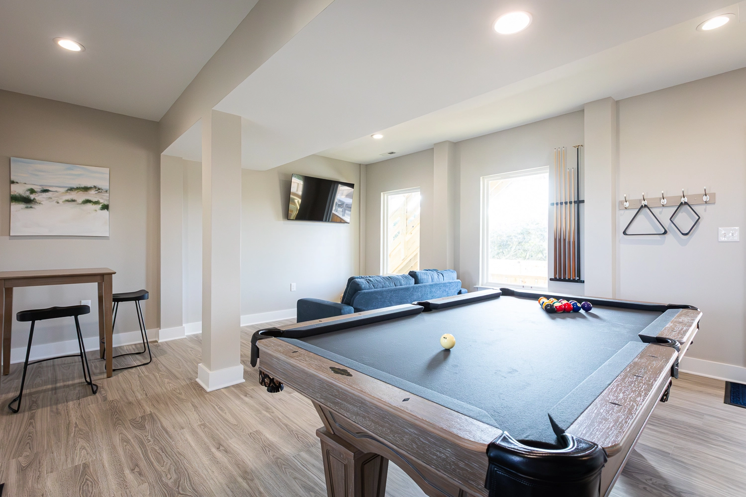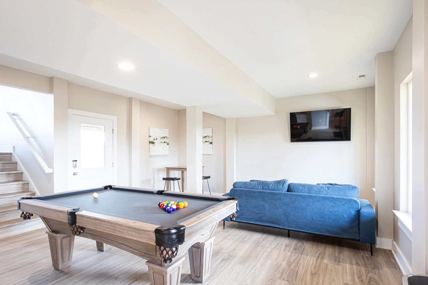 Entry; rec room with pool table and seating area with TV.
