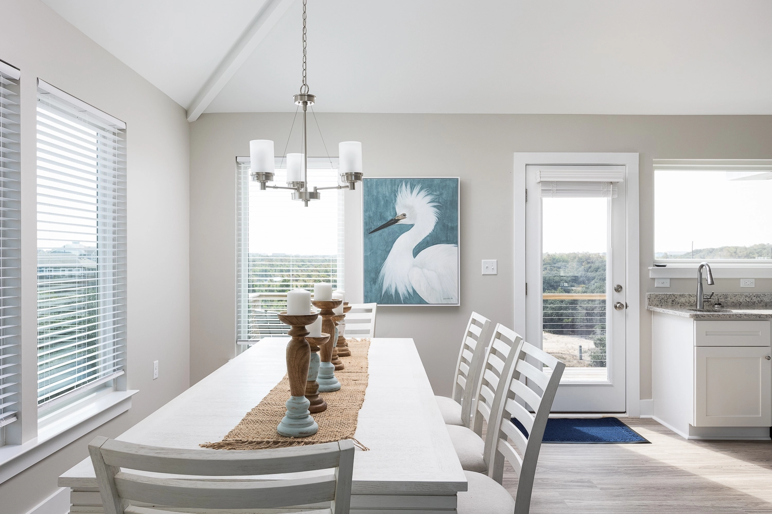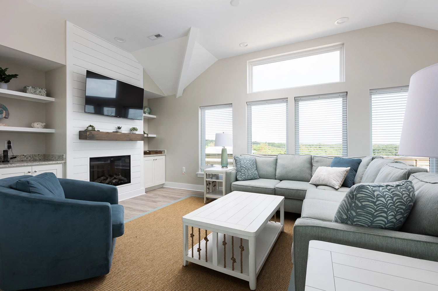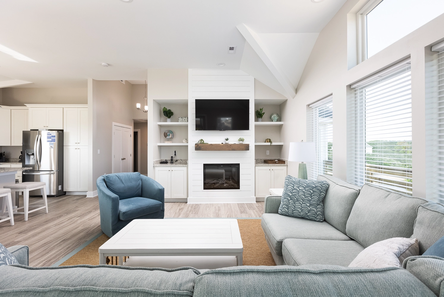 Great room with electric fireplace; kitchen; dining area; screened porch.