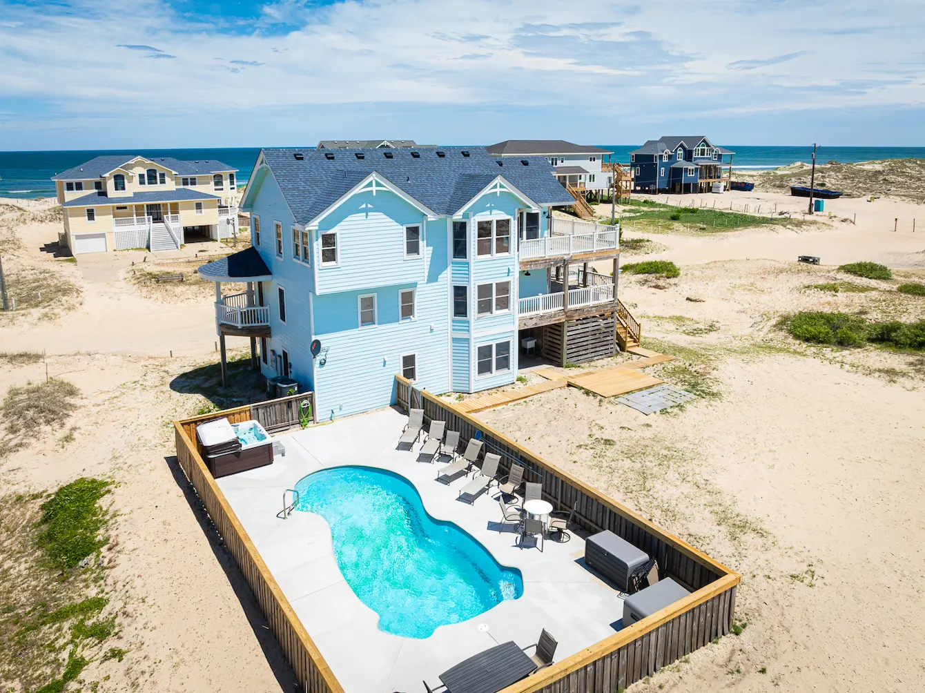 "Absolutely beautiful house! Great location to see the ocean from the deck. Get to see wild horses next to the pool and porch area everyday! Pool area great for kids when done at the beach for the day. Hot tub is so relaxing at night. Very relaxing and calming place. Would definitely stay in the house again!!"