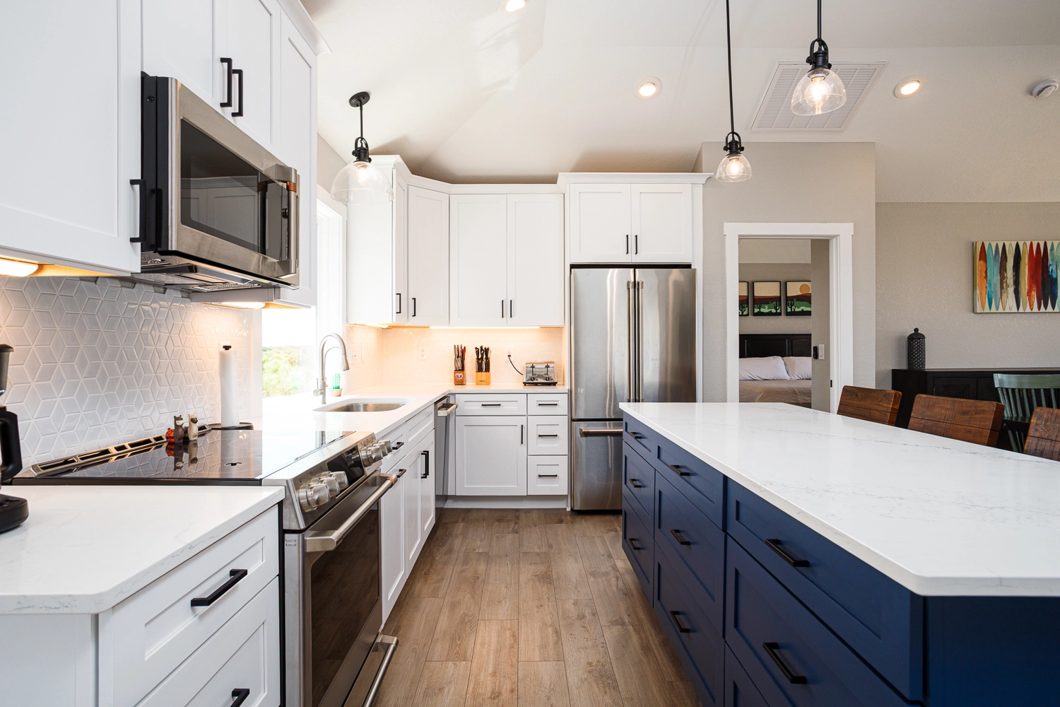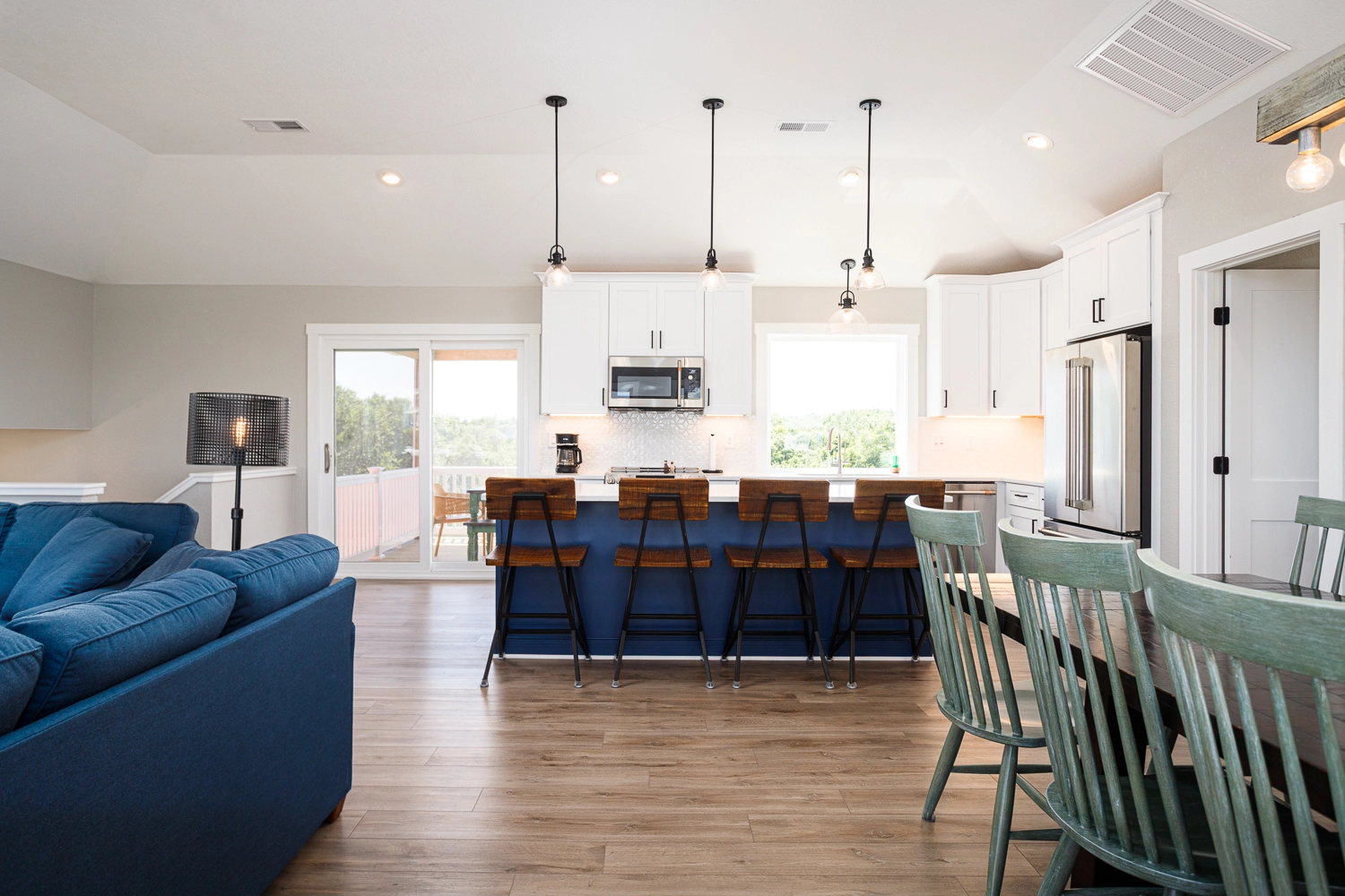 Great room; kitchen; dining area; screened porch.