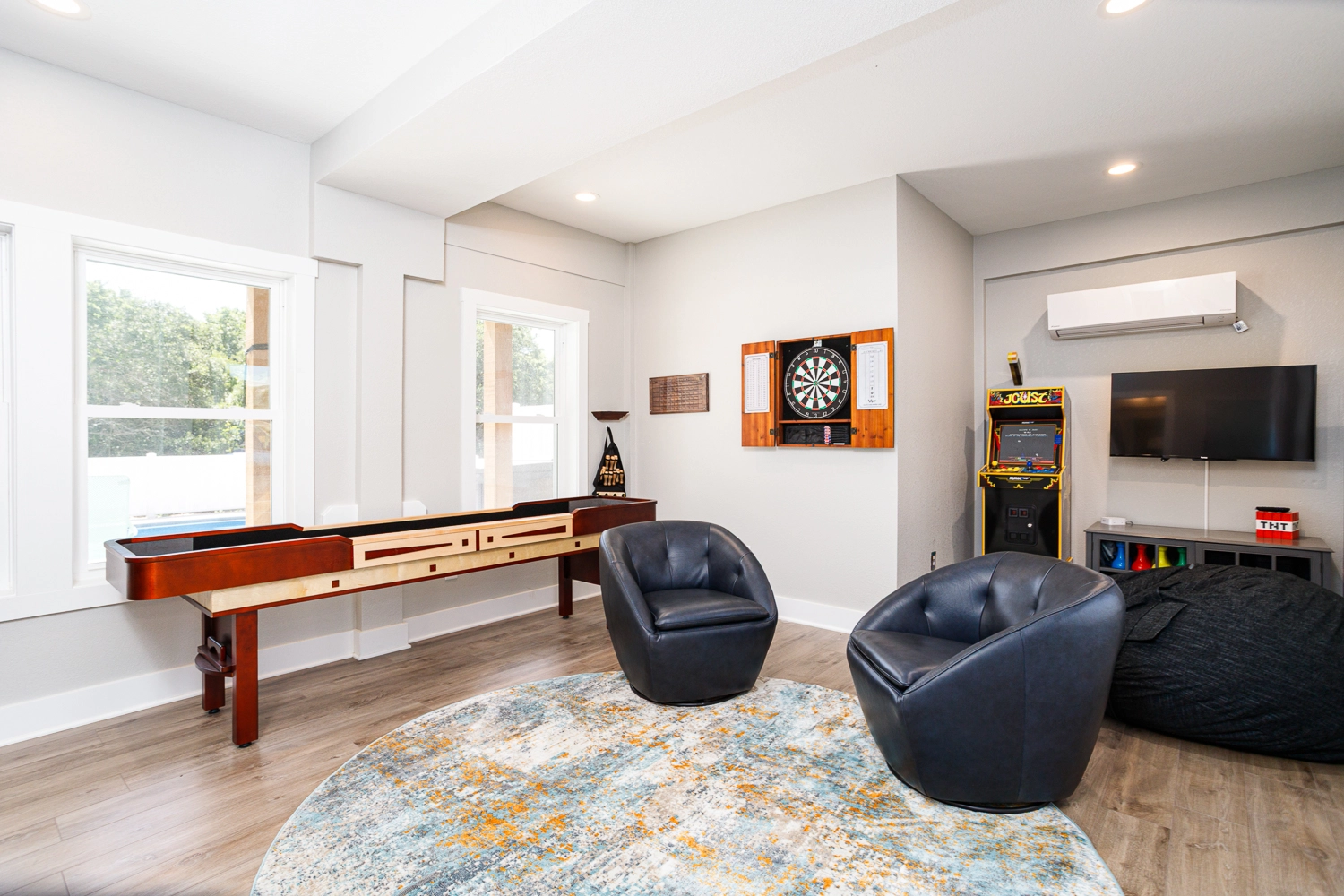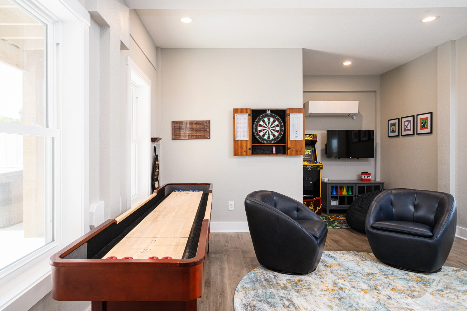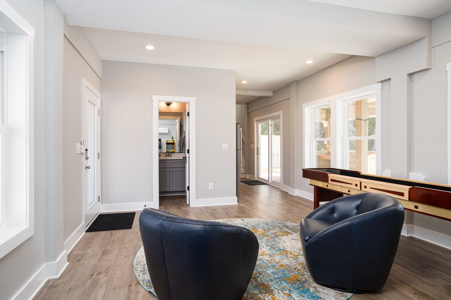 Rec room with arcade game, and wet bar; access to private pool and outside Half Bath.