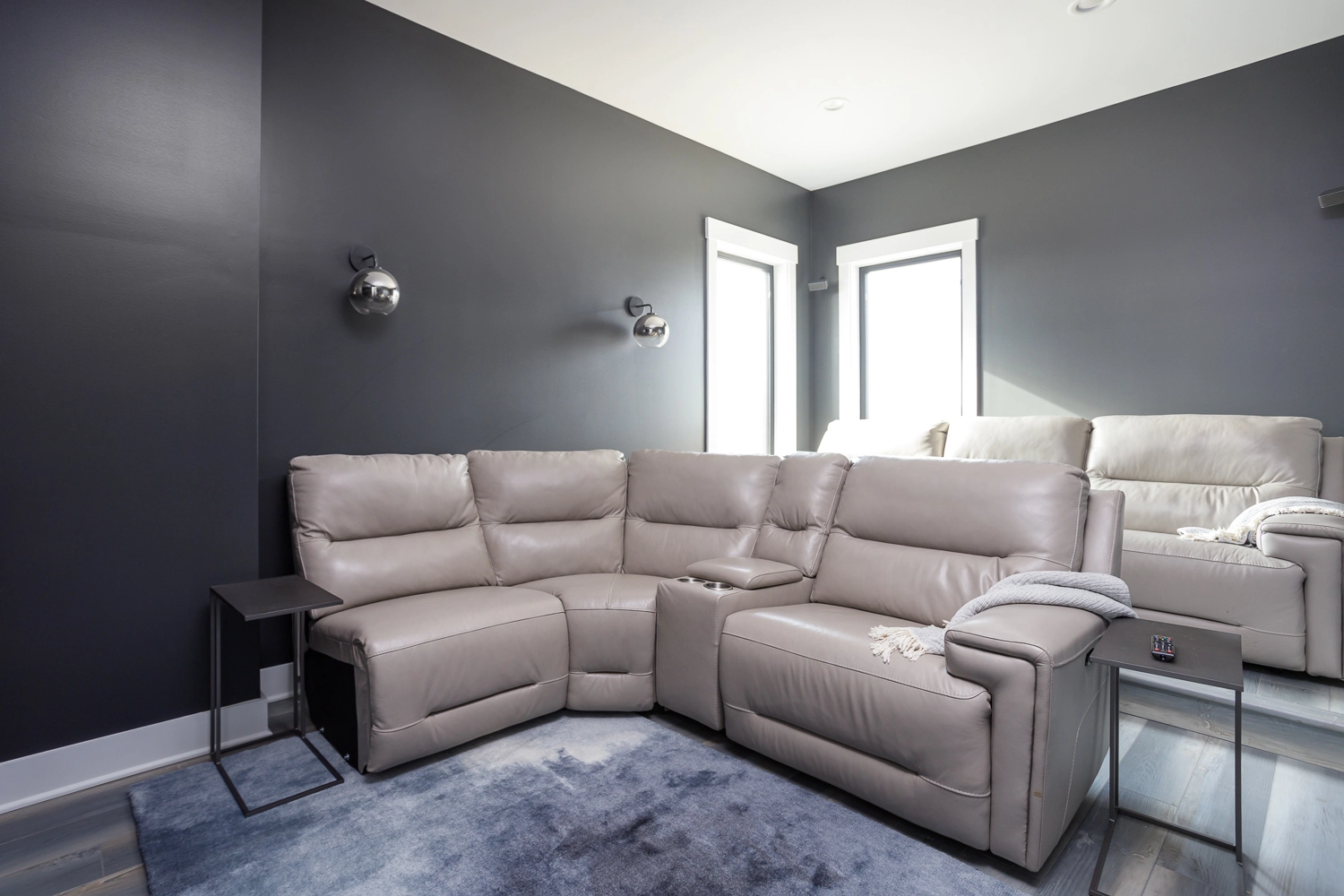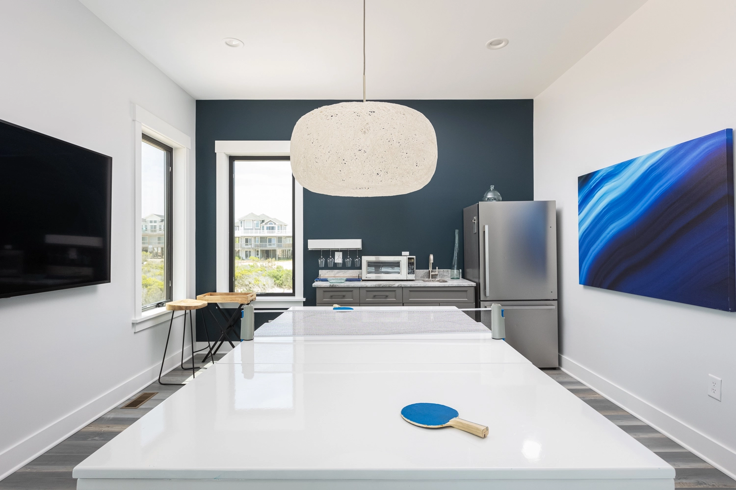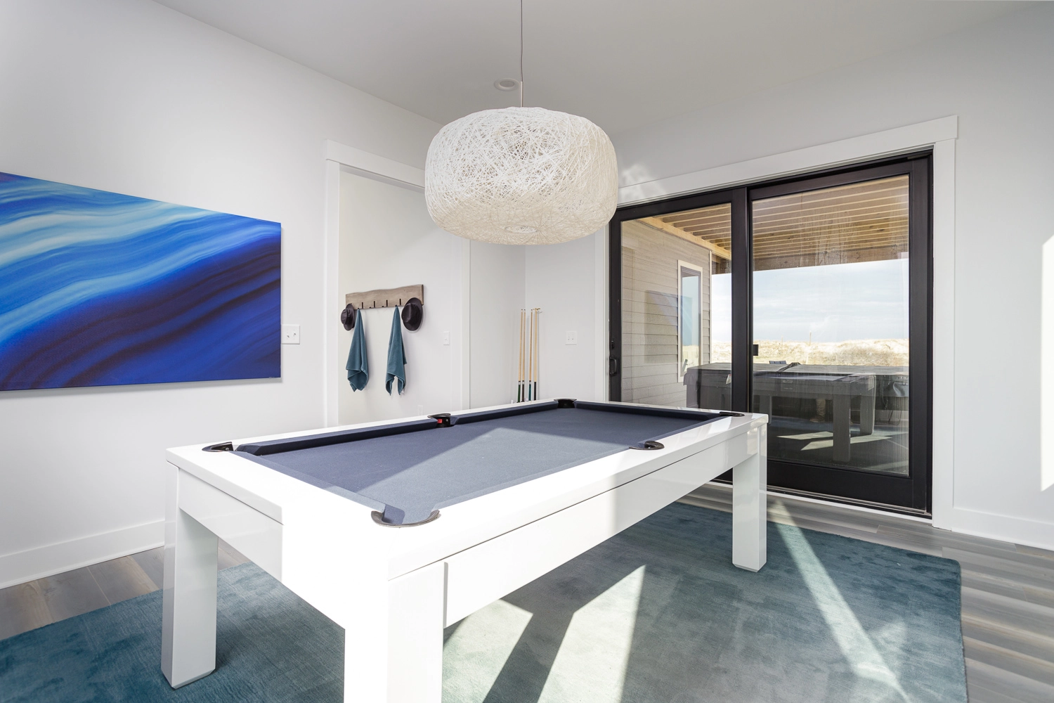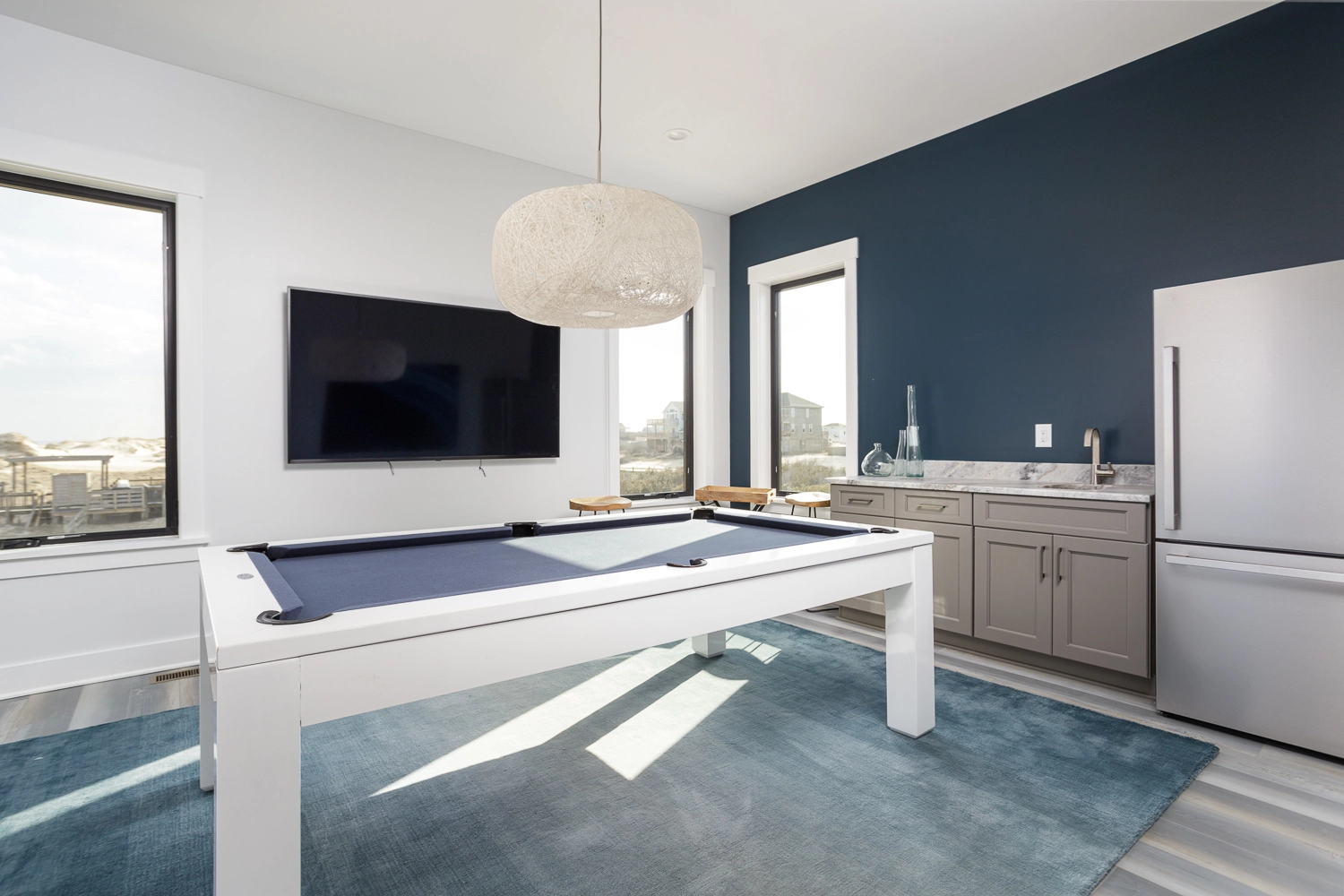 Rec room with pool table, ping pong table topper, wet bar, and refrigerator; theater room; sitting area with coffee bar and wine refrigerator.