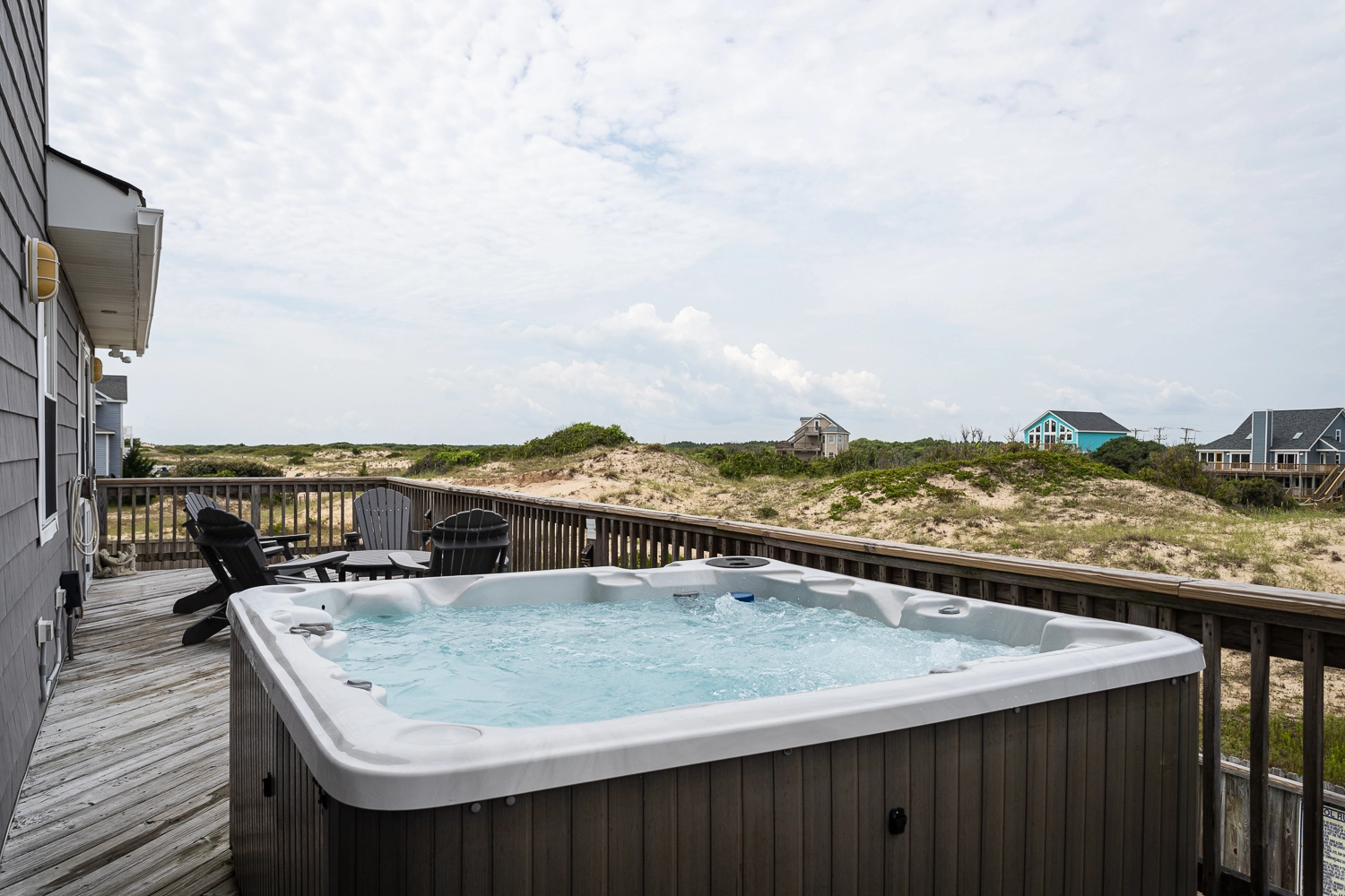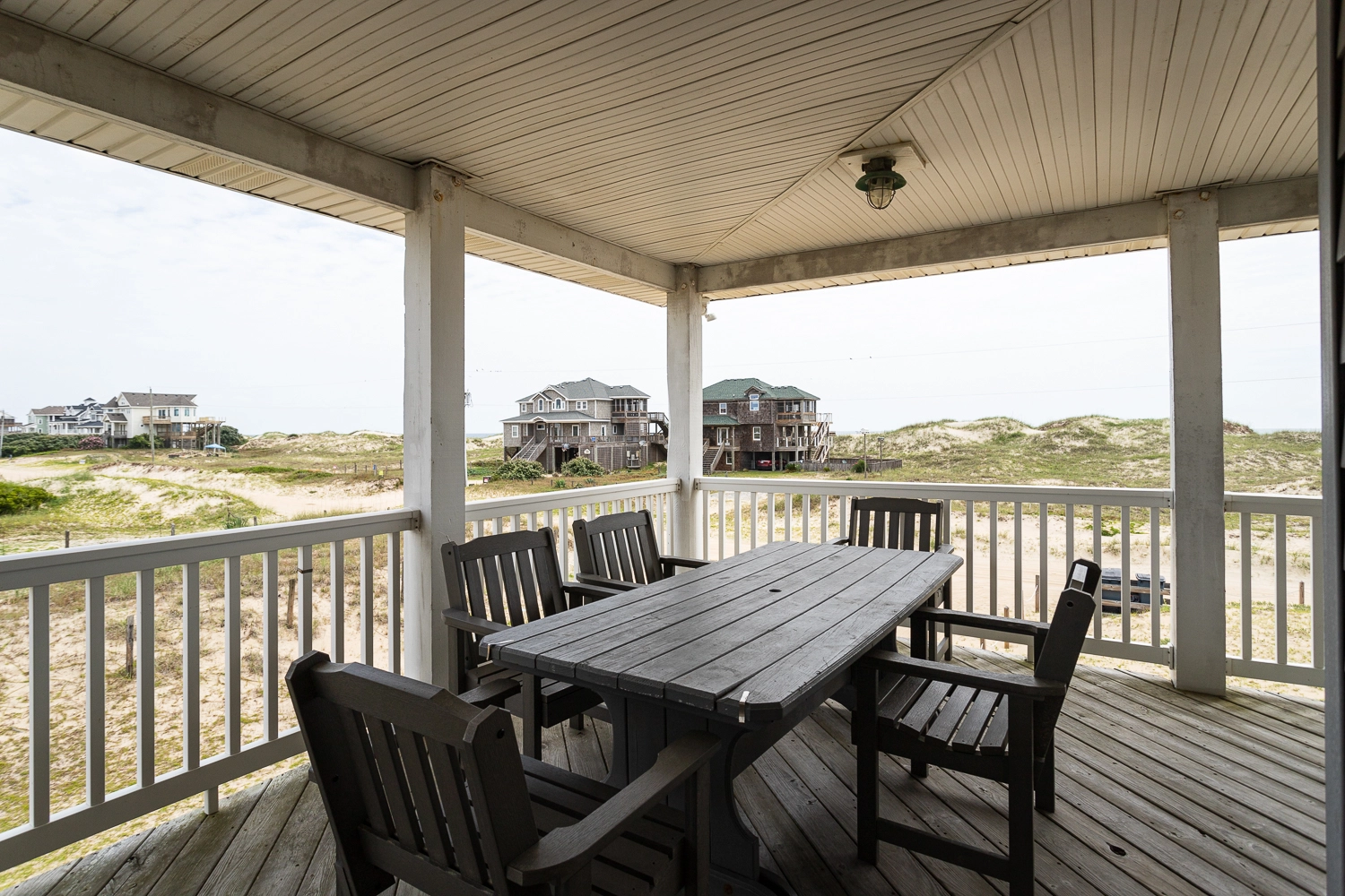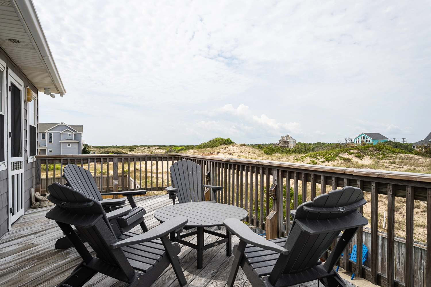 "We thoroughly enjoyed our week at this home. The home was beautiful, had everything you could want or need and was well maintained. The outdoor showers had hot water and made cleaning off from the beach easy and convenient. The pool was clean, comfortable and includes a nice area for sitting and enjoying drinks or snacks. The home was spacious and offered incredible views of the ocean and the sunrises and sunsets. We ate dinner outside on the porch every night and watched the horses roam through the yard. The rocking chairs out front were a great place to sit and enjoy your morning coffee or a good book on a rainy afternoon. The kitchen was well equipped with everything you could need and it was good quality, which makes a difference. The beds were very comfortable and the linens were a nice quality as well. If you rent this home, you will not be disappointed!"