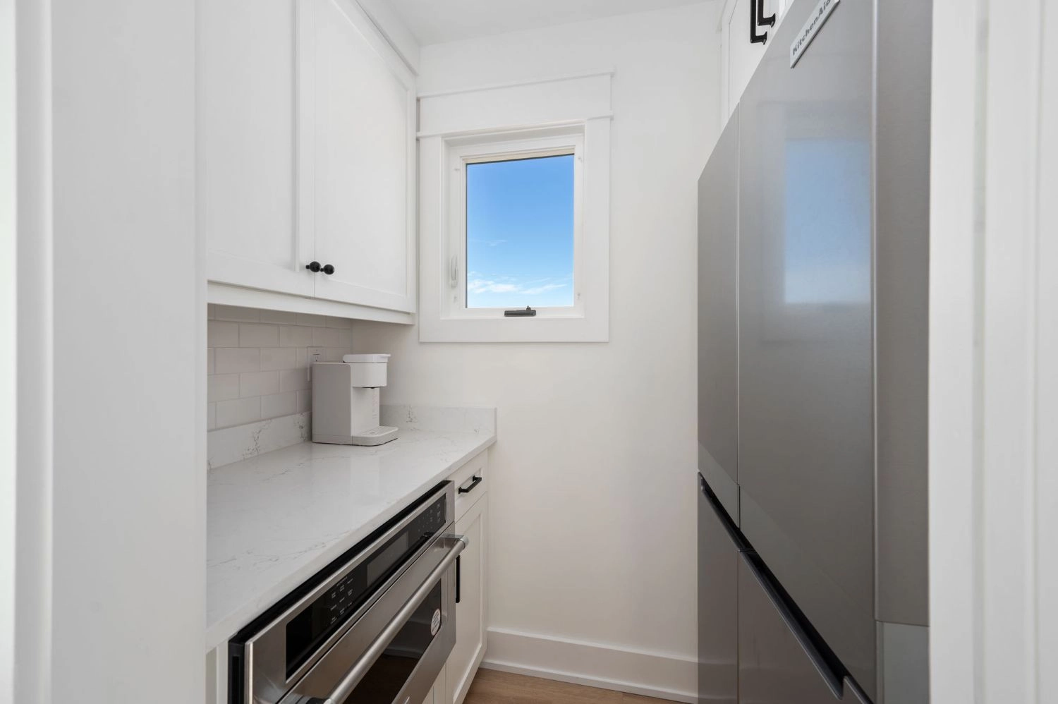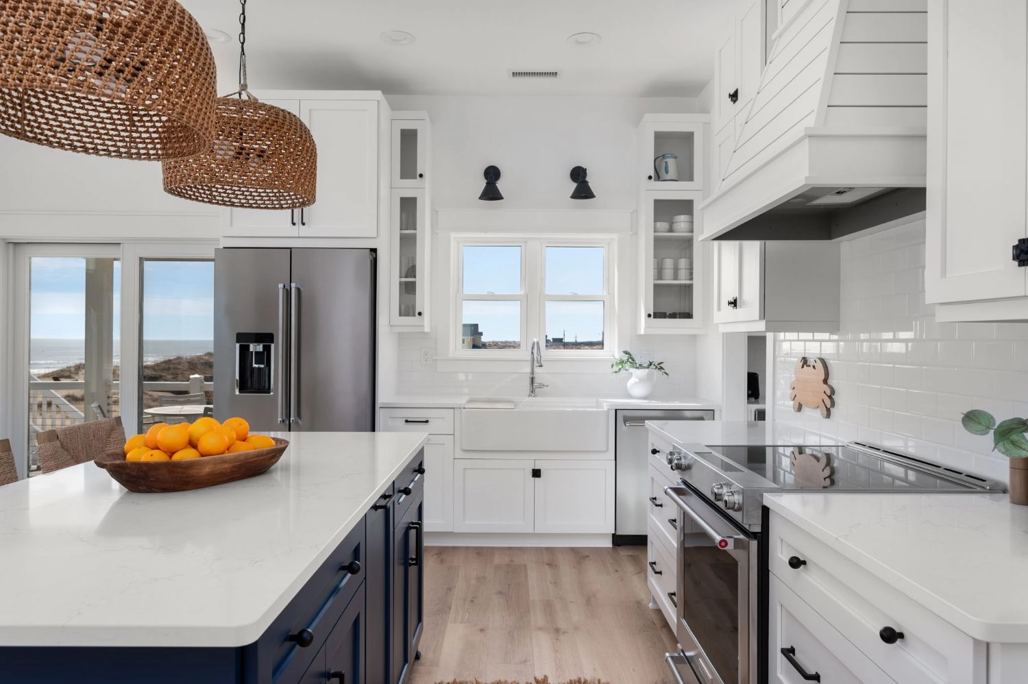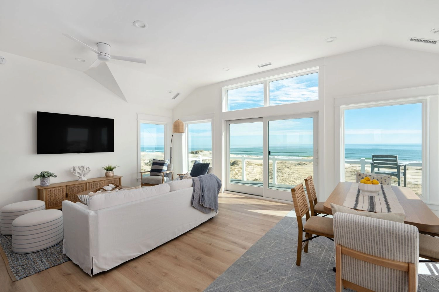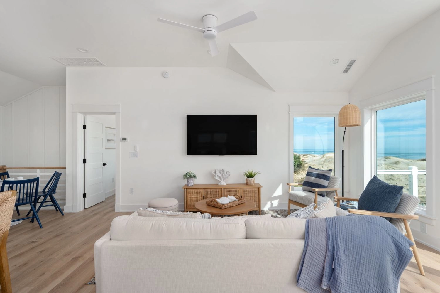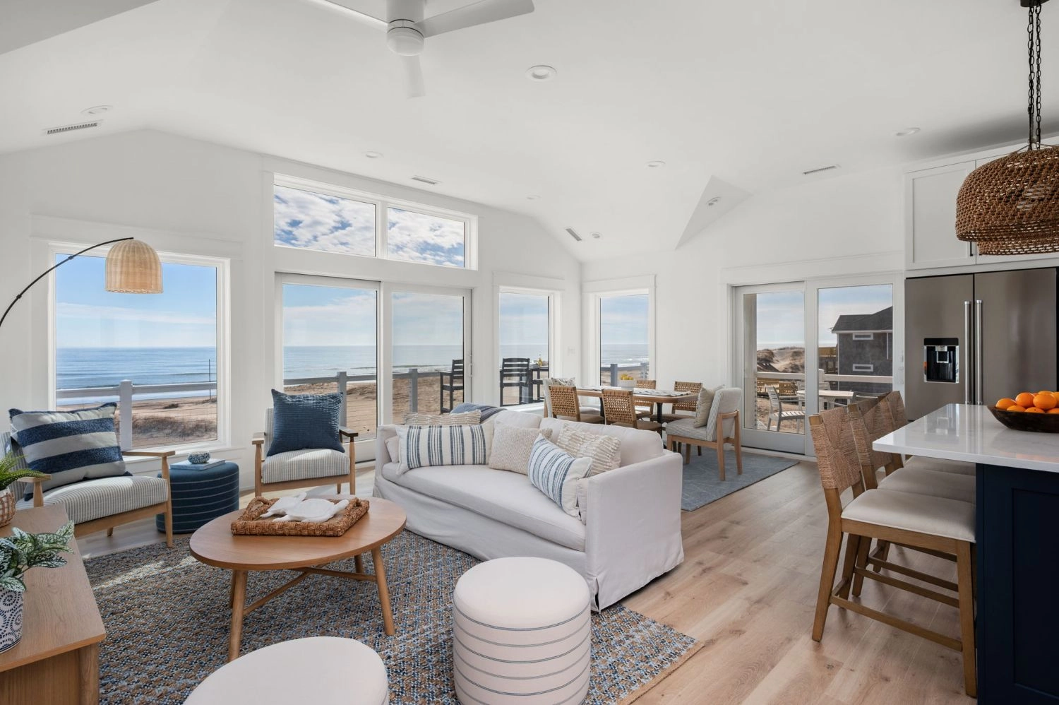 Great room; kitchen with two refrigerators; dining area.