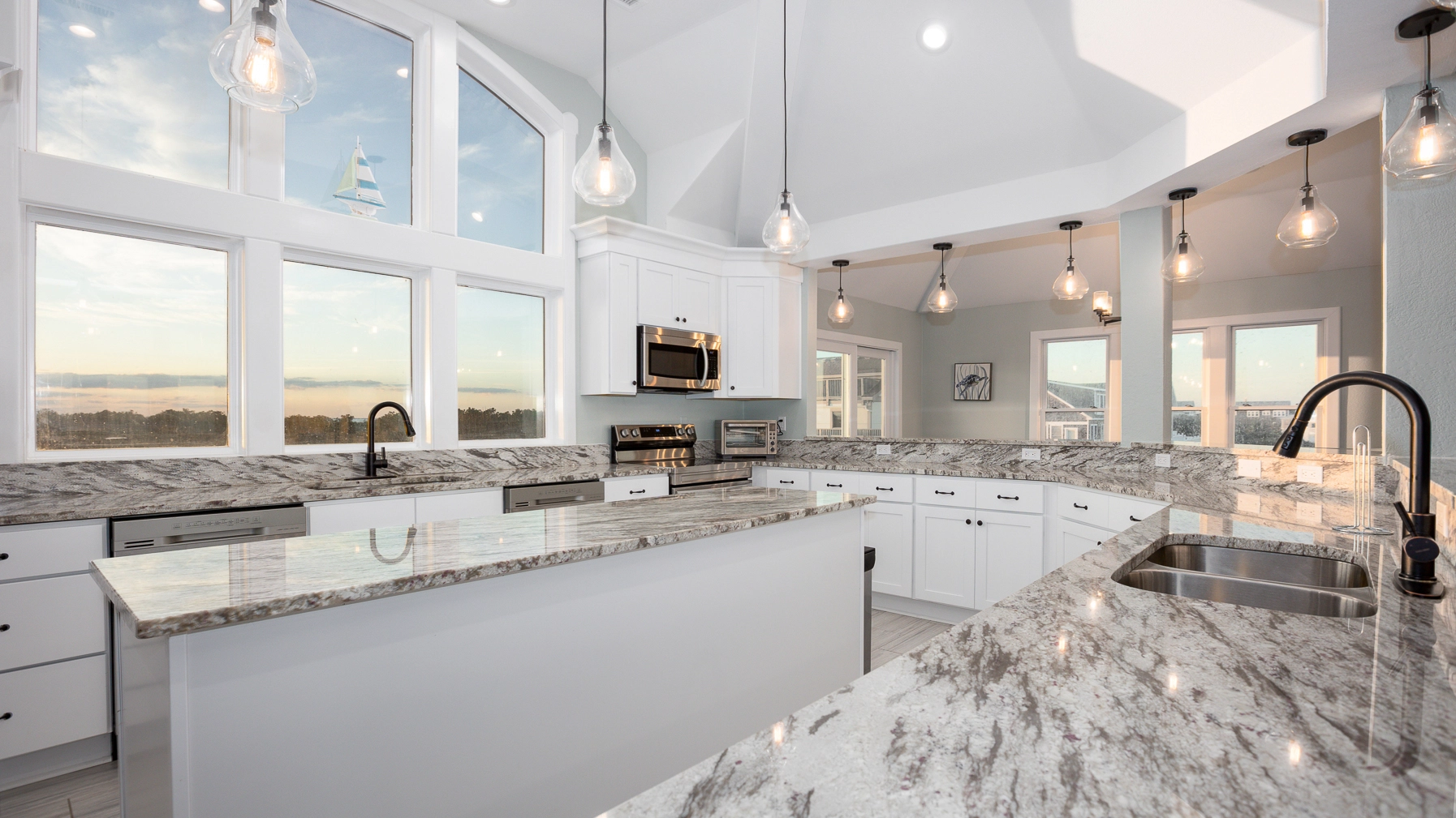 Great room; kitchen with granite countertops, two refrigerators, two electric ranges and two dishwashers; dining area.