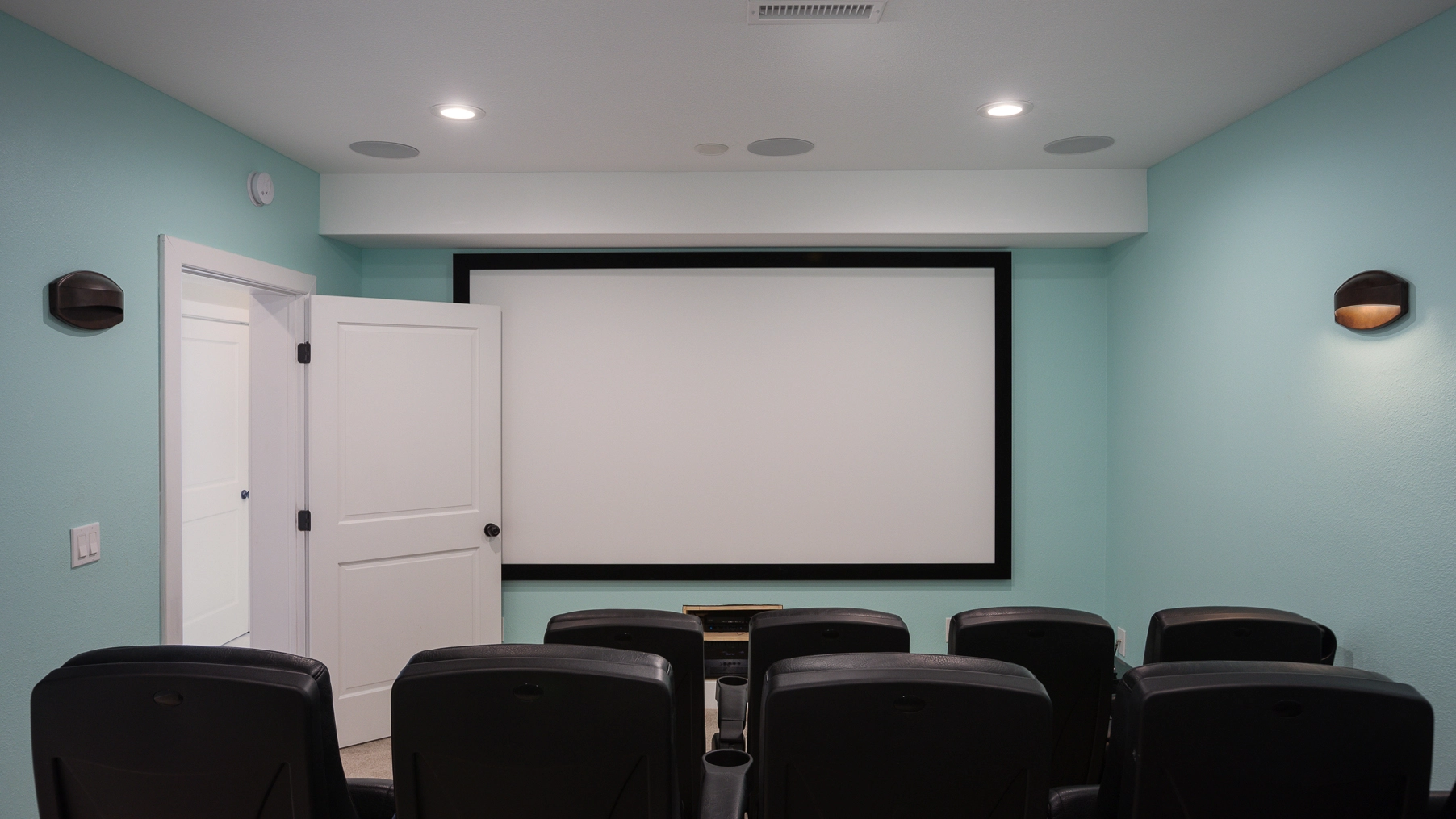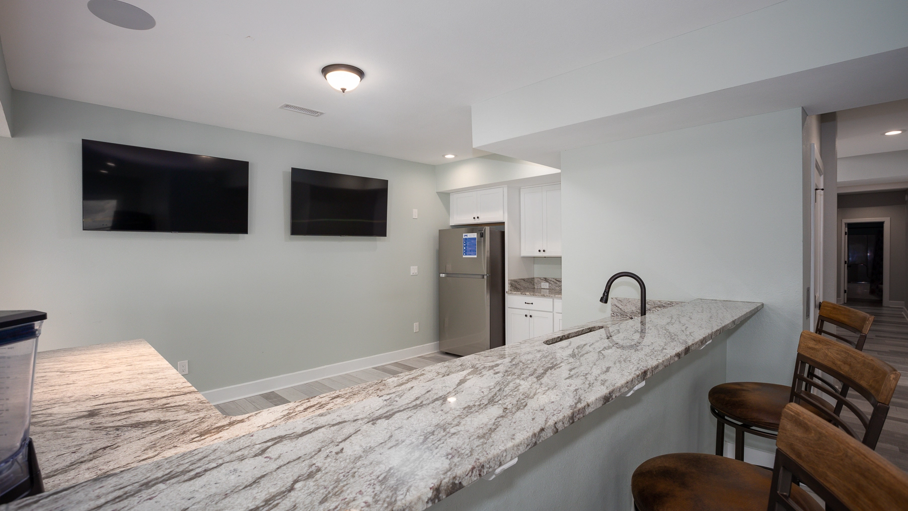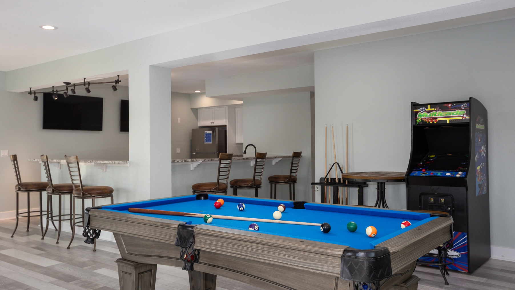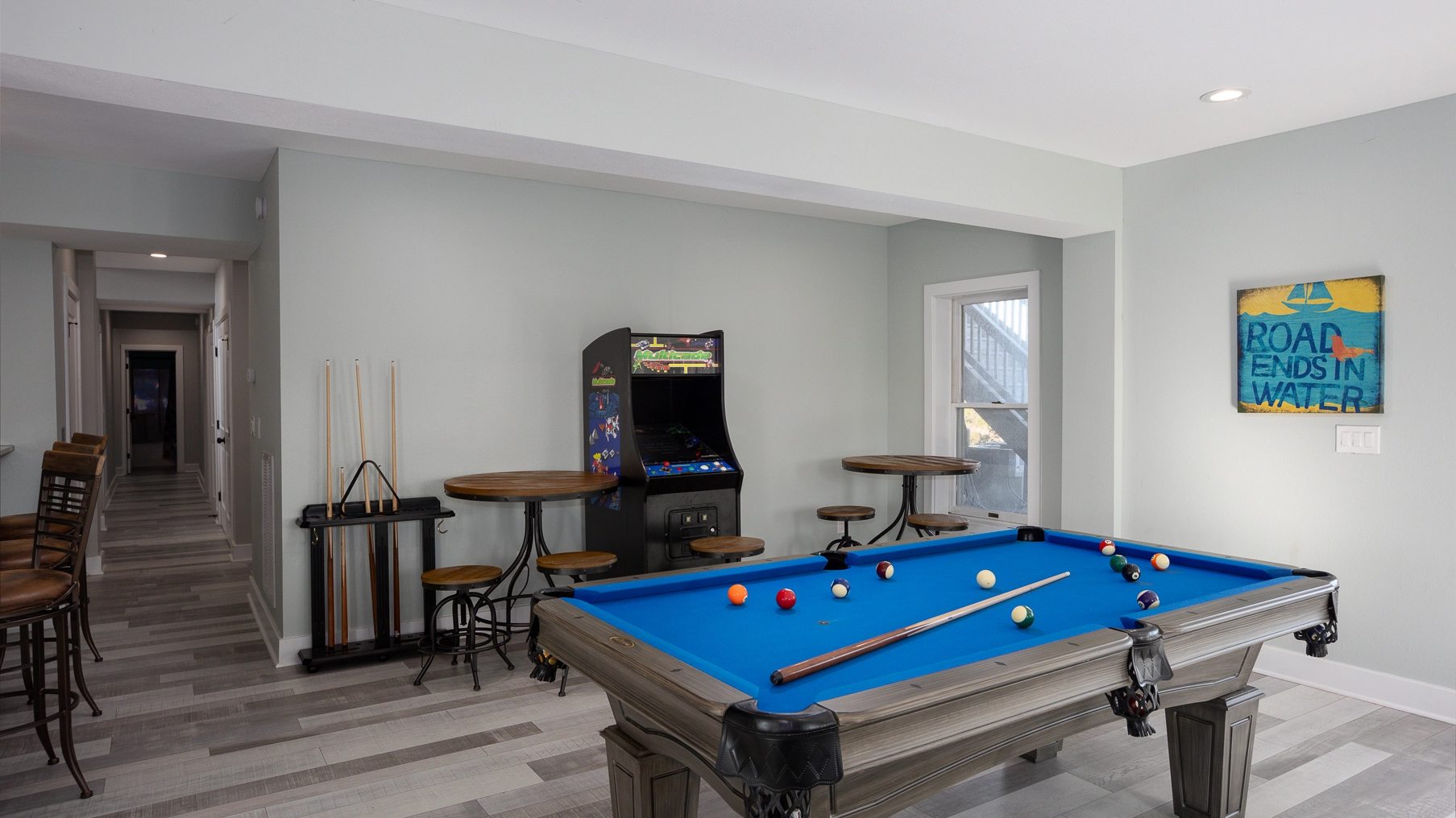 Rec room with sports bar, pool table, and arcade game; theater room; laundry.