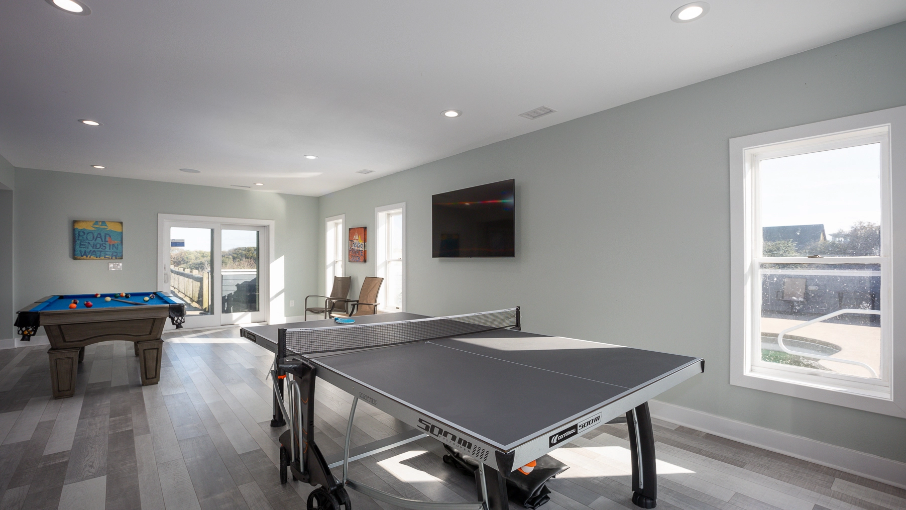 "The house exudes beauty with a well-curated internal color palette adorning the walls and furniture, presenting a tasteful and aesthetically pleasing environment. The rec room boasts high-quality games, featuring a well-maintained ping pong table, pool table, and an impressive arcade cabinet with a variety of classic games. The house welcomed us with cleanliness upon arrival, and the views are breathtaking, offering ample windows overlooking the beach and front-facing vistas that showcase stunning sunsets. The catwalk provides a convenient pathway to access the beach, while the elevator proves beneficial for those with mobility challenges, facilitating the transport of bags upstairs. The spacious driveway accommodates at least six cars comfortably, though some may be blocked in. The beds are invitingly comfortable, adorned with plenty of pillows and cozy, insulated blankets. The kitchens stand out with their excellence, particularly the main kitchen equipped with two fridges, microwaves, dishwashers, sinks, and a wine fridge, all in impeccable condition. High-quality installed speakers contribute to a great atmosphere, creating a delightful ambiance when connected to and playing music. The wood flooring adds to the overall appeal, and there is ample seating on both the top and middle floors, making it ideal for accommodating many people. The theatre room is a standout feature, although some instructions on its usage would be a welcome addition. Overall, the house provided a wonderful setting, perfect for creating cherished memories with family and friends."