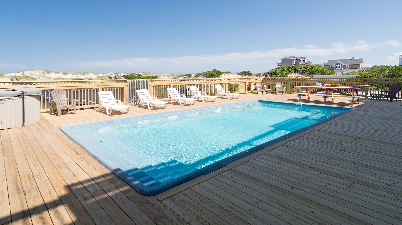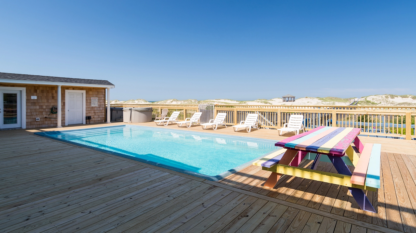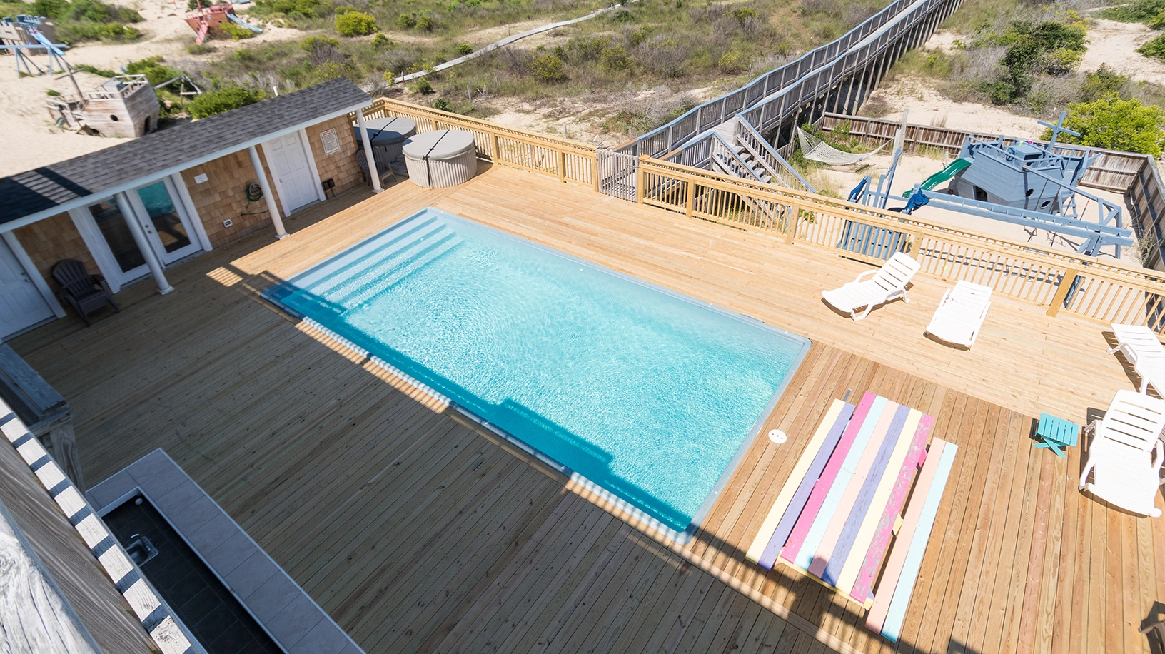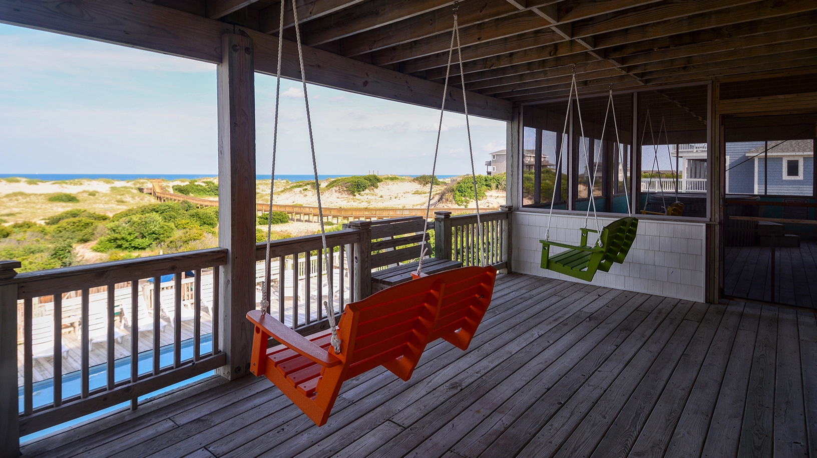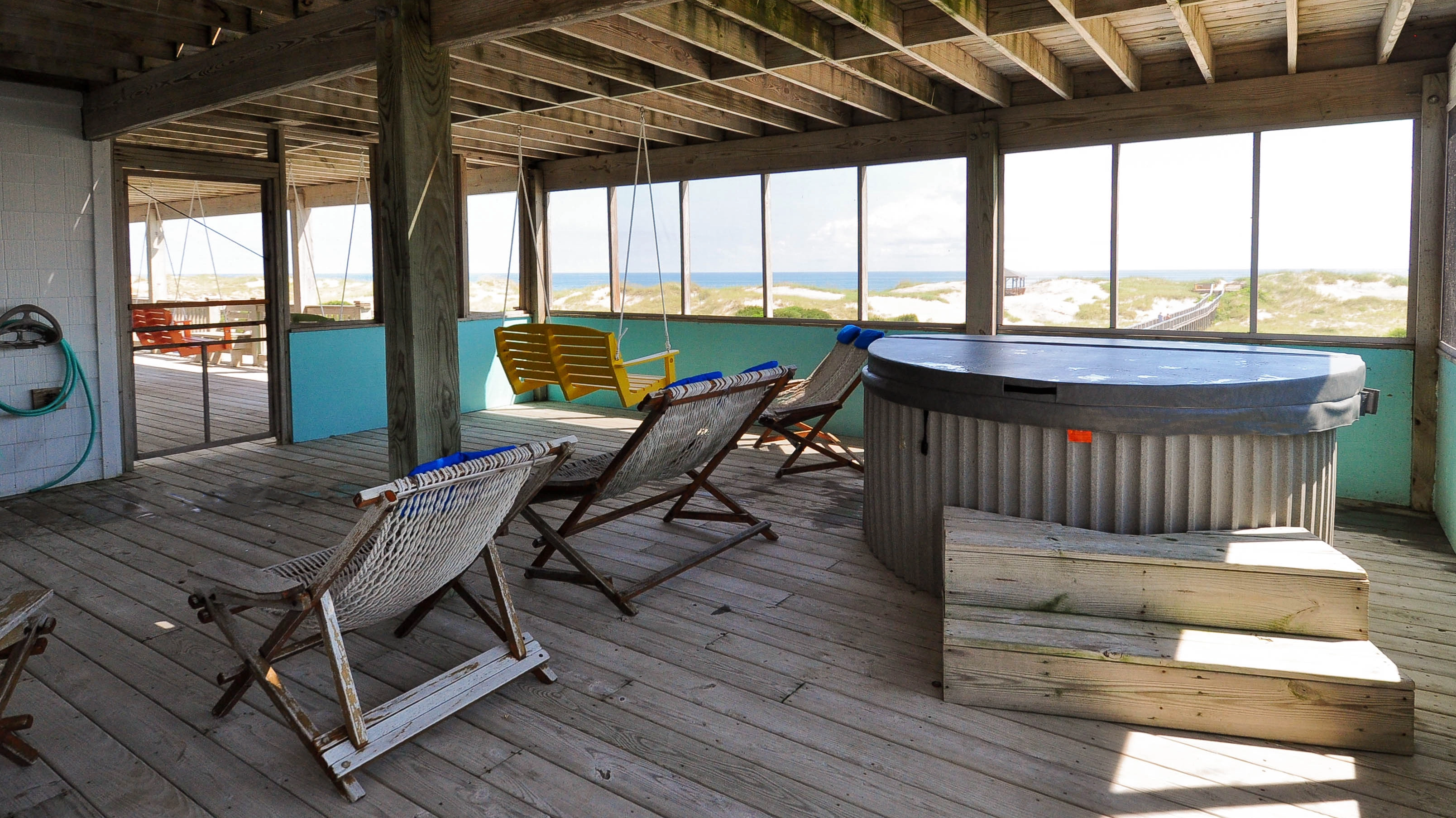 "Pool deck area was great. Lots of room, huge pool, porch swings, hot tub, poolhouse with fridge, sink & bathroom. Screened in porch off second floor master was nice."