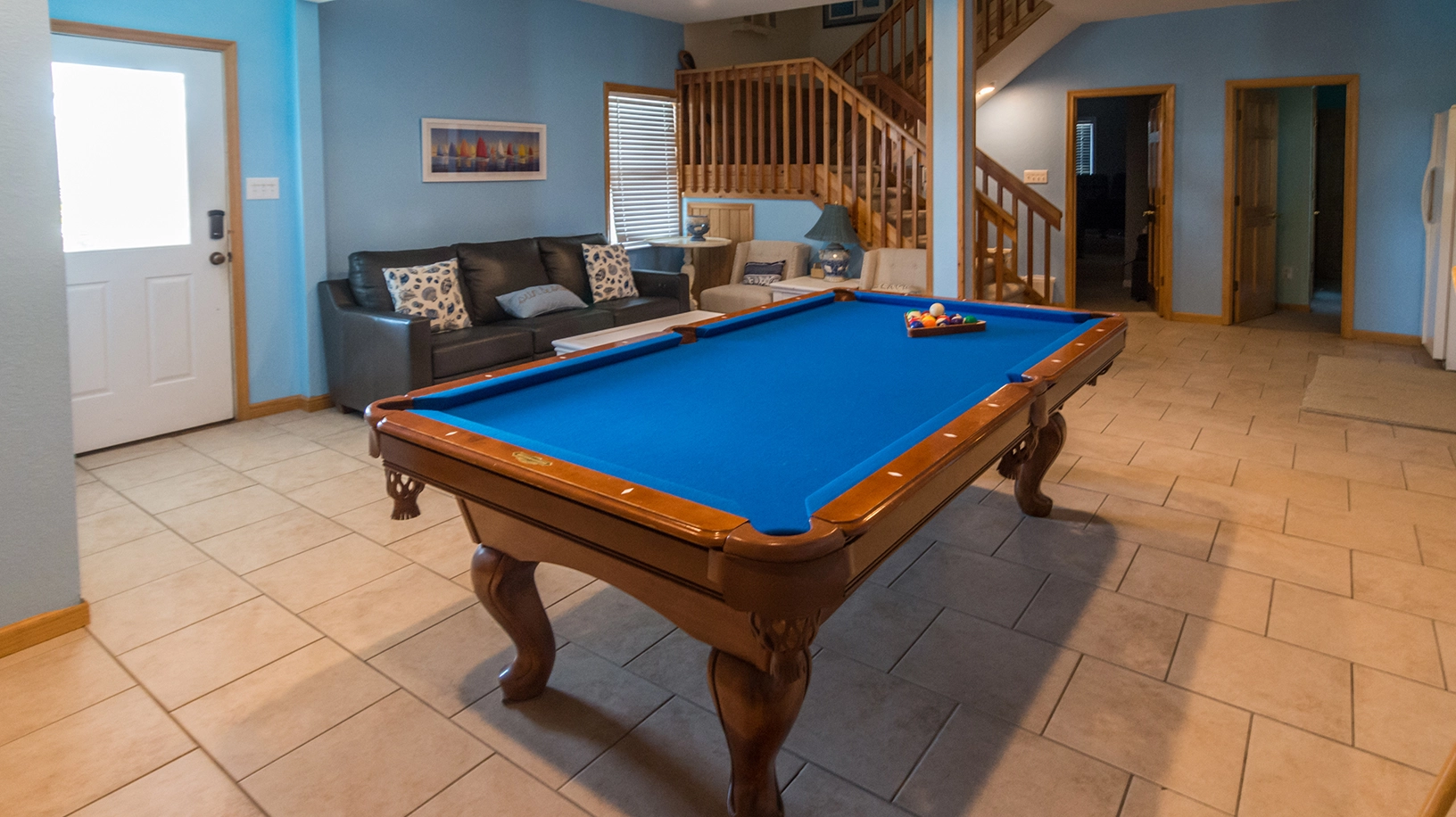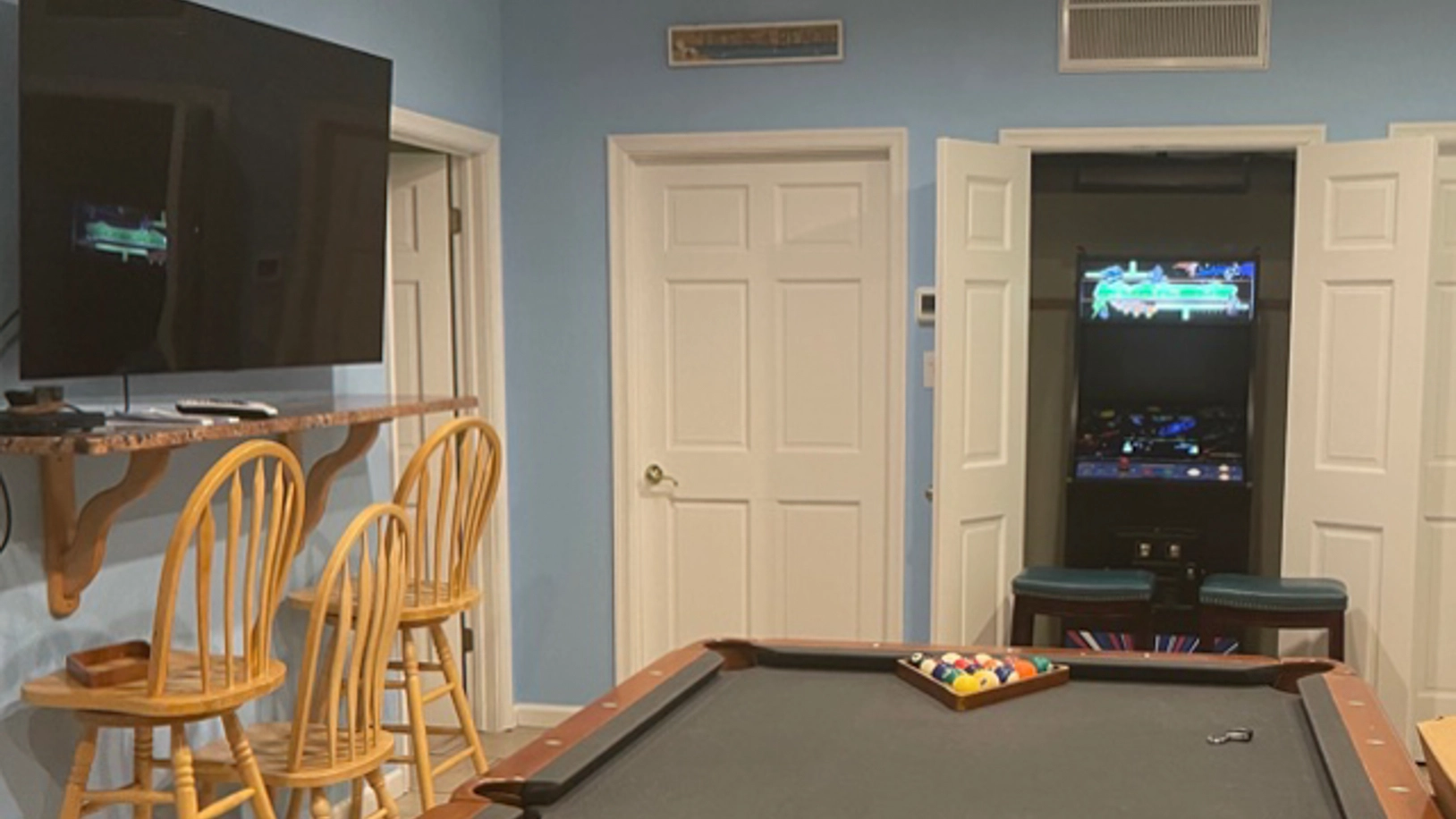 Rec room with pool table, arcade game, and kitchenette; theater room.