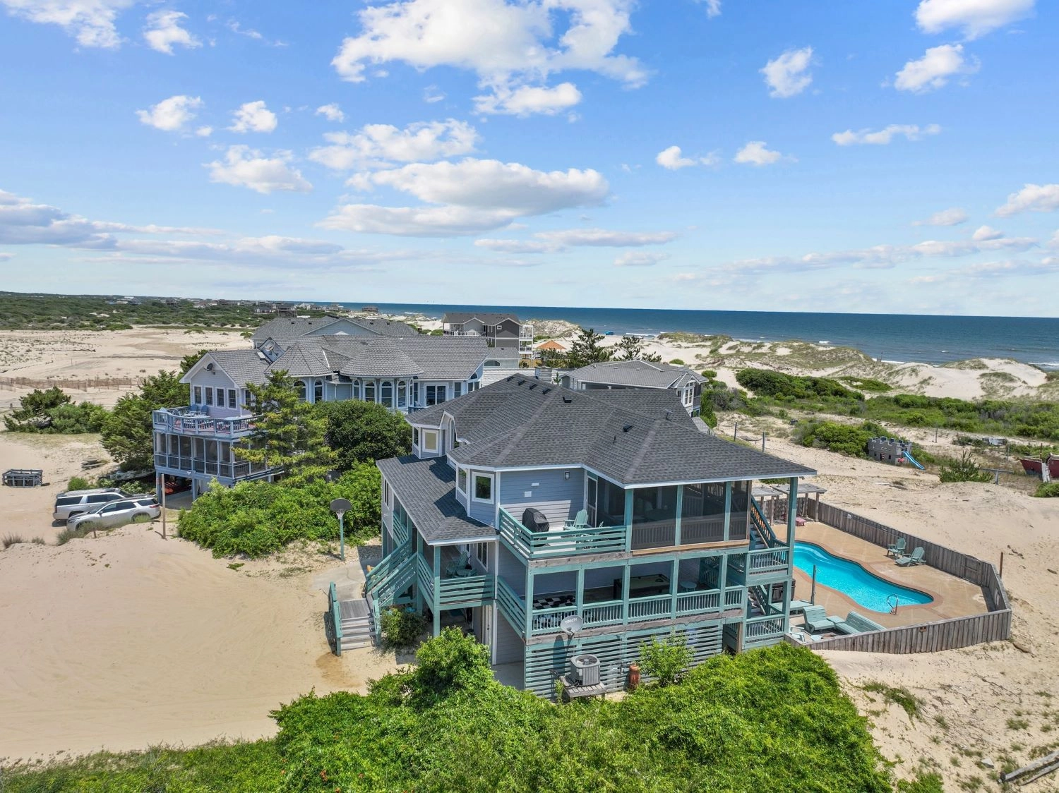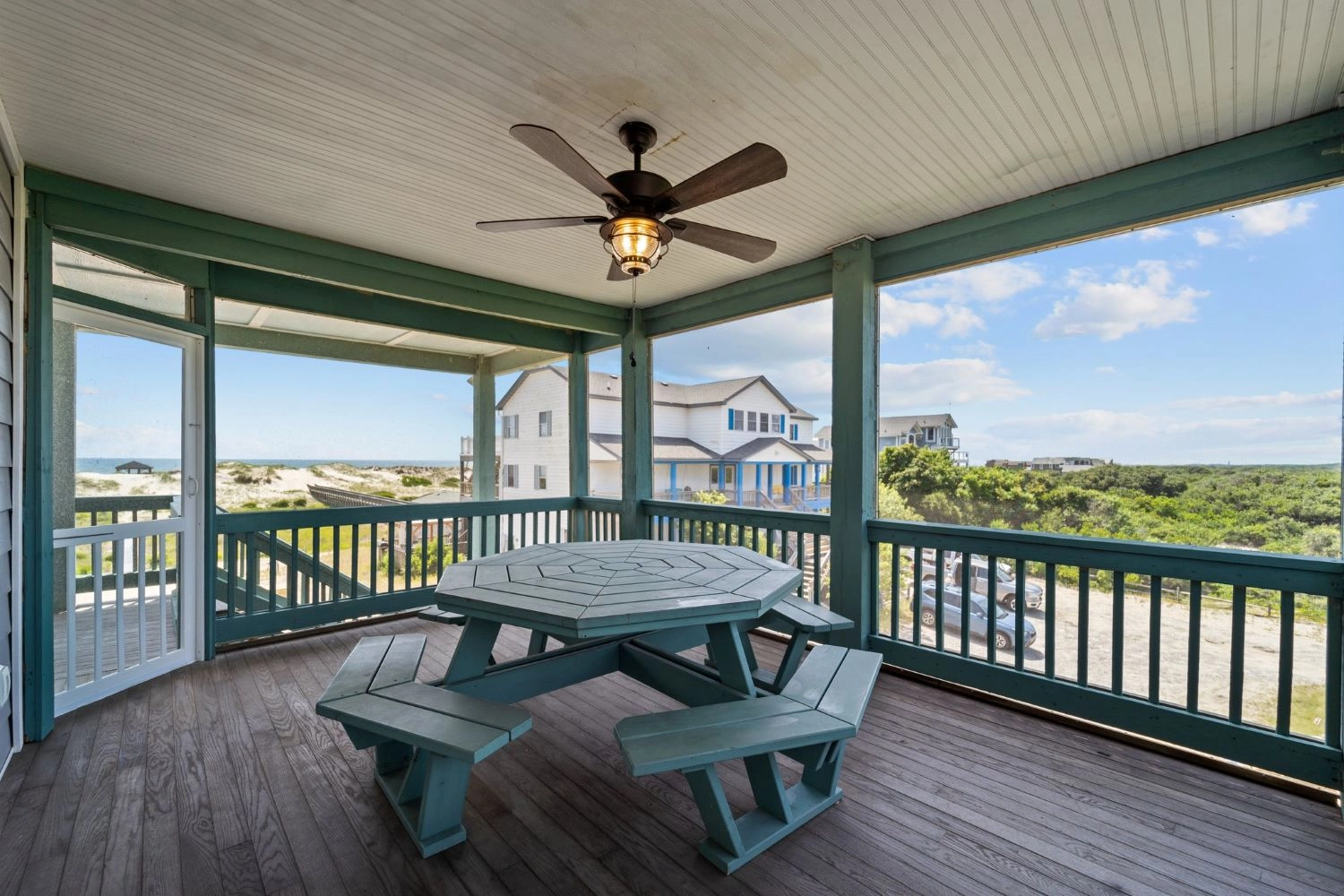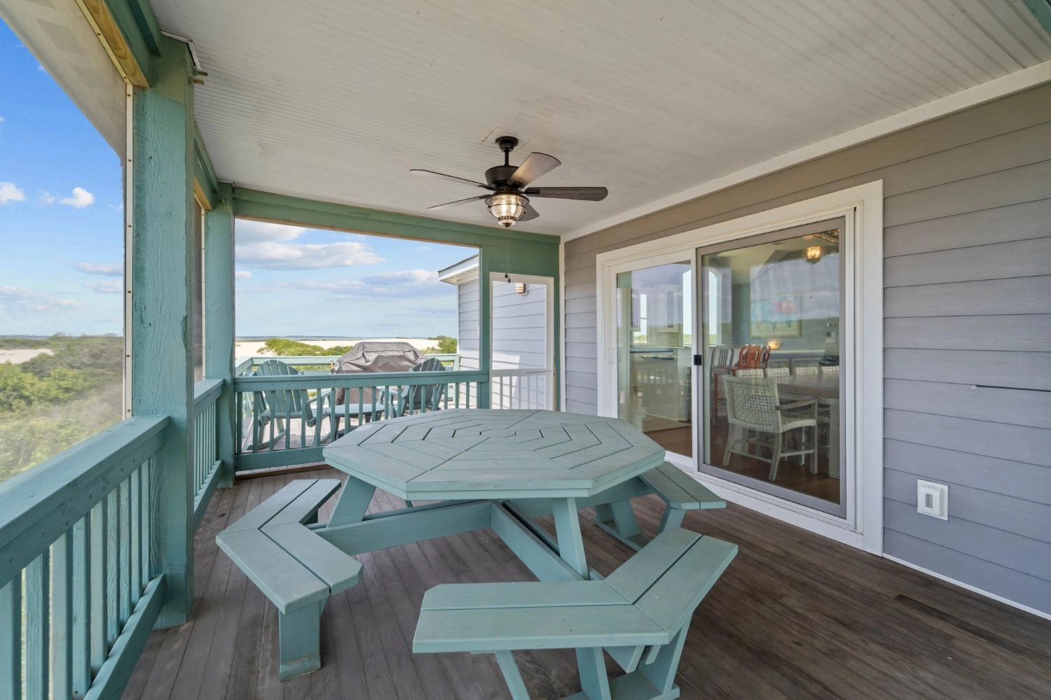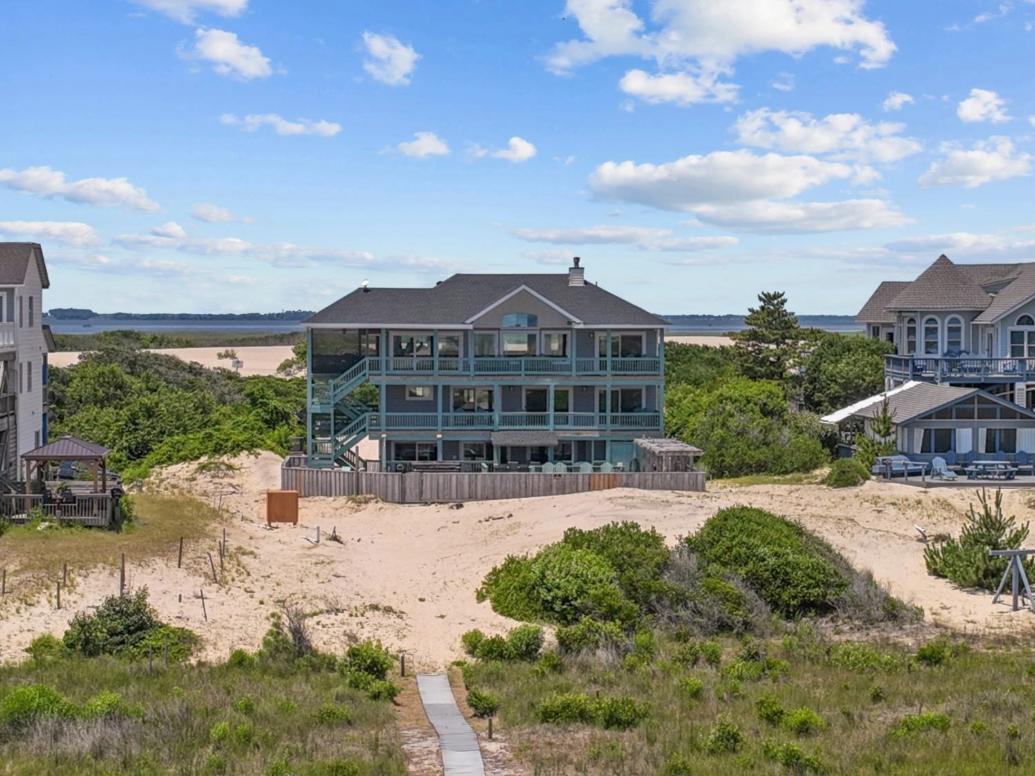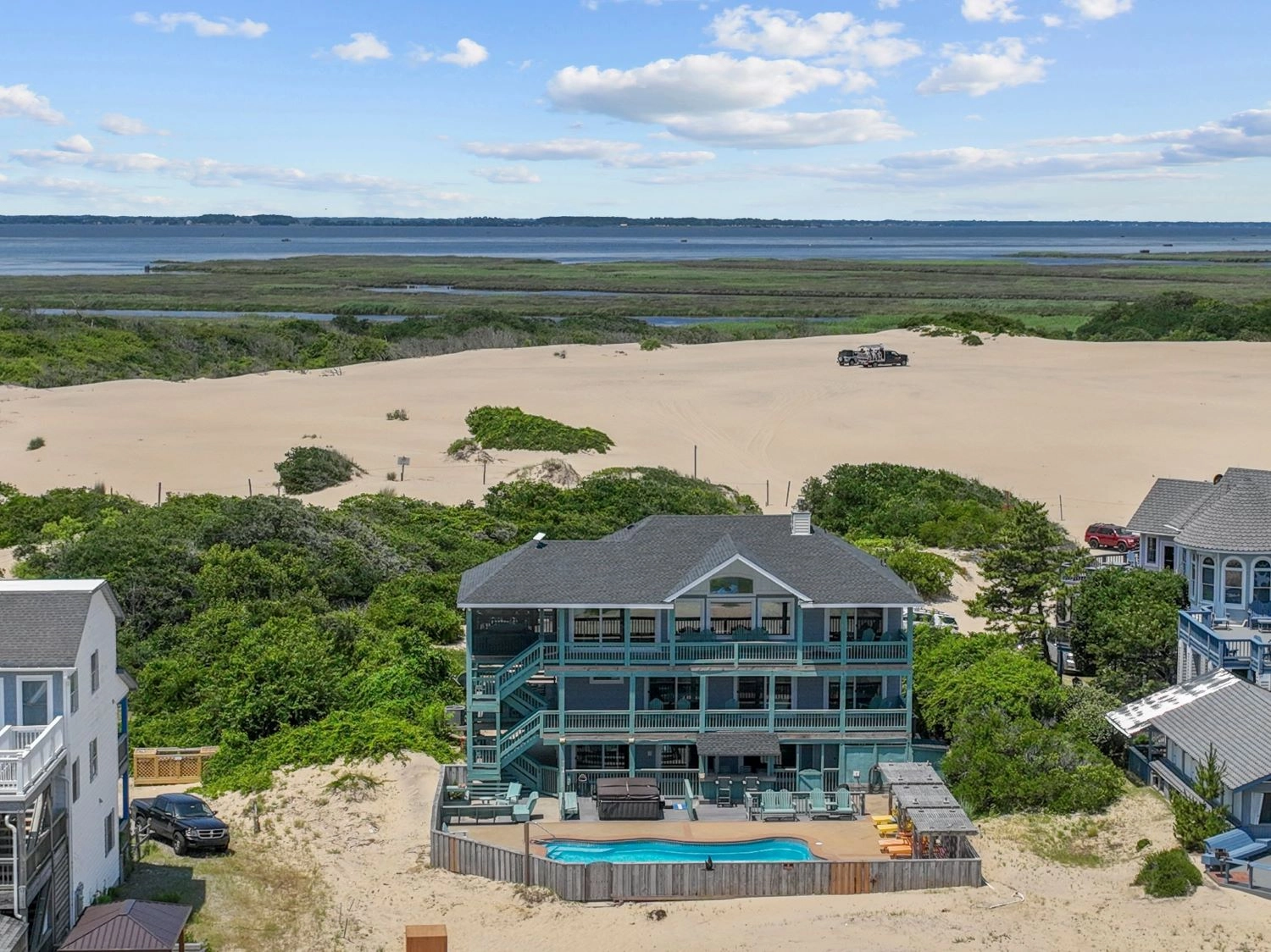 "The home had a great setup with huge top floor and open floor plan. Loved the huge kitchen and large dining table which allowed us to all eat together. Loved the screened side porch because there was always a breeze blowing there. The top floor also gave us views of the sound and the ocean, thus both sunrise and sunset views! First home we’ve stayed in where we had views of both bodies of water. The pool area was awesome too!!"