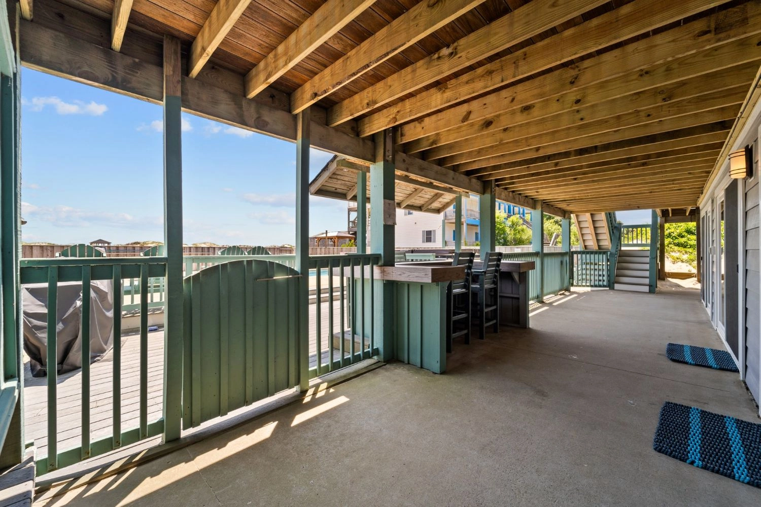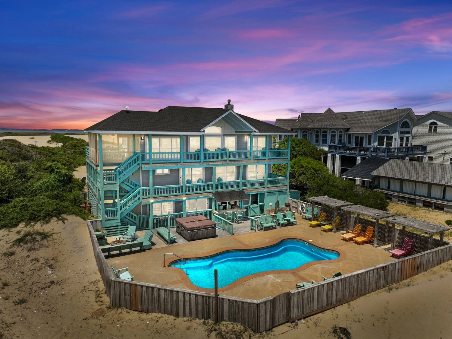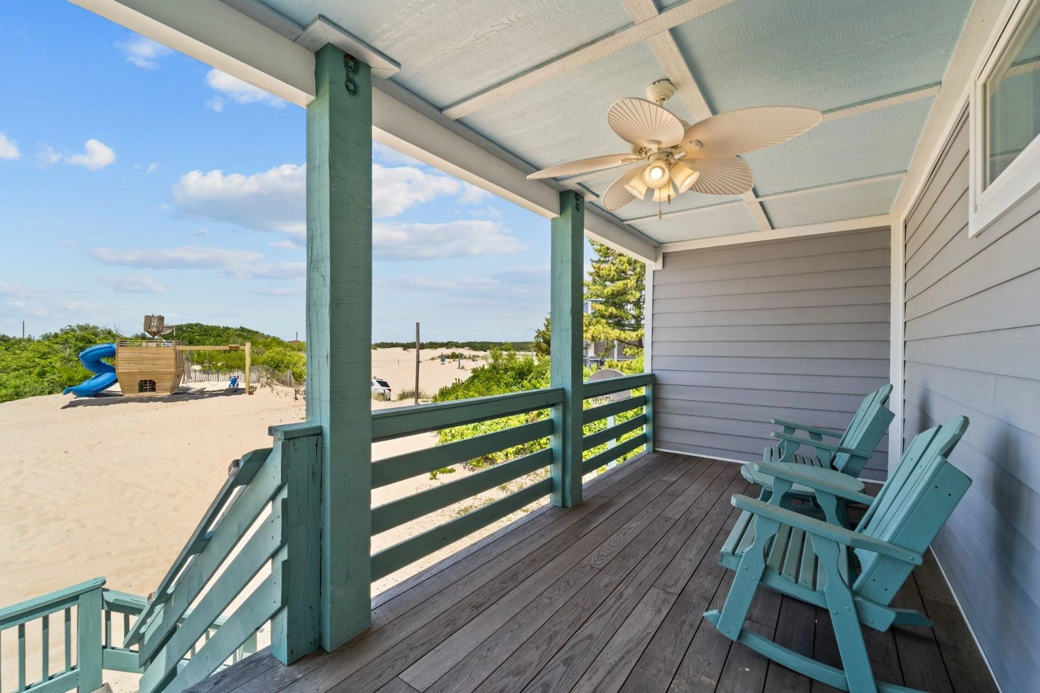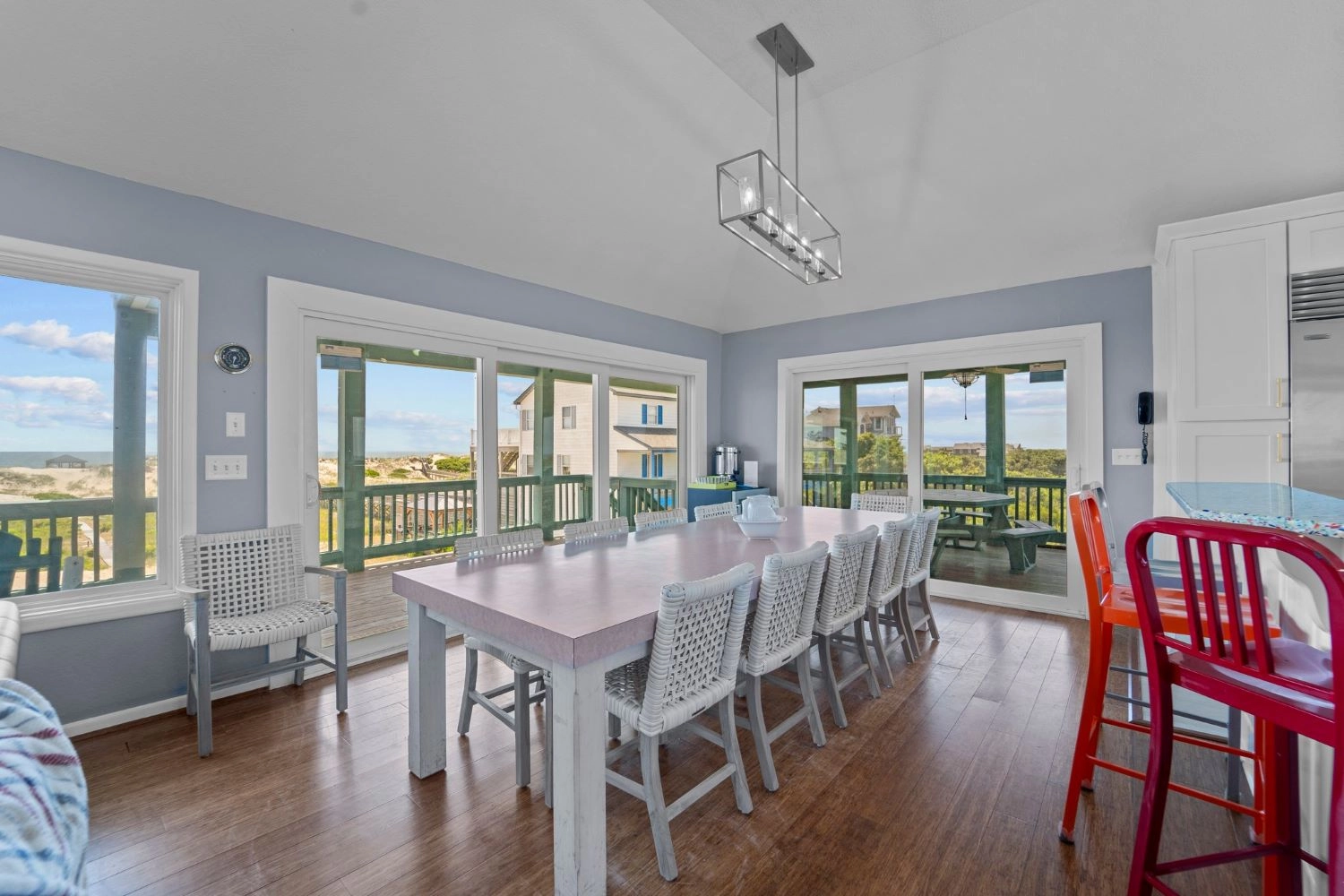 "The home had a great setup with huge top floor and open floor plan. Loved the huge kitchen and large dining table which allowed us to all eat together. Loved the screened side porch because there was always a breeze blowing there. The top floor also gave us views of the sound and the ocean, thus both sunrise and sunset views! First home we’ve stayed in where we had views of both bodies of water. The pool area was awesome too!!"