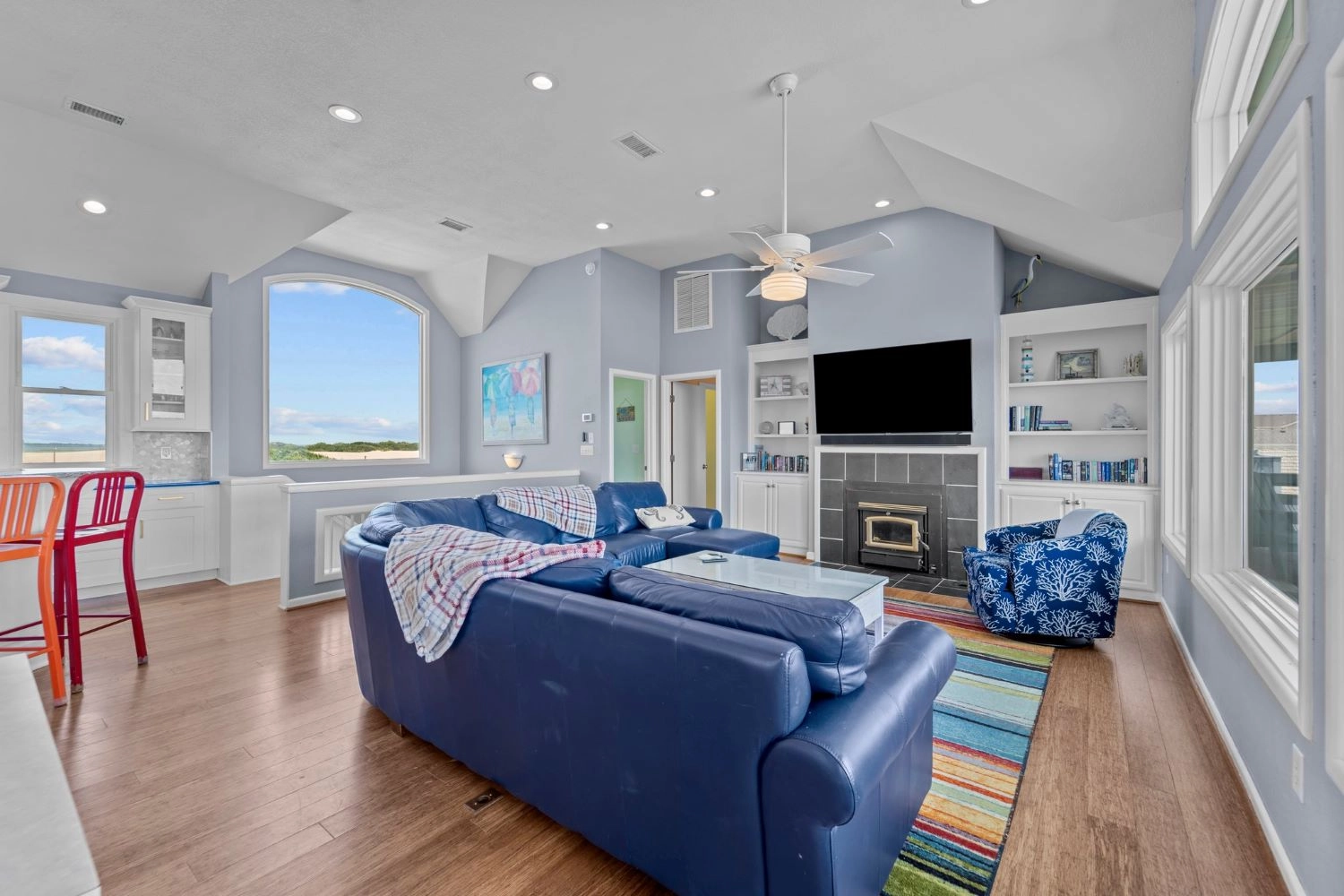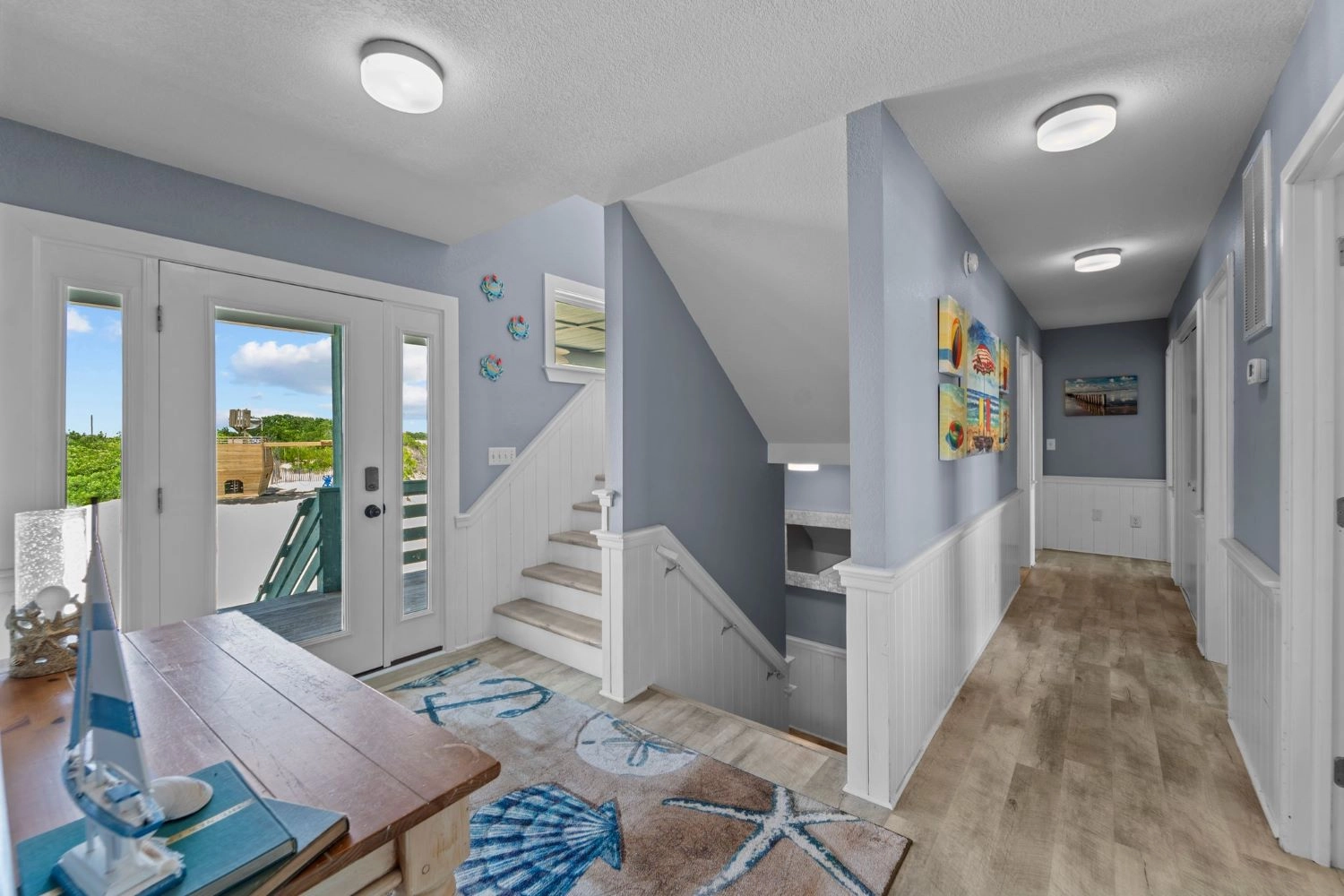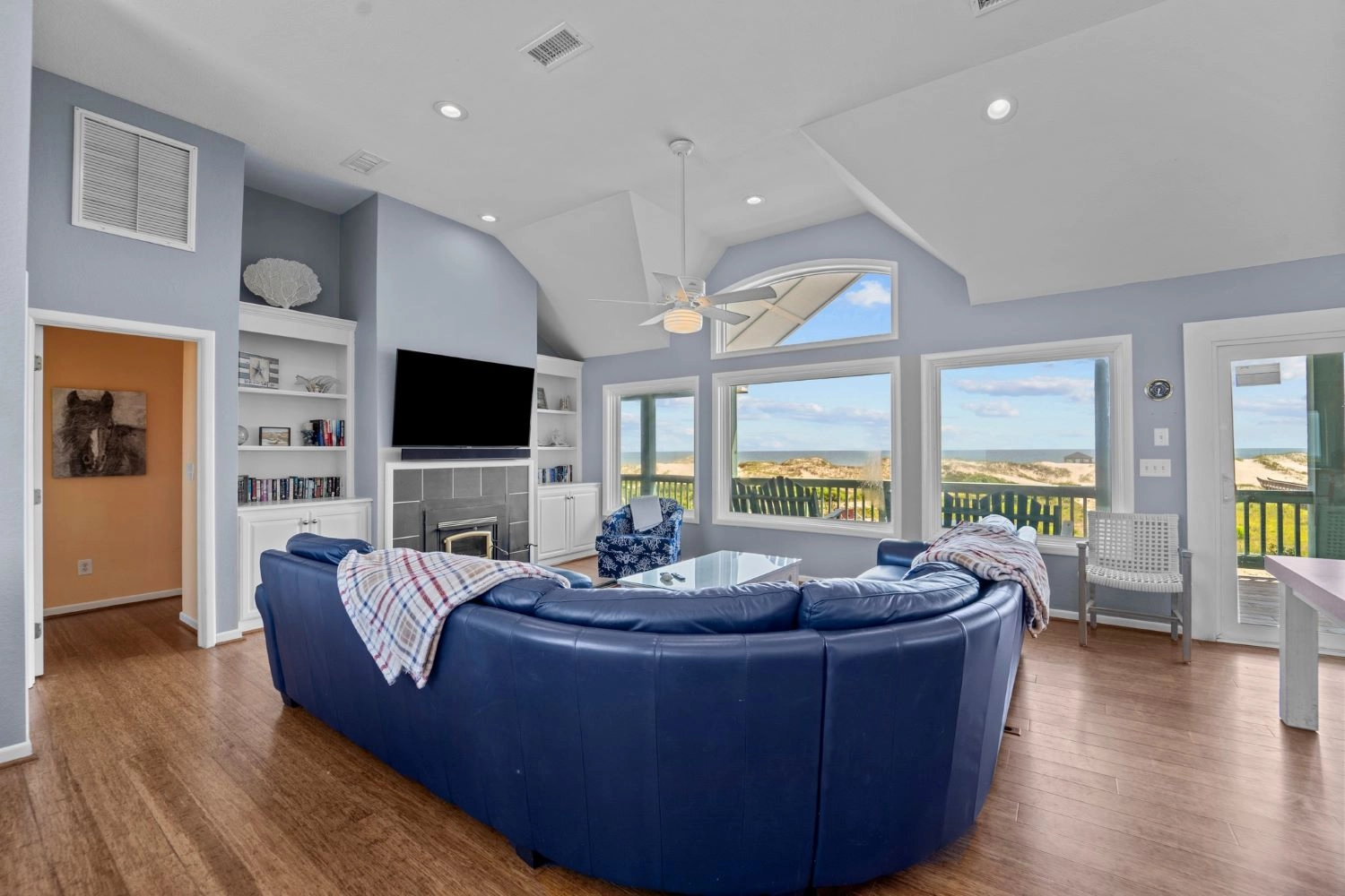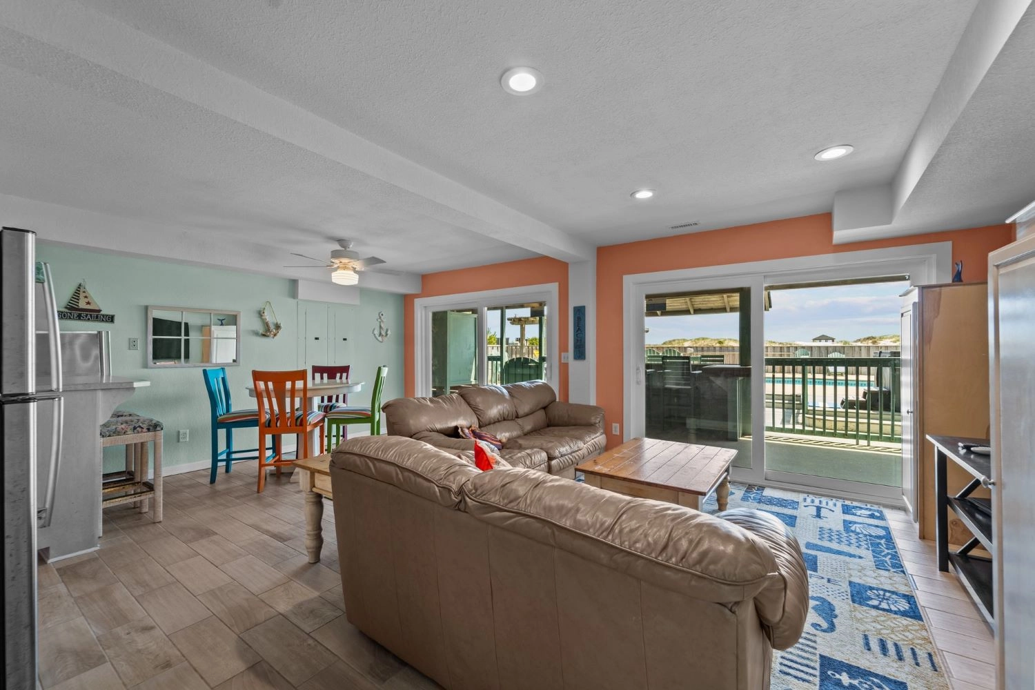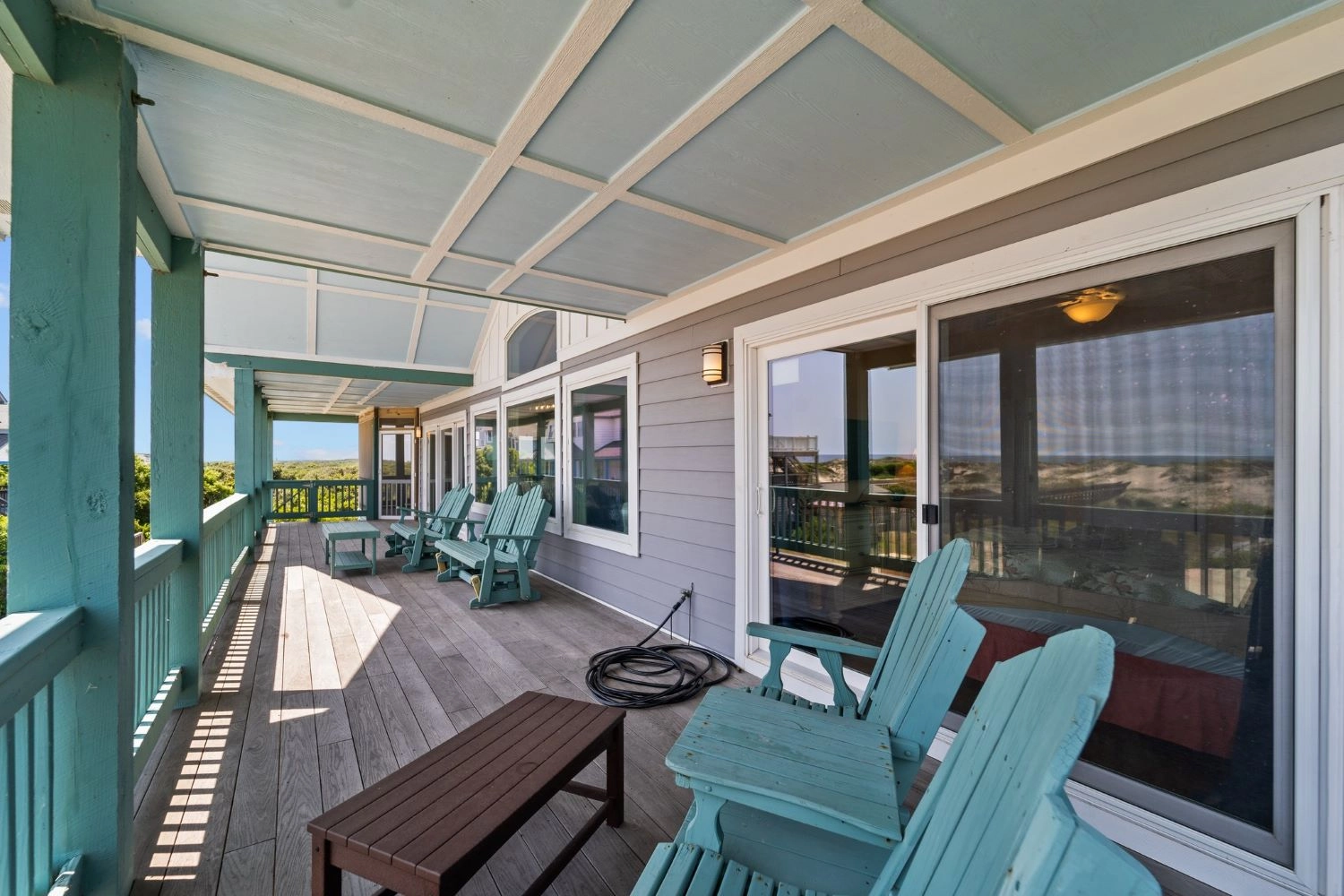 "The home had a great setup with huge top floor and open floor plan. Loved the huge kitchen and large dining table which allowed us to all eat together. Loved the screened side porch because there was always a breeze blowing there. The top floor also gave us views of the sound and the ocean, thus both sunrise and sunset views! First home we’ve stayed in where we had views of both bodies of water. The pool area was awesome too!!"