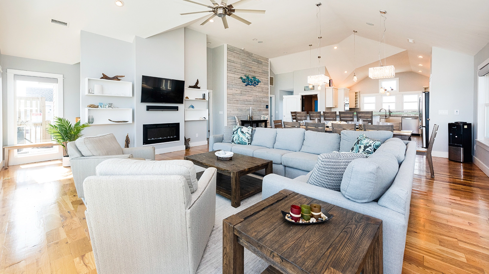 Great room with electric fireplace; kitchen; dining area.