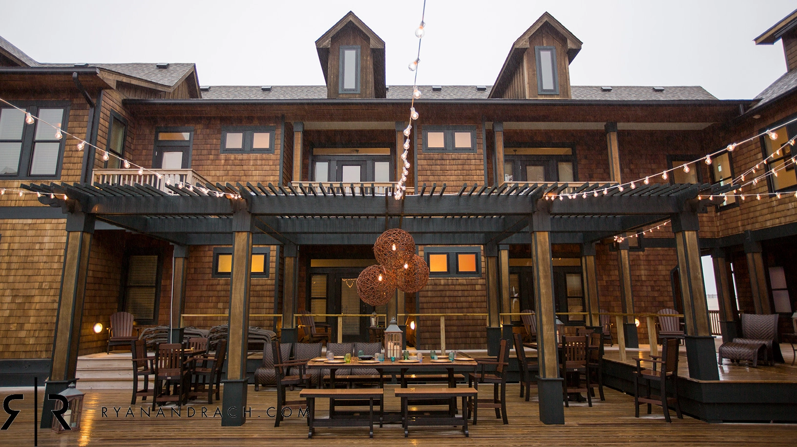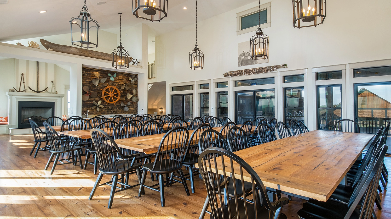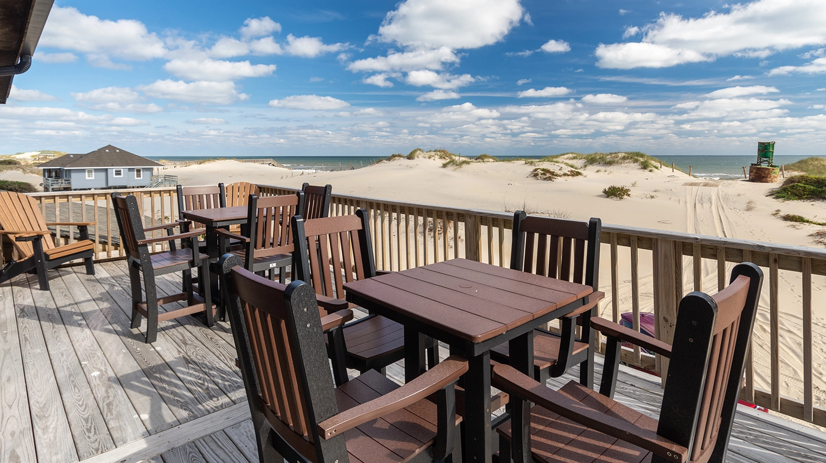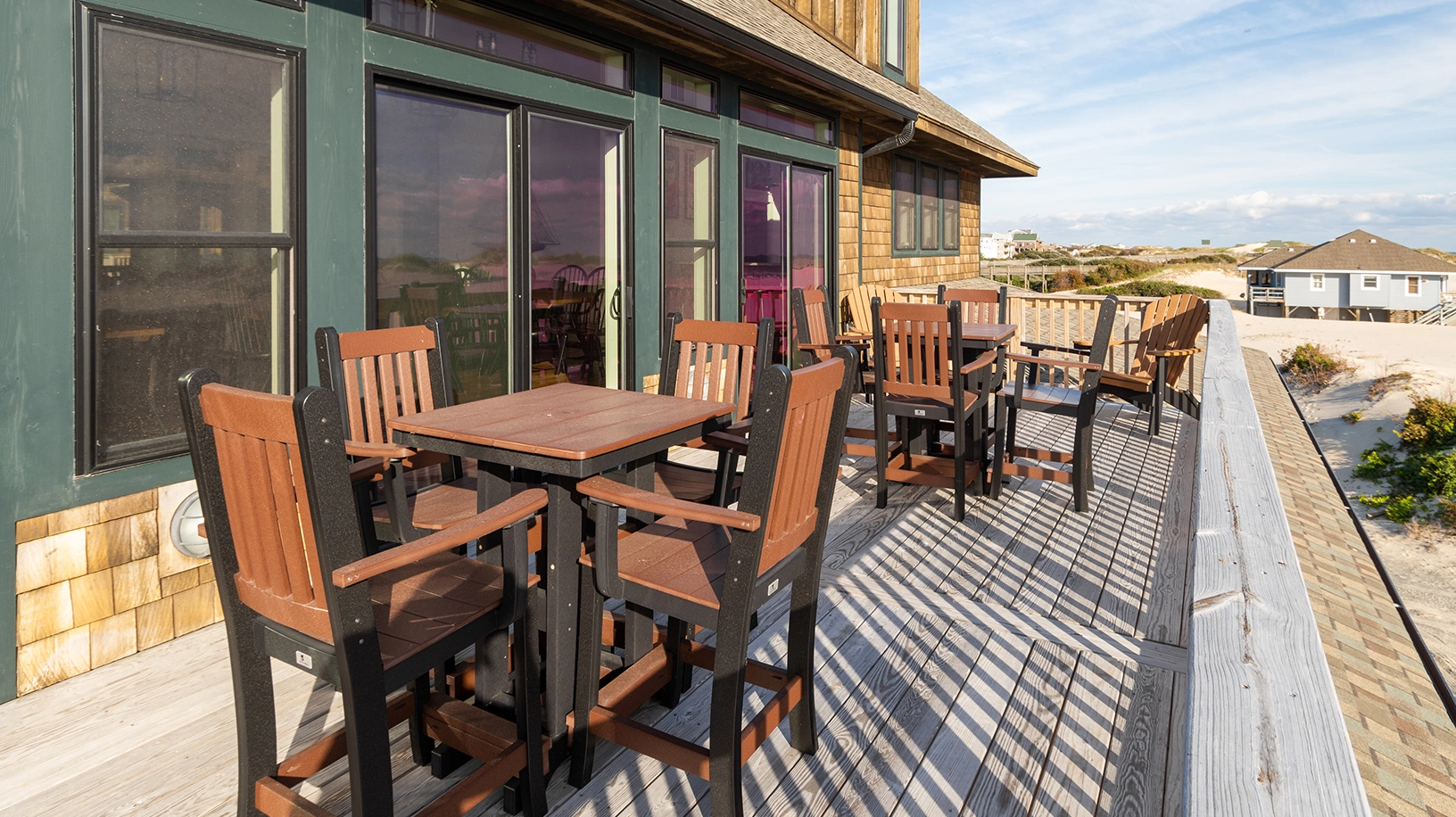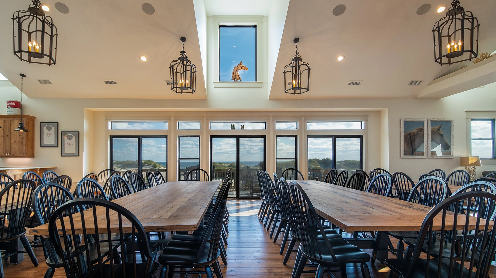 Living area with gas fireplace; large dining area with seating for approximately 50 and a wet bar, adjacent to a large oceanfront deck and covered porch; fully equipped kitchen with multiple appliances, prep space, and sinks.