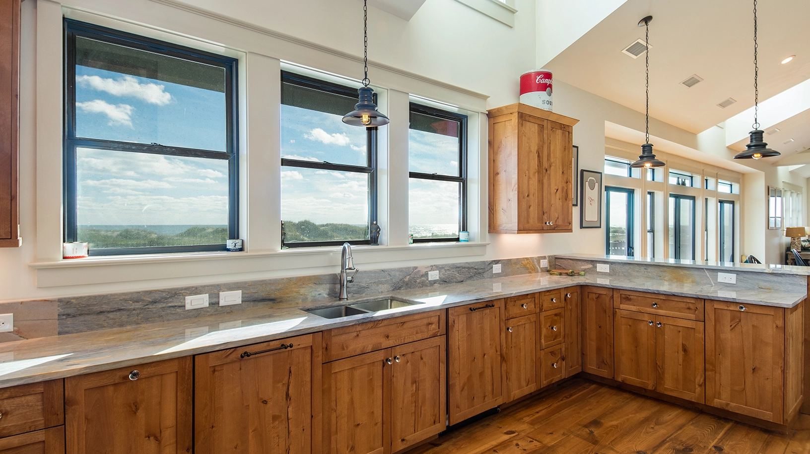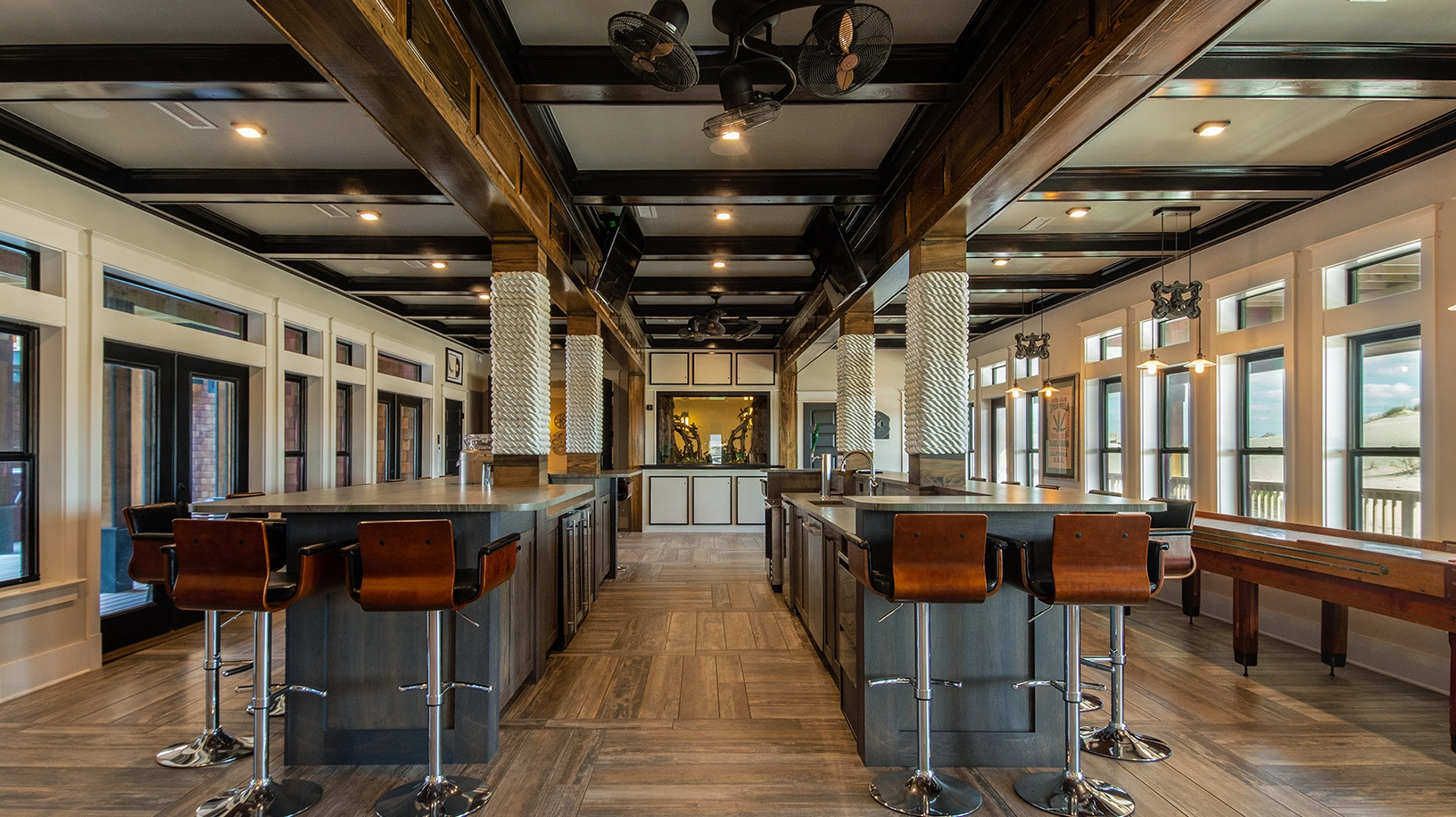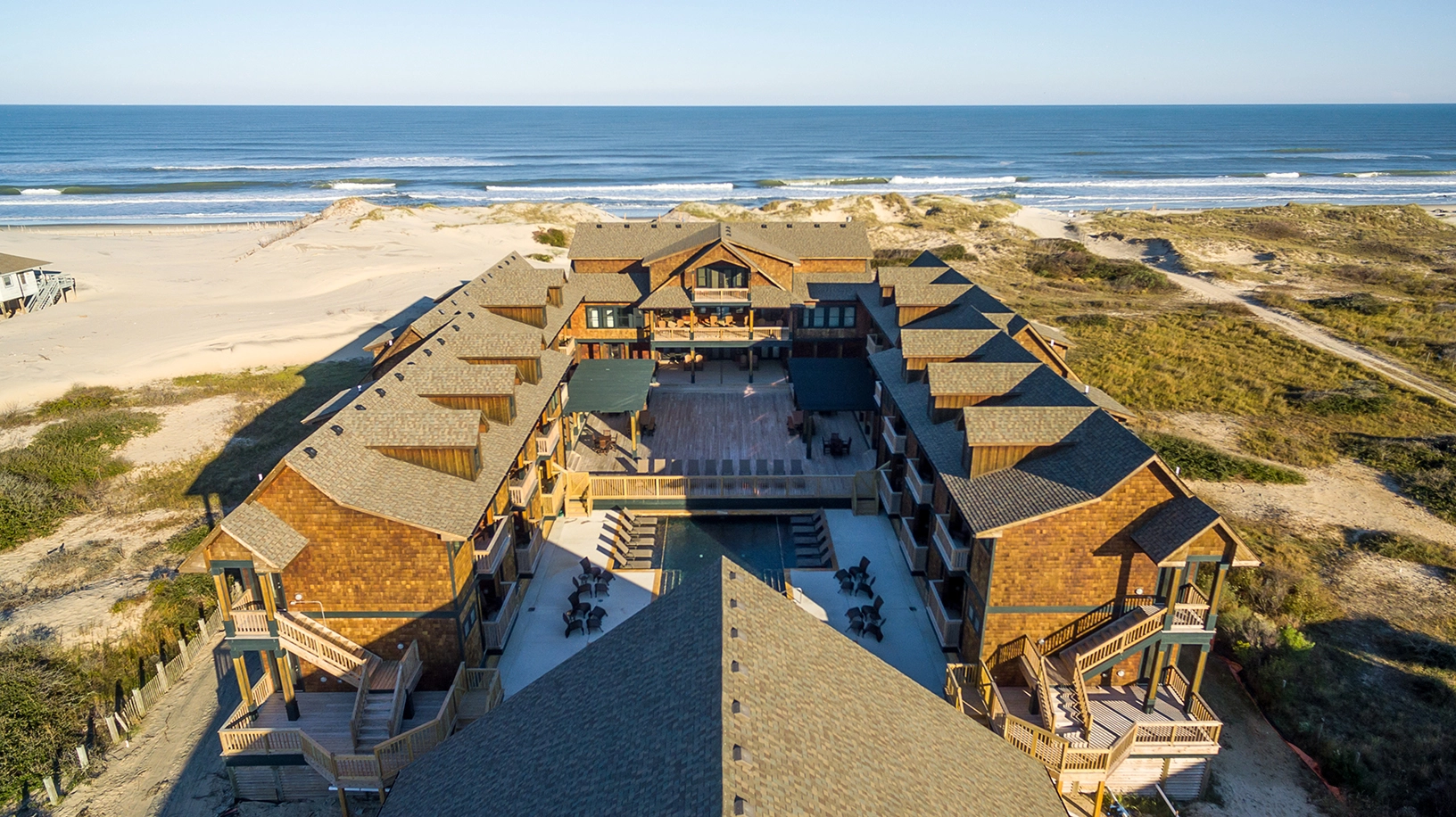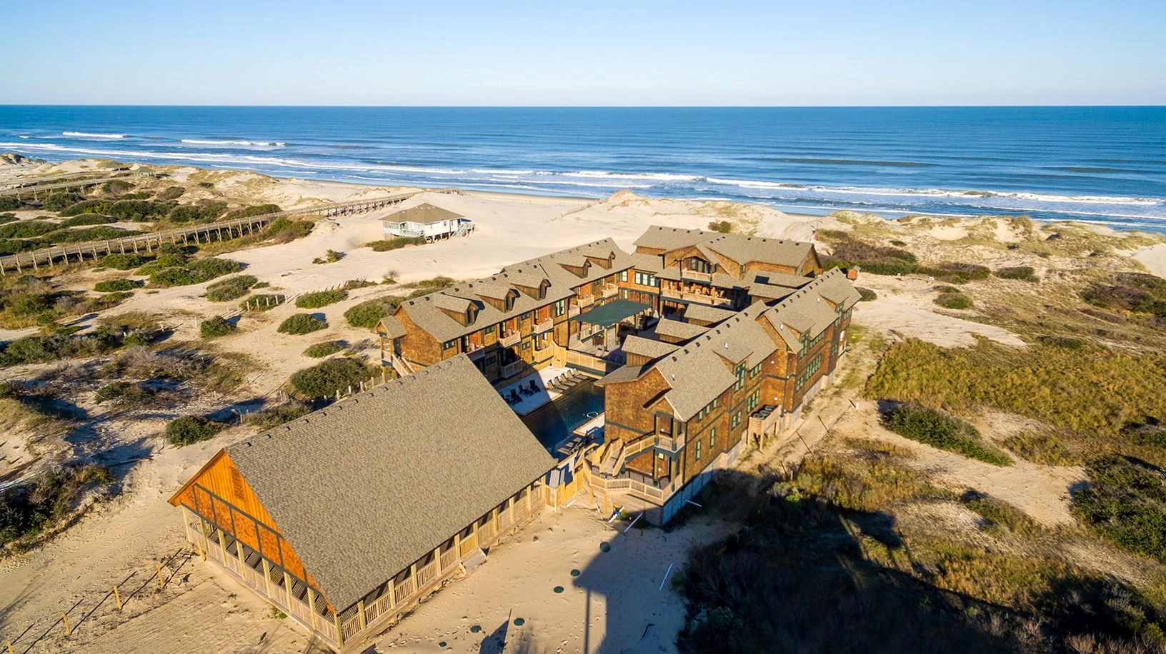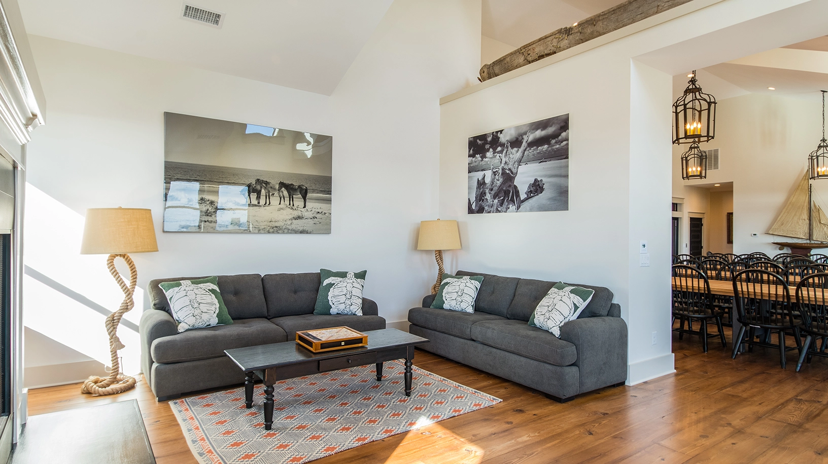 Living area with gas fireplace; large dining area with seating for approximately 50 and a wet bar, adjacent to a large oceanfront deck and covered porch; fully equipped kitchen with multiple appliances, prep space, and sinks.