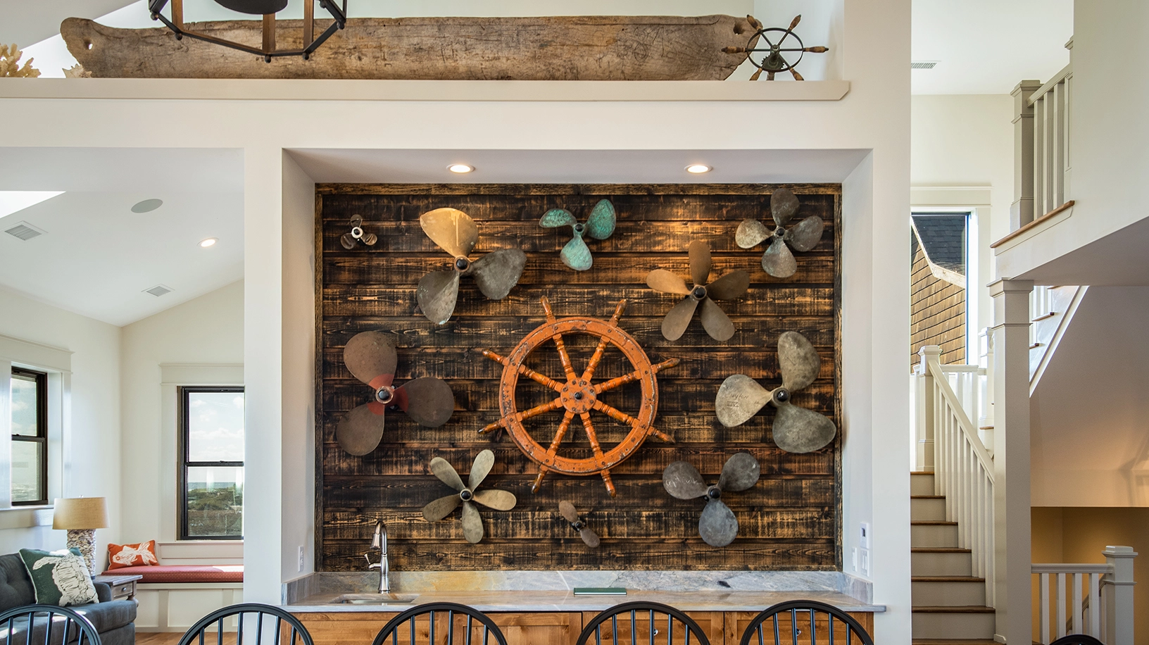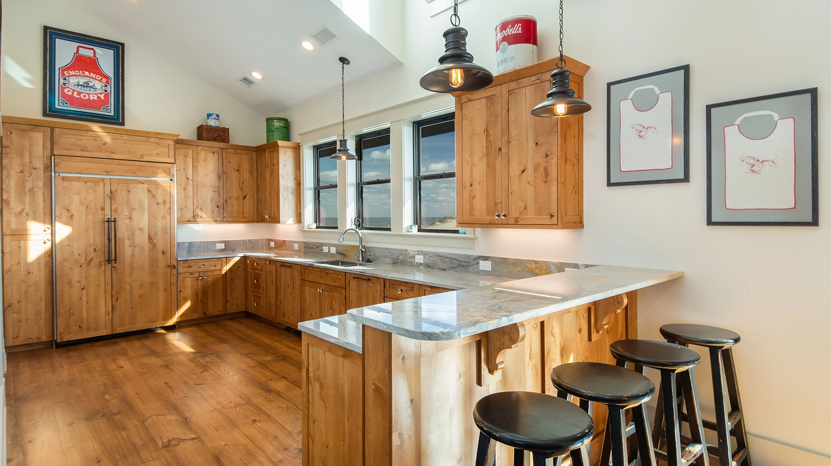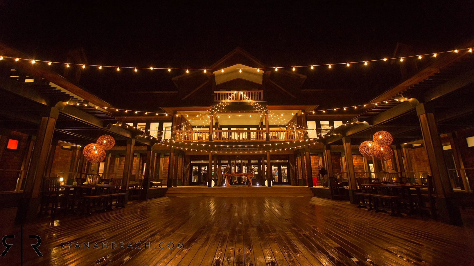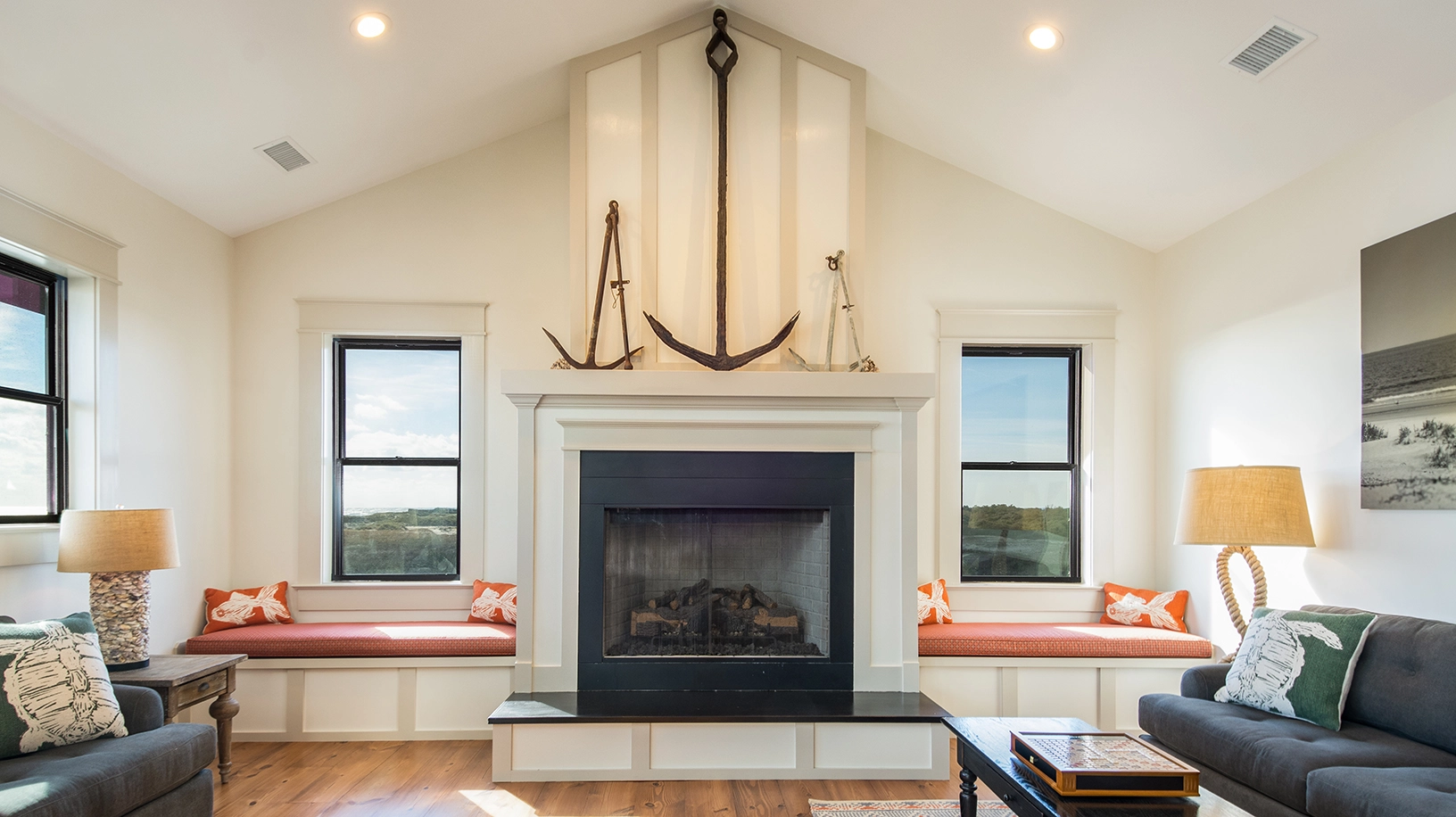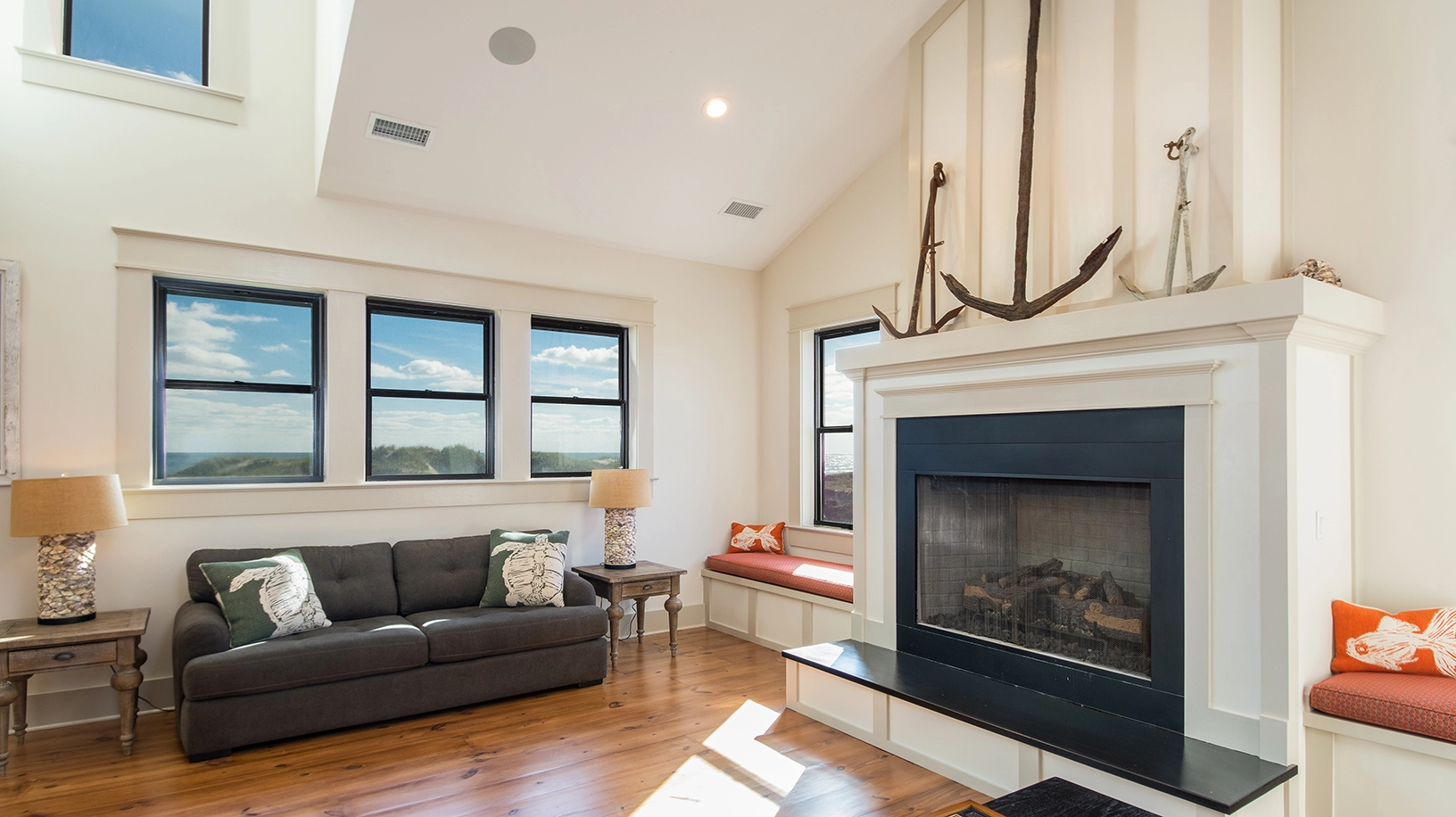 Living area with gas fireplace; large dining area with seating for approximately 50 and a wet bar, adjacent to a large oceanfront deck and covered porch; fully equipped kitchen with multiple appliances, prep space, and sinks.