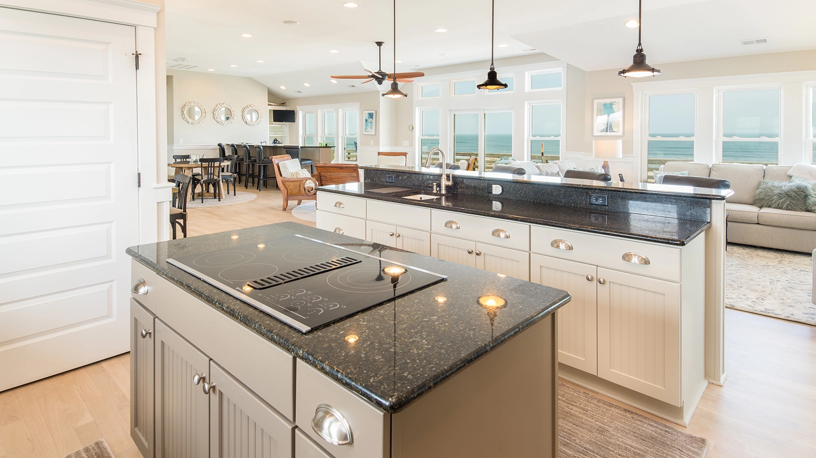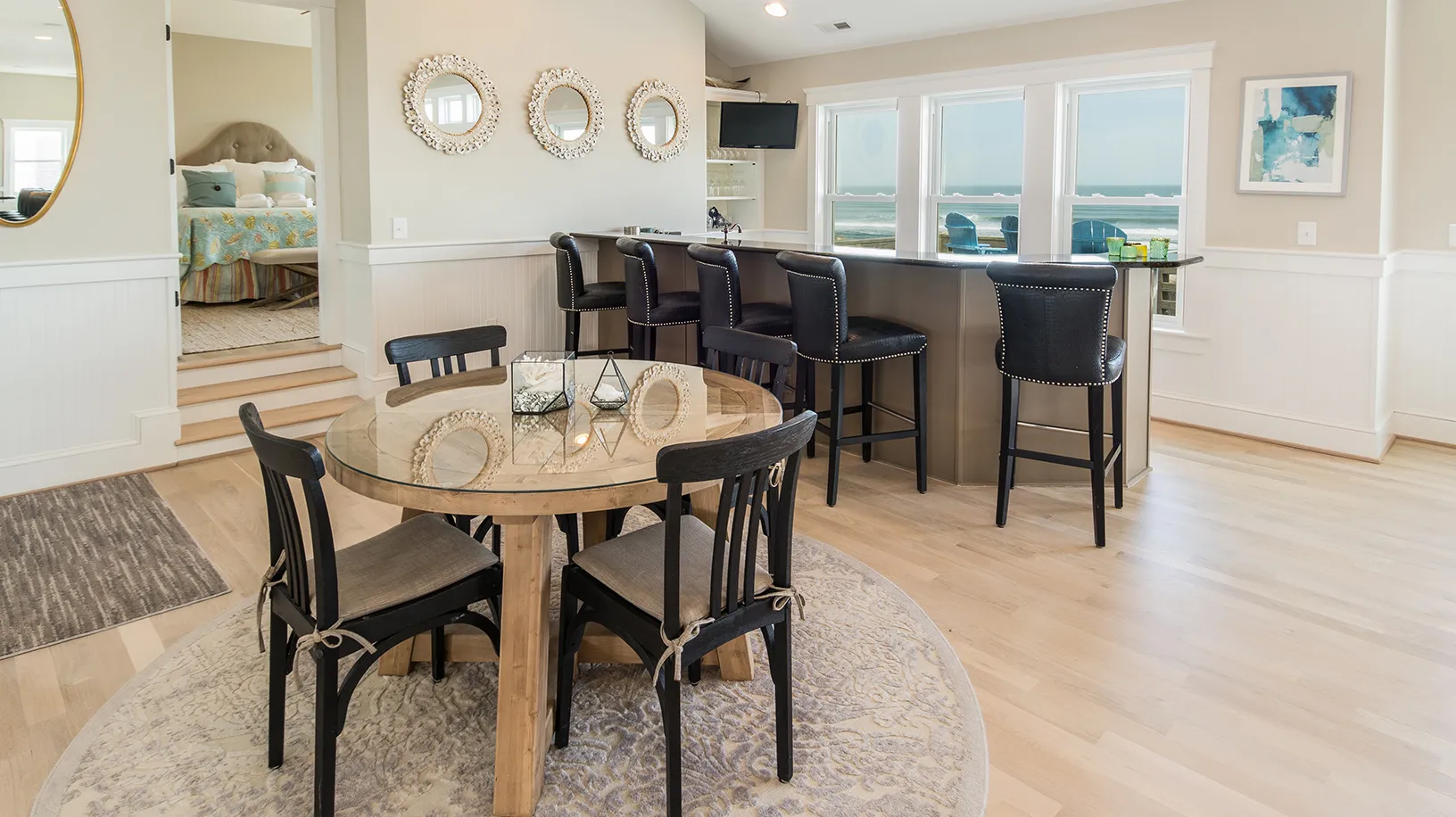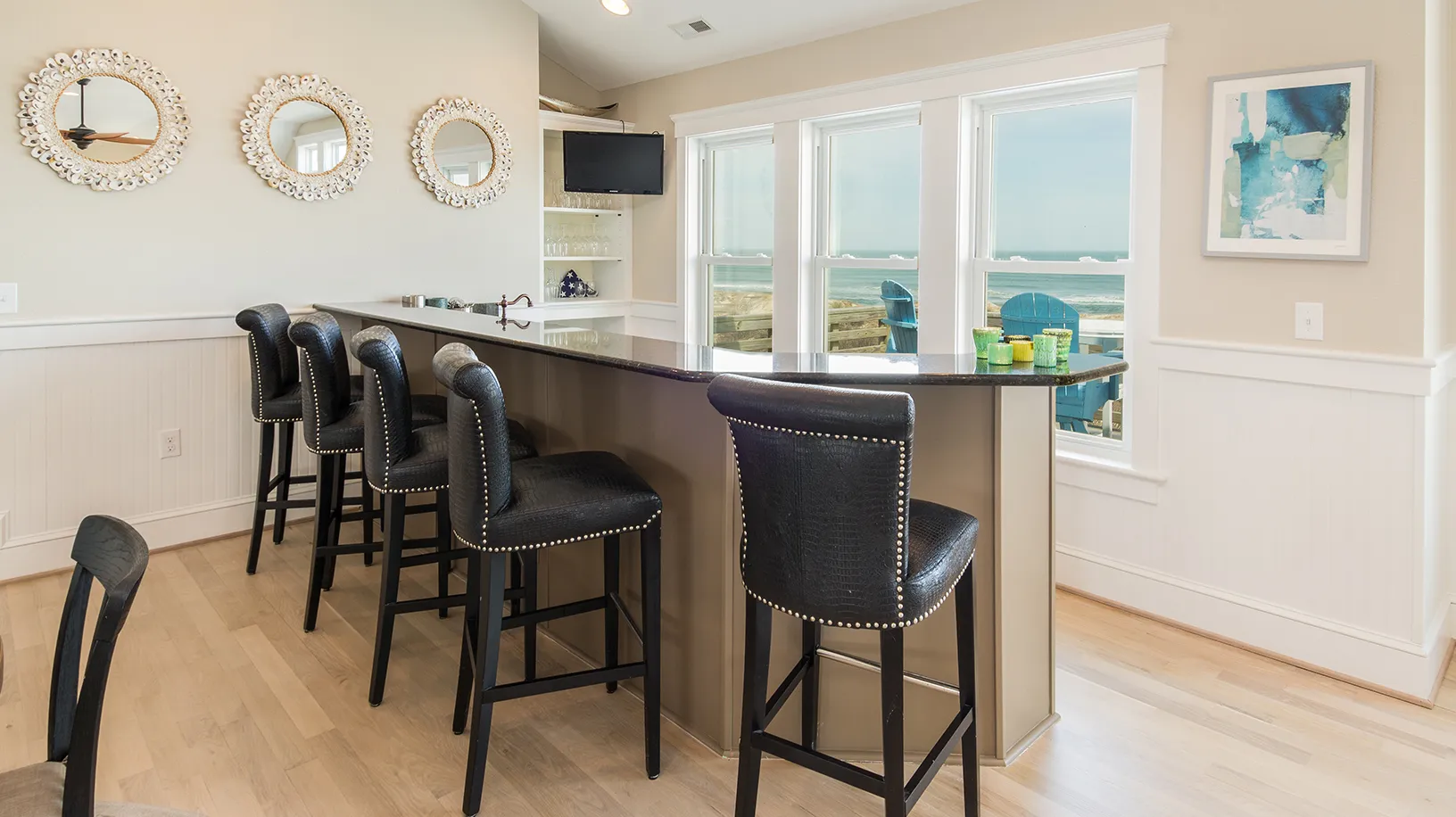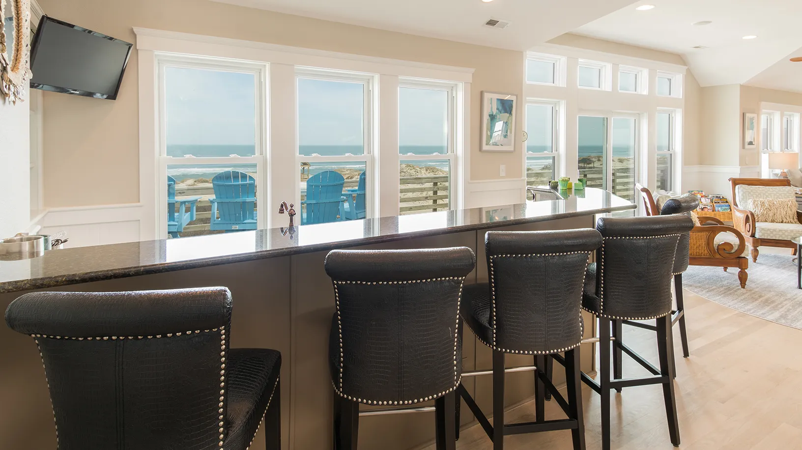 Great room with wet bar overlooking the ocean; kitchen; dining area.
