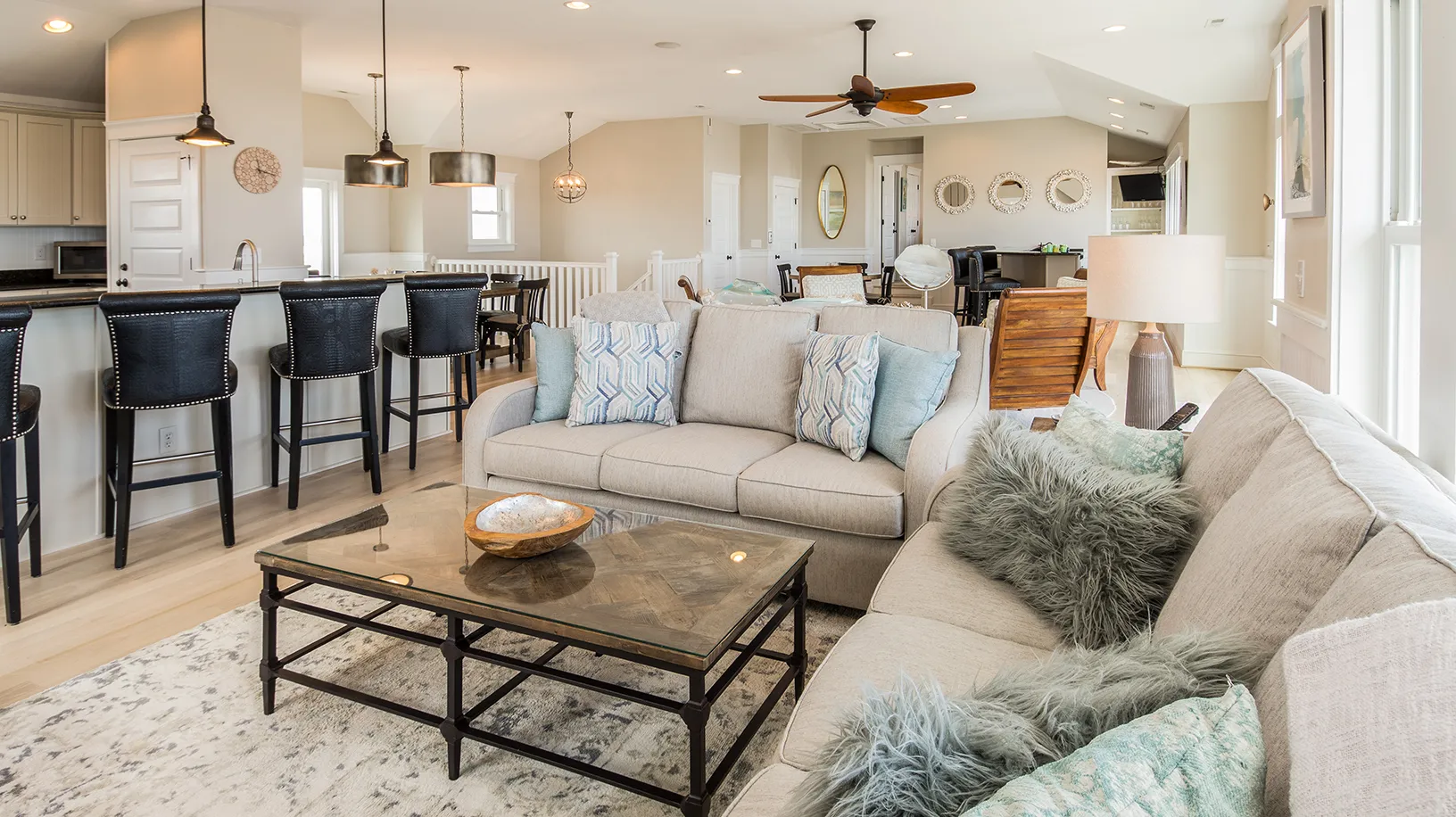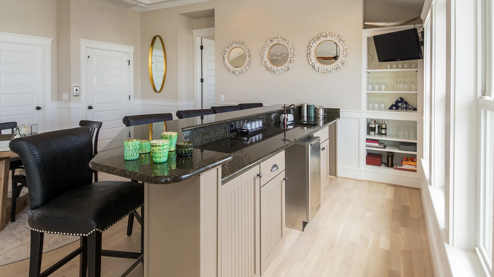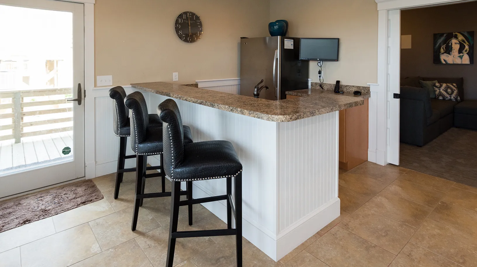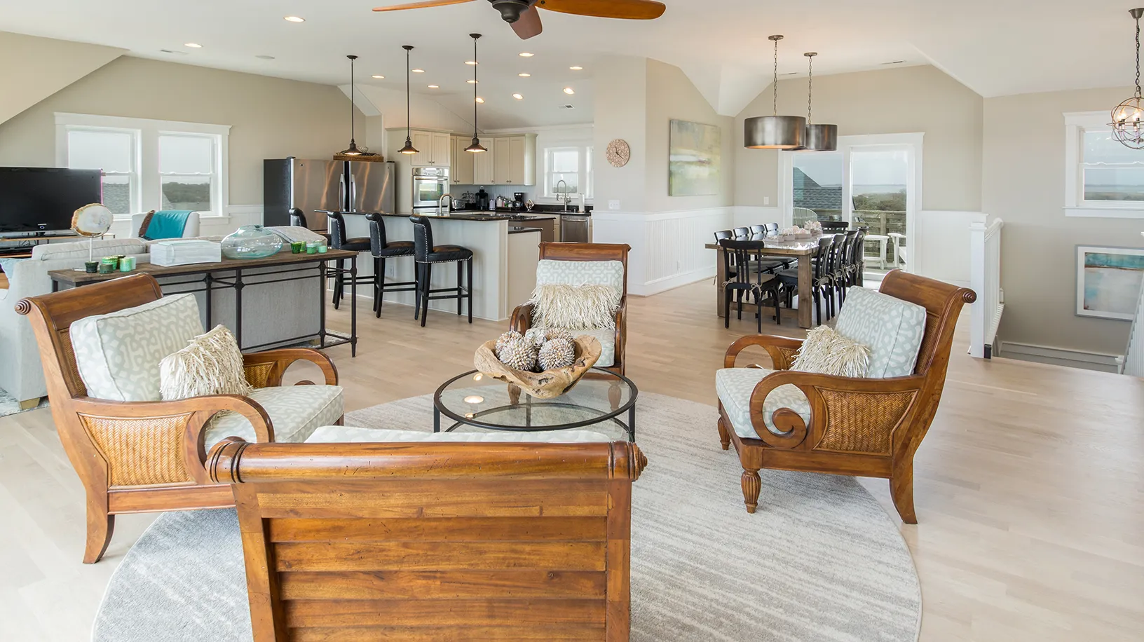 Great room with wet bar overlooking the ocean; kitchen; dining area.