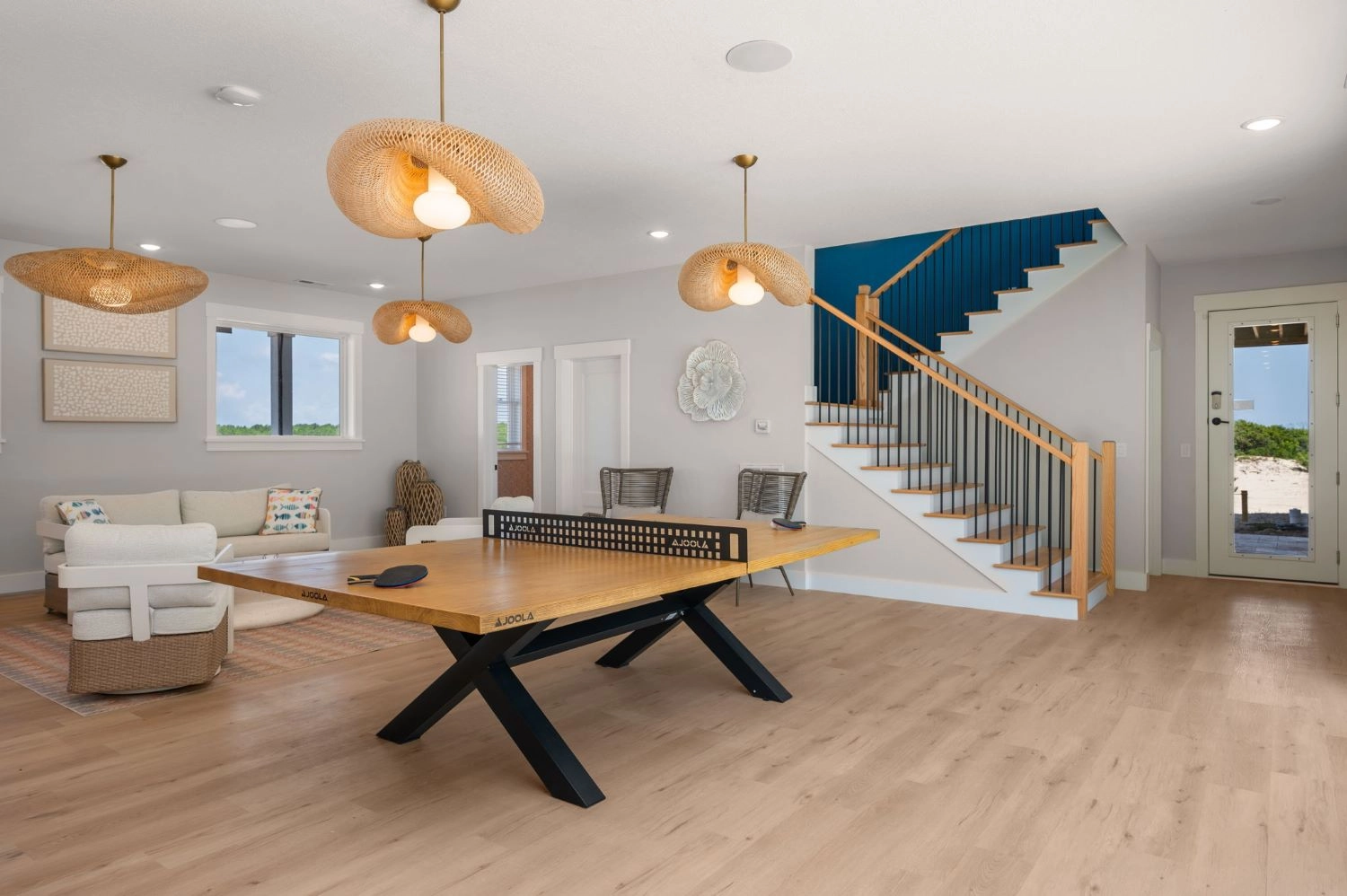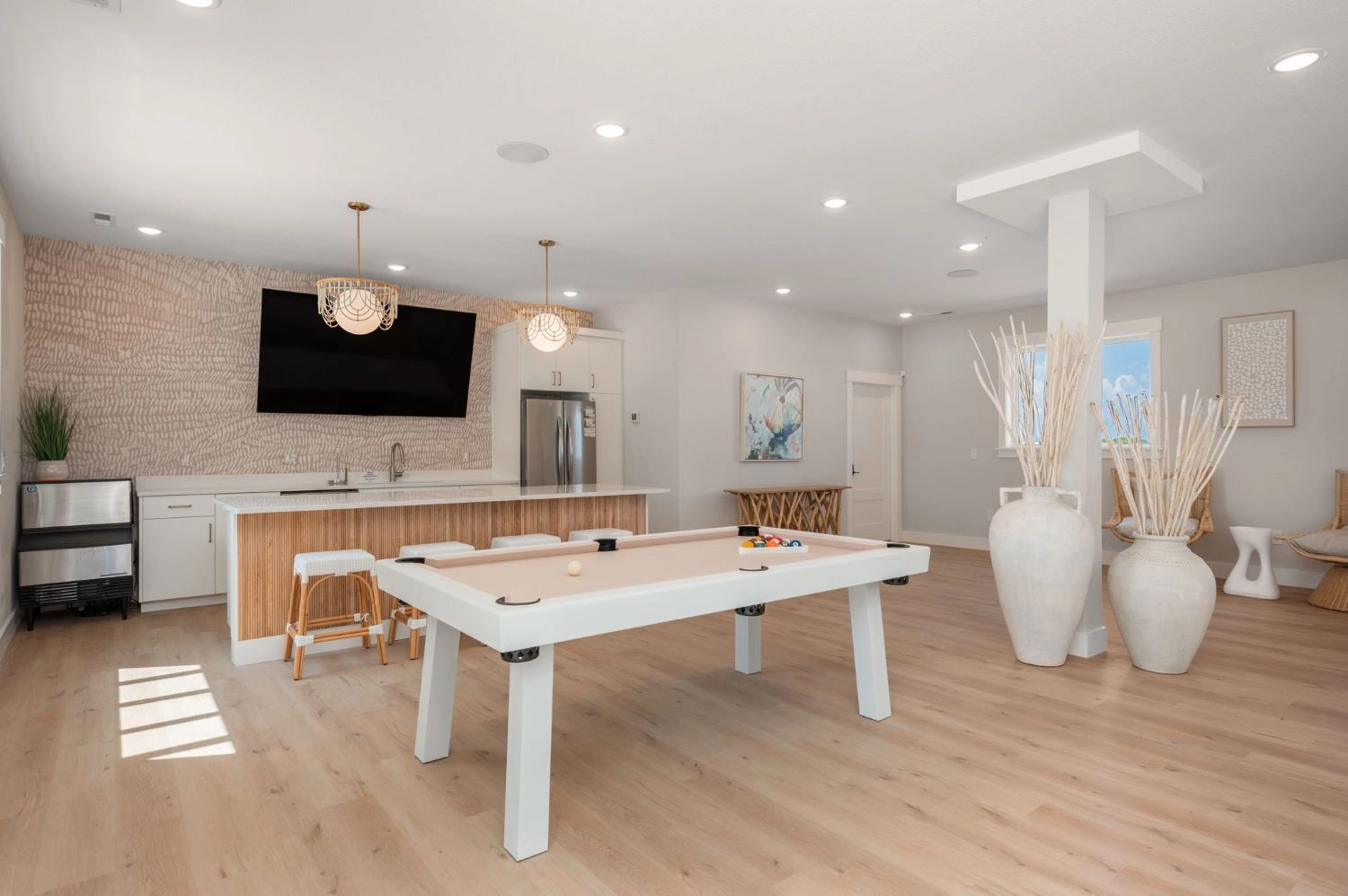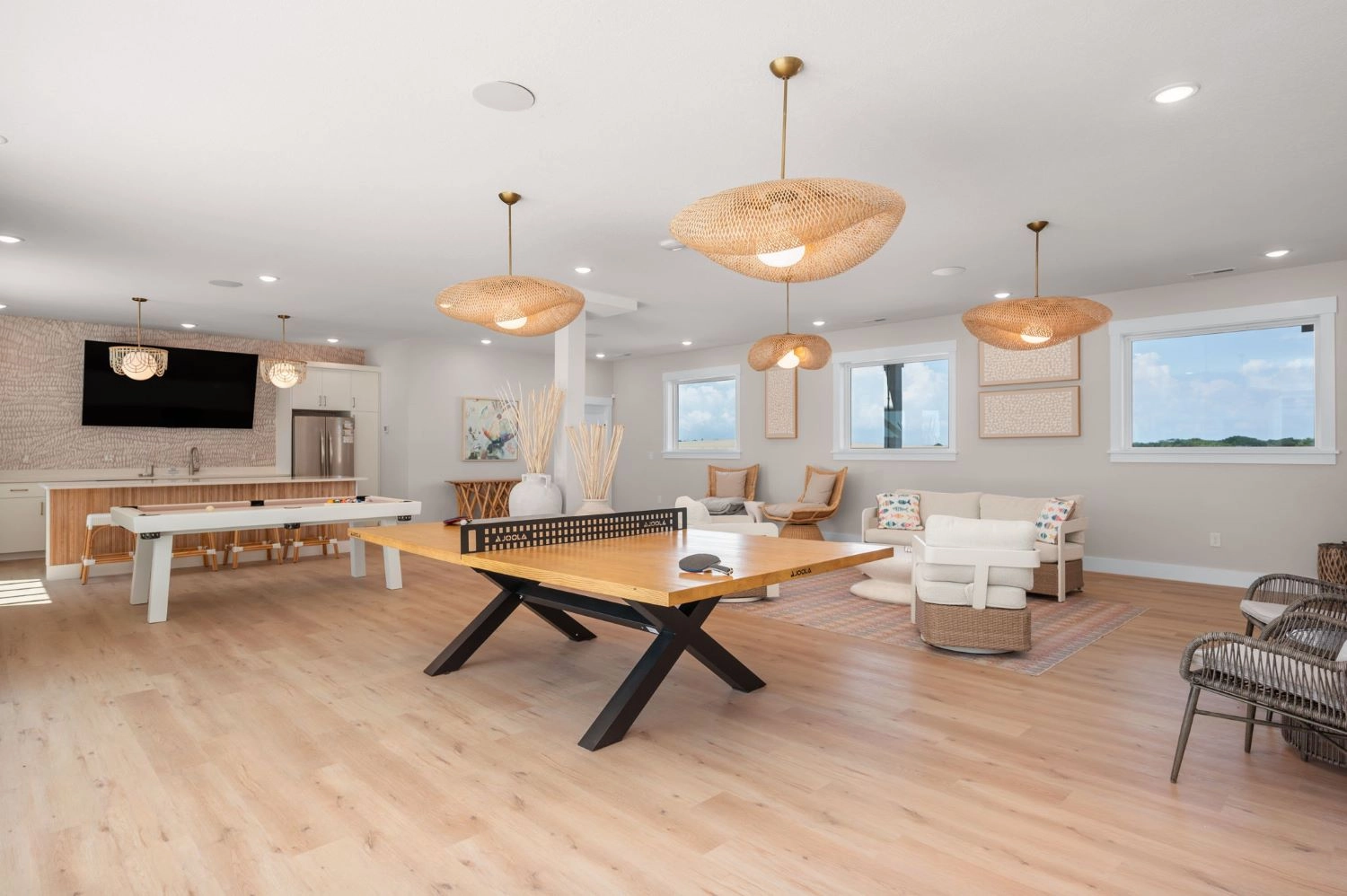 Large rec room with ping pong and pool tables, bar with refrigerator, dishwasher, and commercial-grade ice machine. Large serving window and two double sliders to pool area.