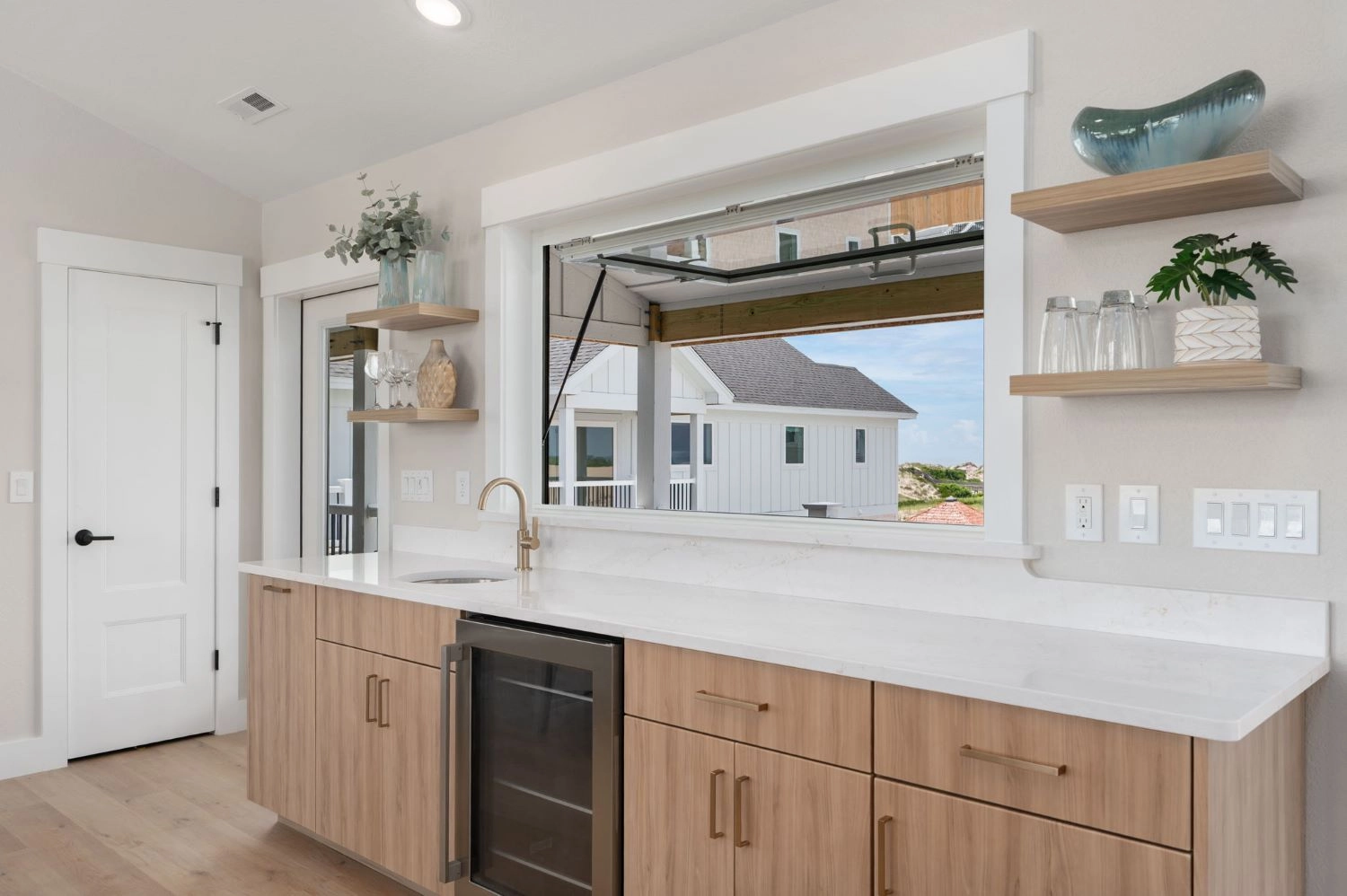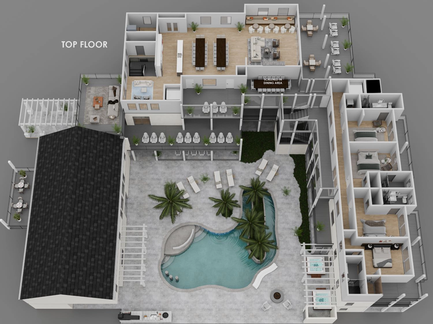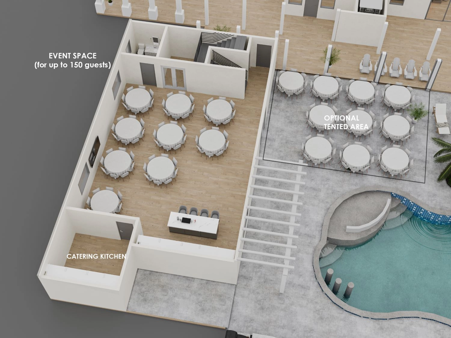 Large rec room with ping pong and pool tables, bar with refrigerator, dishwasher, and commercial-grade ice machine. Large serving window and two double sliders to pool area.