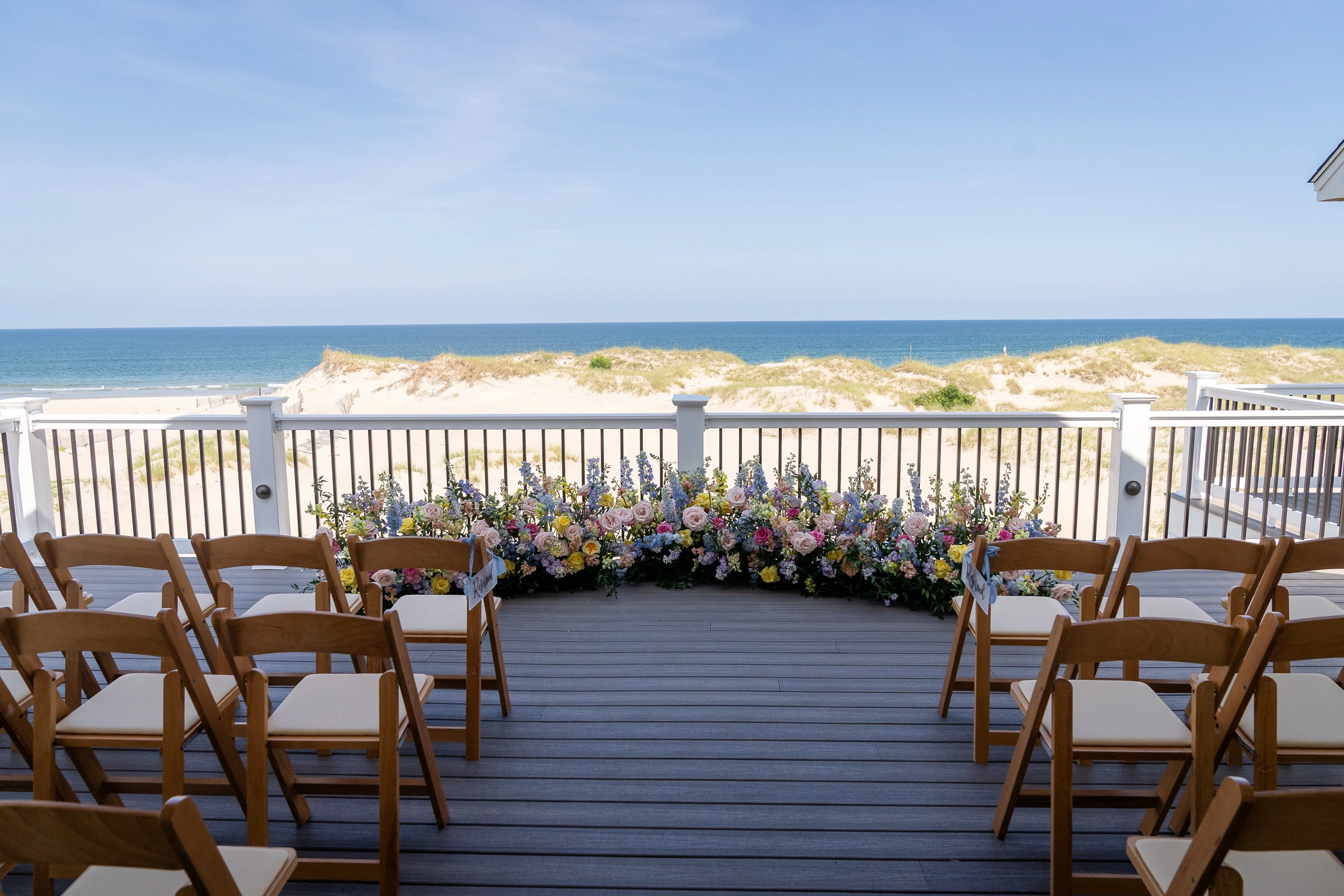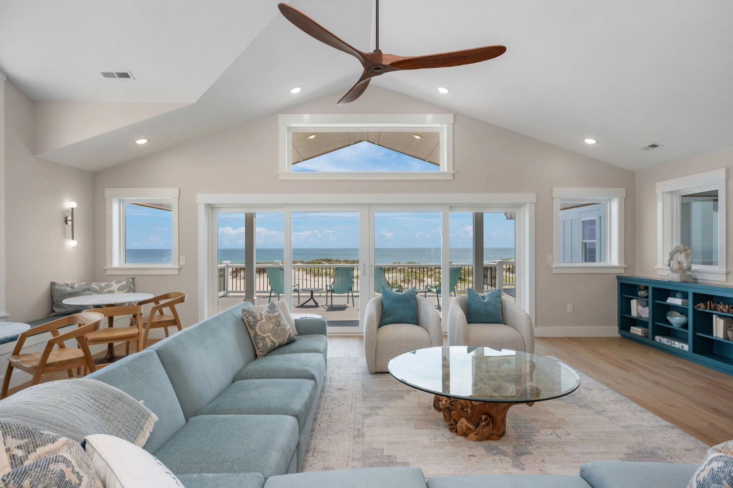Great room with electric fireplace, coffee/cocktail wet bar and ocean to sound views; large covered porch overlooking the ocean; fully equipped kitchen with professional grade 60" range, three refrigerators and three dishwashers; separate prep kitchen; dining area with seating for 48; sunset lounge sitting area with sound views, cocktail bar, and under-counter beverage refrigerator; outdoor dining area with large serving window to kitchen area; ocean to sound views.