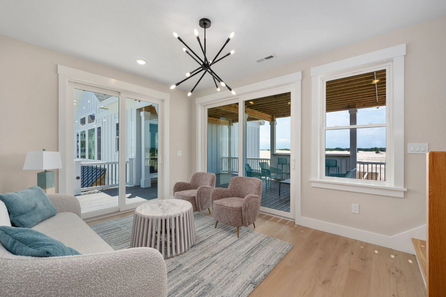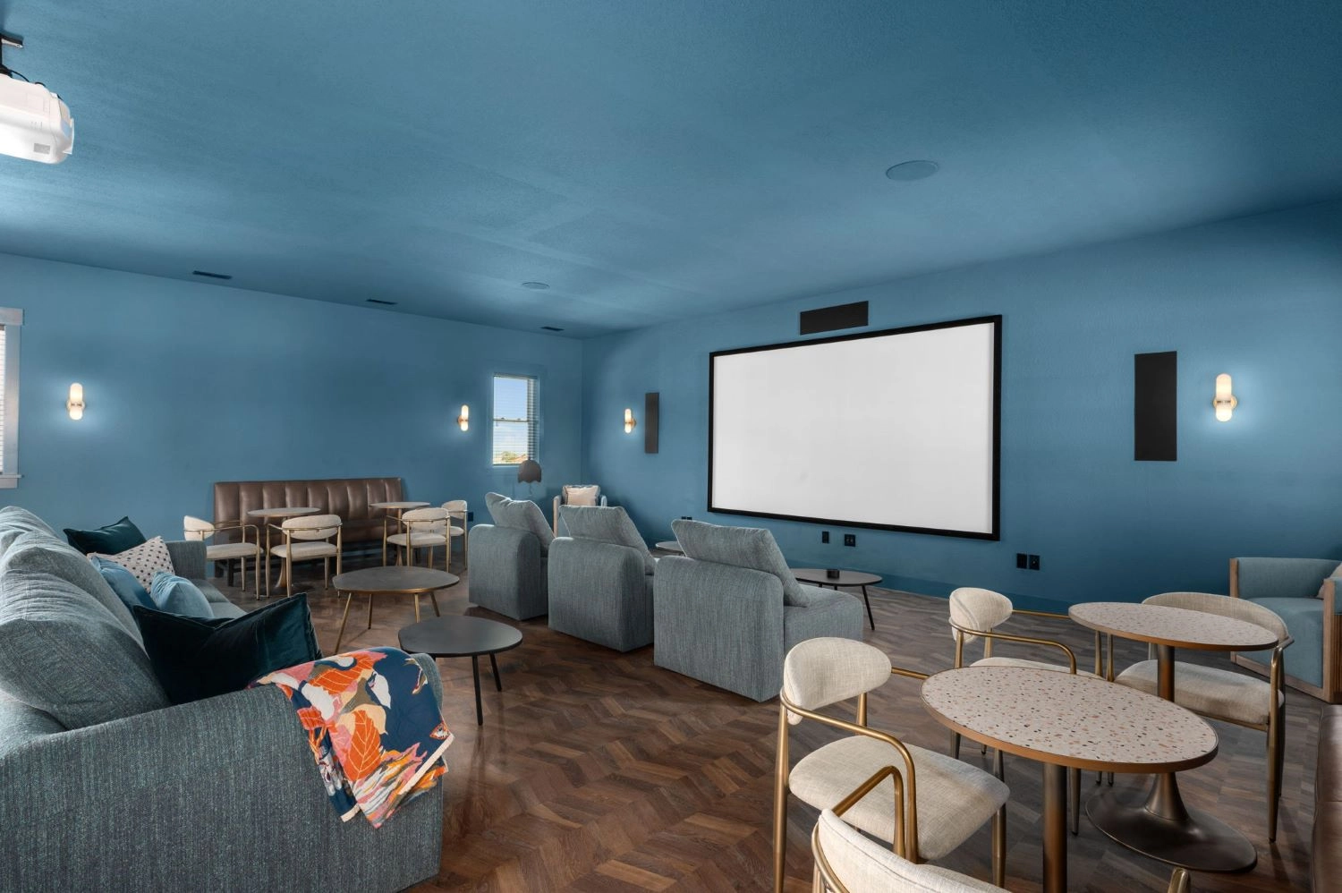 Theater room with 155" screen and state of the art surround sound ; speakeasy-themed bar with dishwasher, ice machine, and two under counter refrigerators; large covered outdoor sunset deck with sound views.