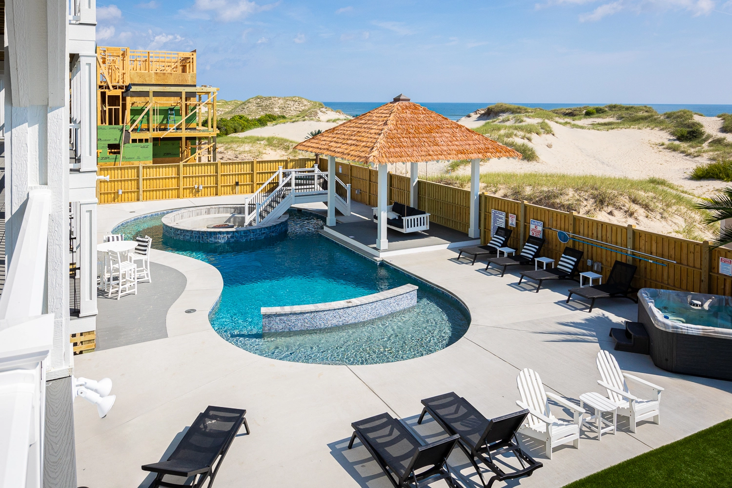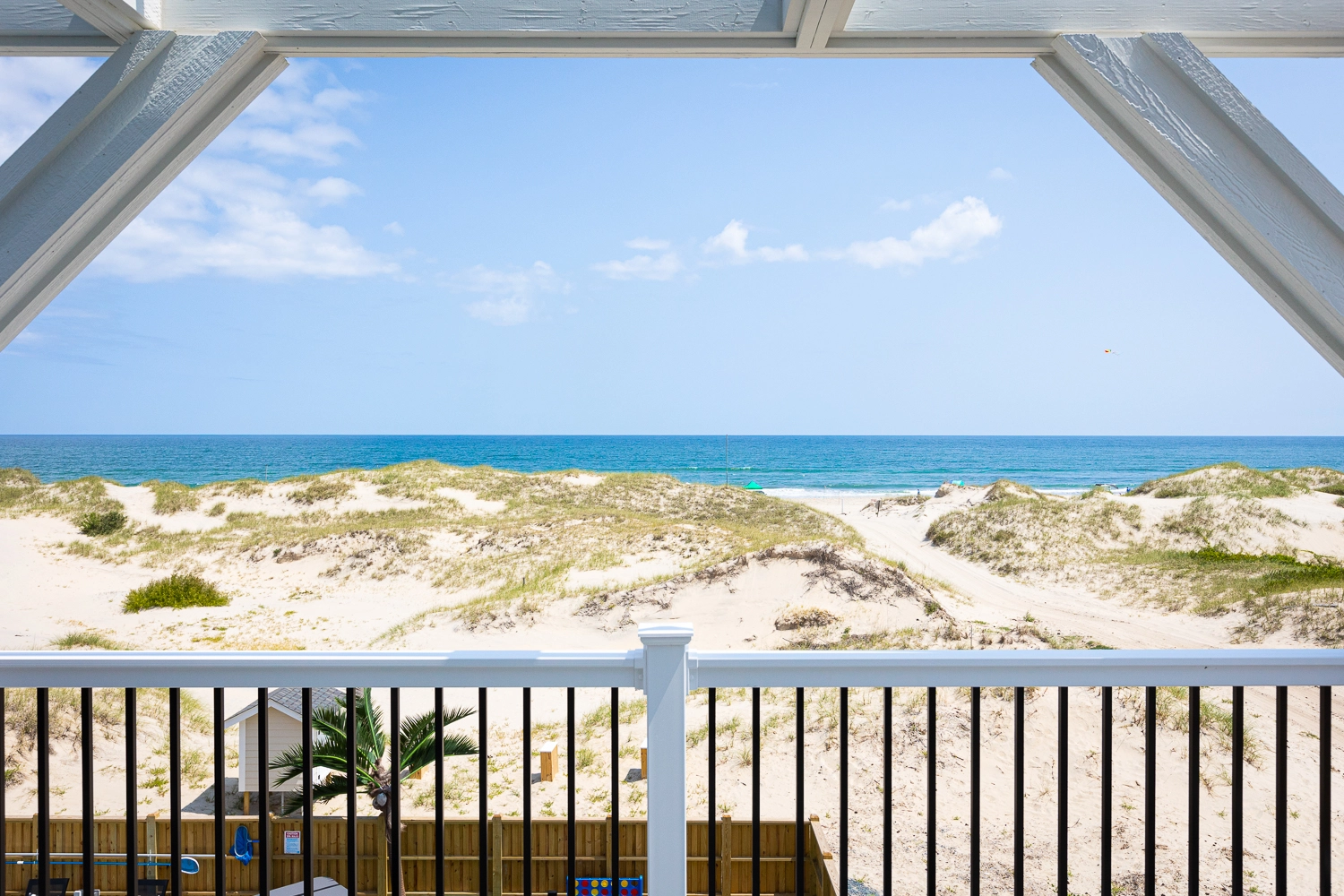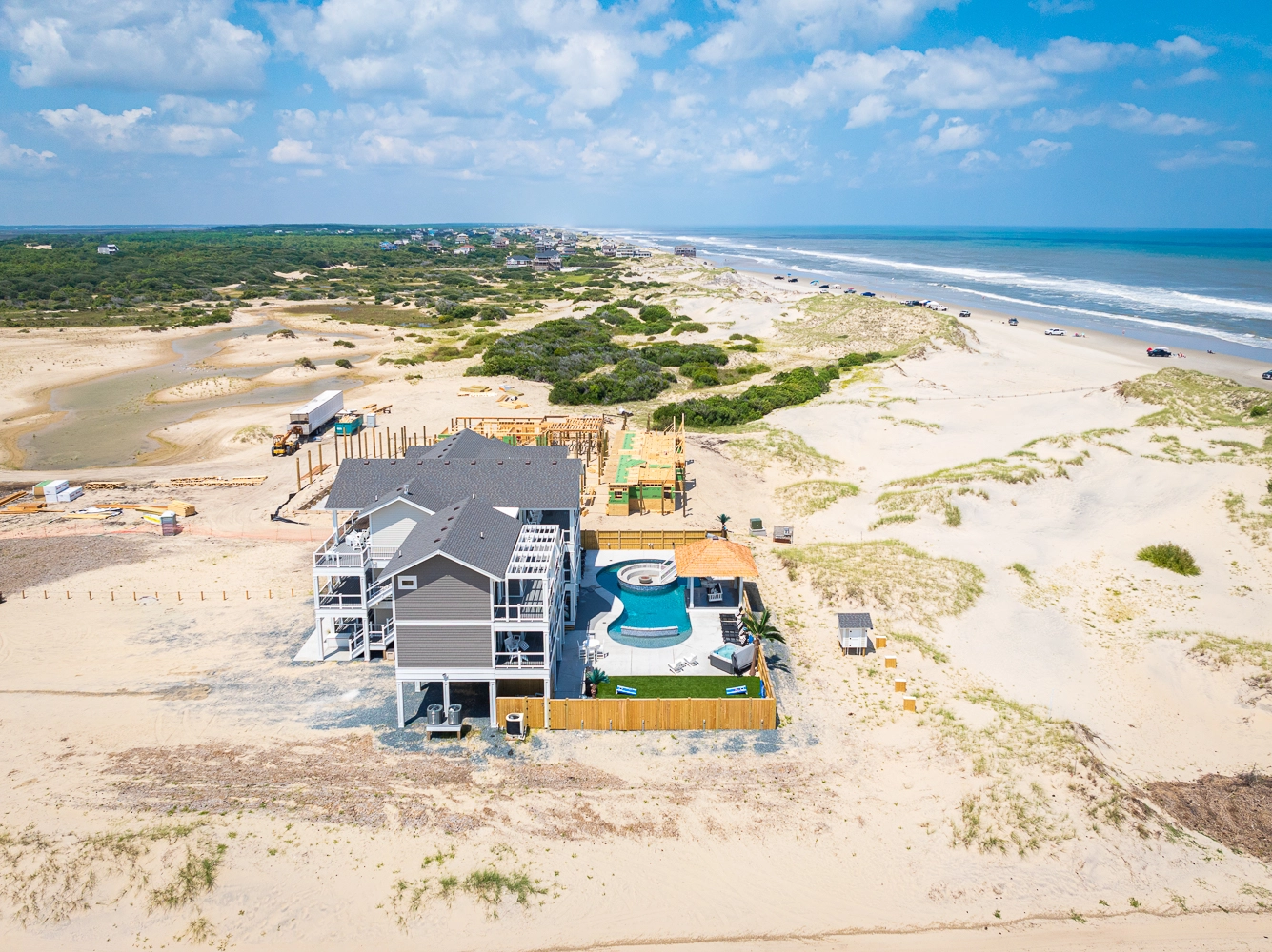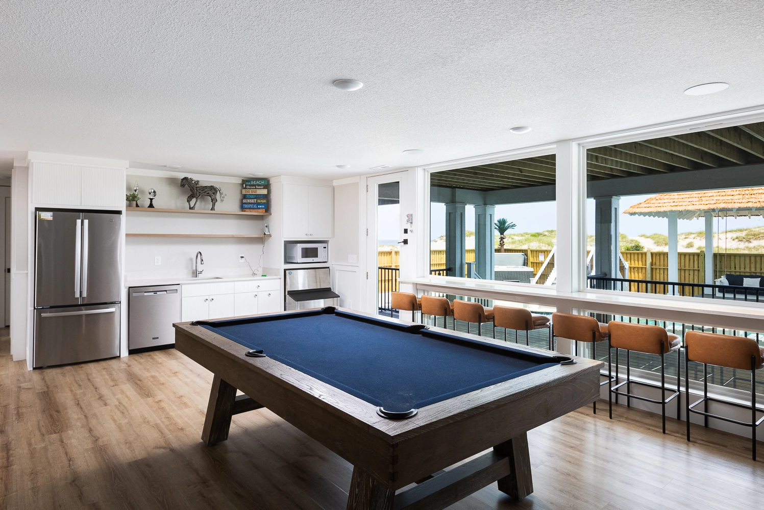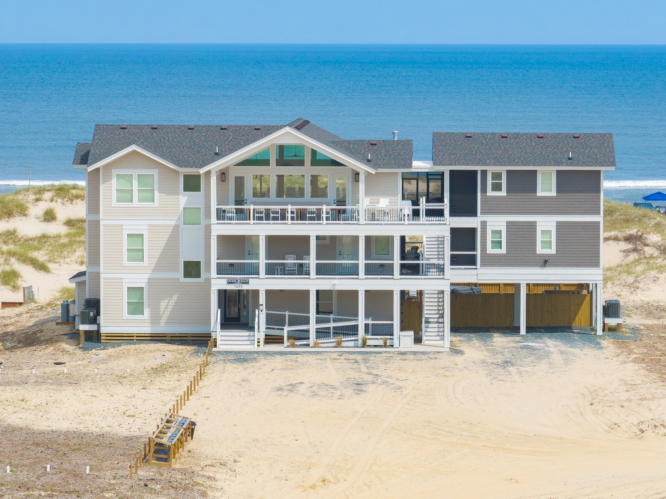 "The Dune Buggy was beautifully decorated. The four rooms in the detached guest house were quiet and serene, allowing late sleepers to rest undisturbed. We absolutely loved the large kitchen and the pool area. The artificial grass with the outdoor games were a big hit with the babies and kids, as they had an outdoor area to play. The views were amazing, both of the ocean and of the sound. It was nice to see the sunrise and sunset from the house without obstructed views. We were so lucky to be able to see the wild horses on the beach and right in front of the home. We even got to see the foal that was born this past spring. Our family had a wonderful vacation."