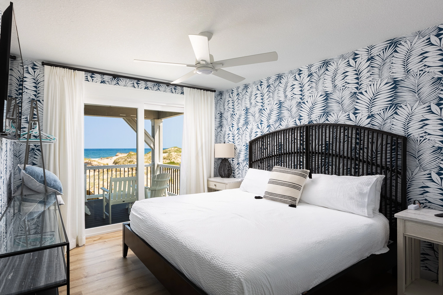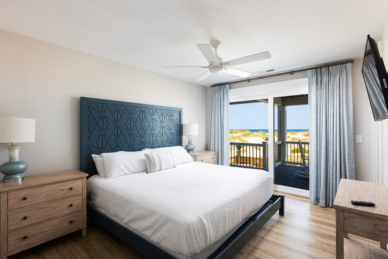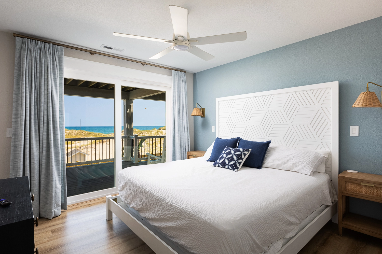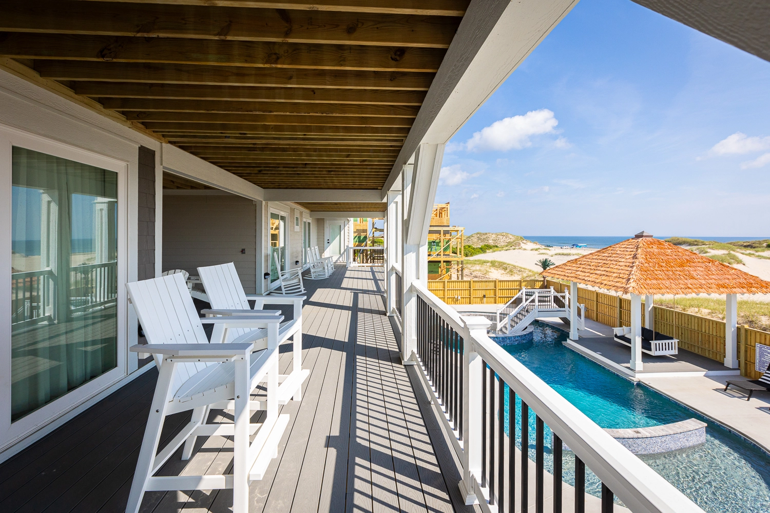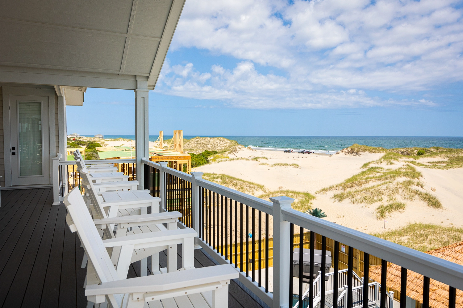 "The Dune Buggy was beautifully decorated. The four rooms in the detached guest house were quiet and serene, allowing late sleepers to rest undisturbed. We absolutely loved the large kitchen and the pool area. The artificial grass with the outdoor games were a big hit with the babies and kids, as they had an outdoor area to play. The views were amazing, both of the ocean and of the sound. It was nice to see the sunrise and sunset from the house without obstructed views. We were so lucky to be able to see the wild horses on the beach and right in front of the home. We even got to see the foal that was born this past spring. Our family had a wonderful vacation."