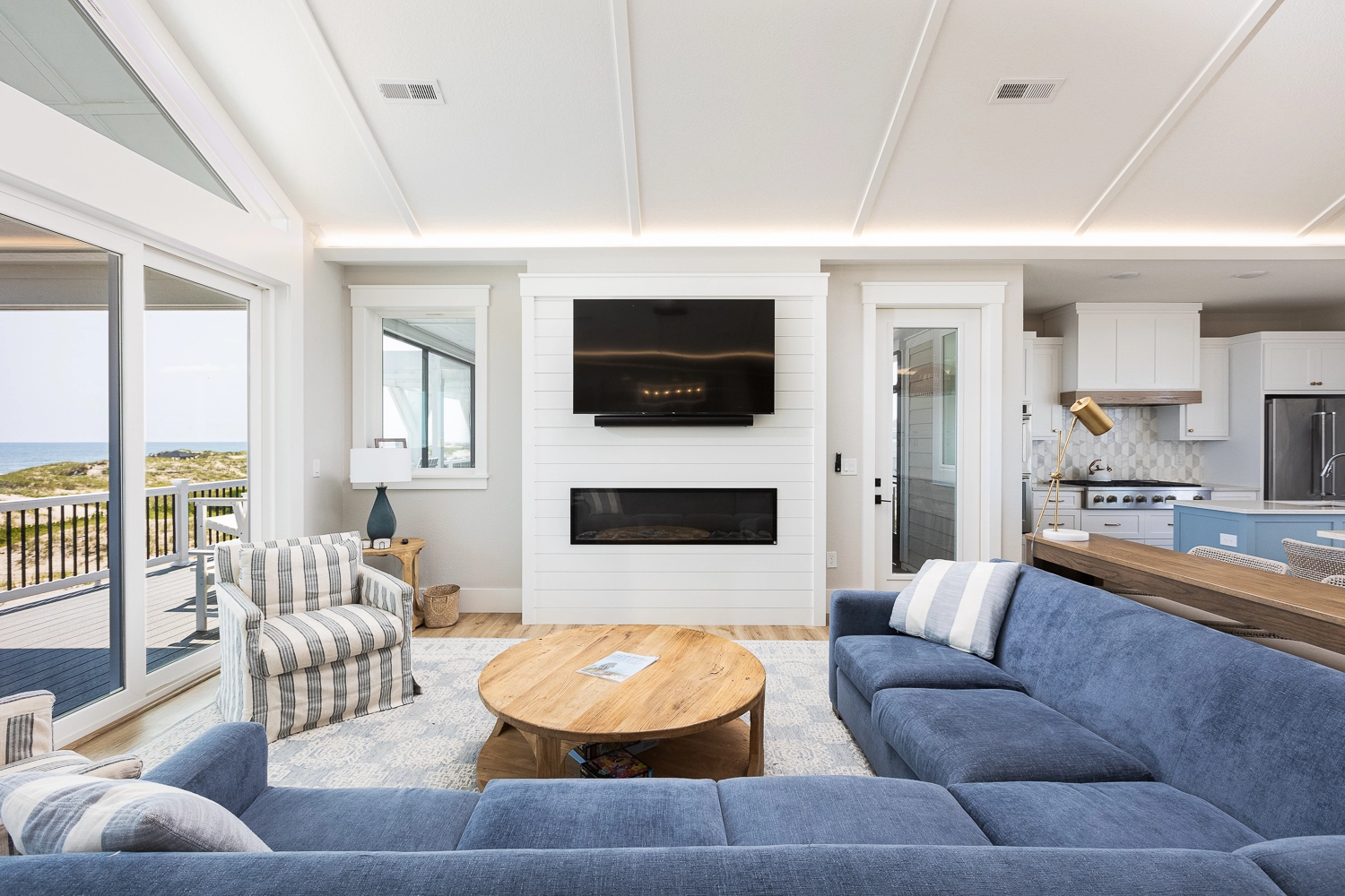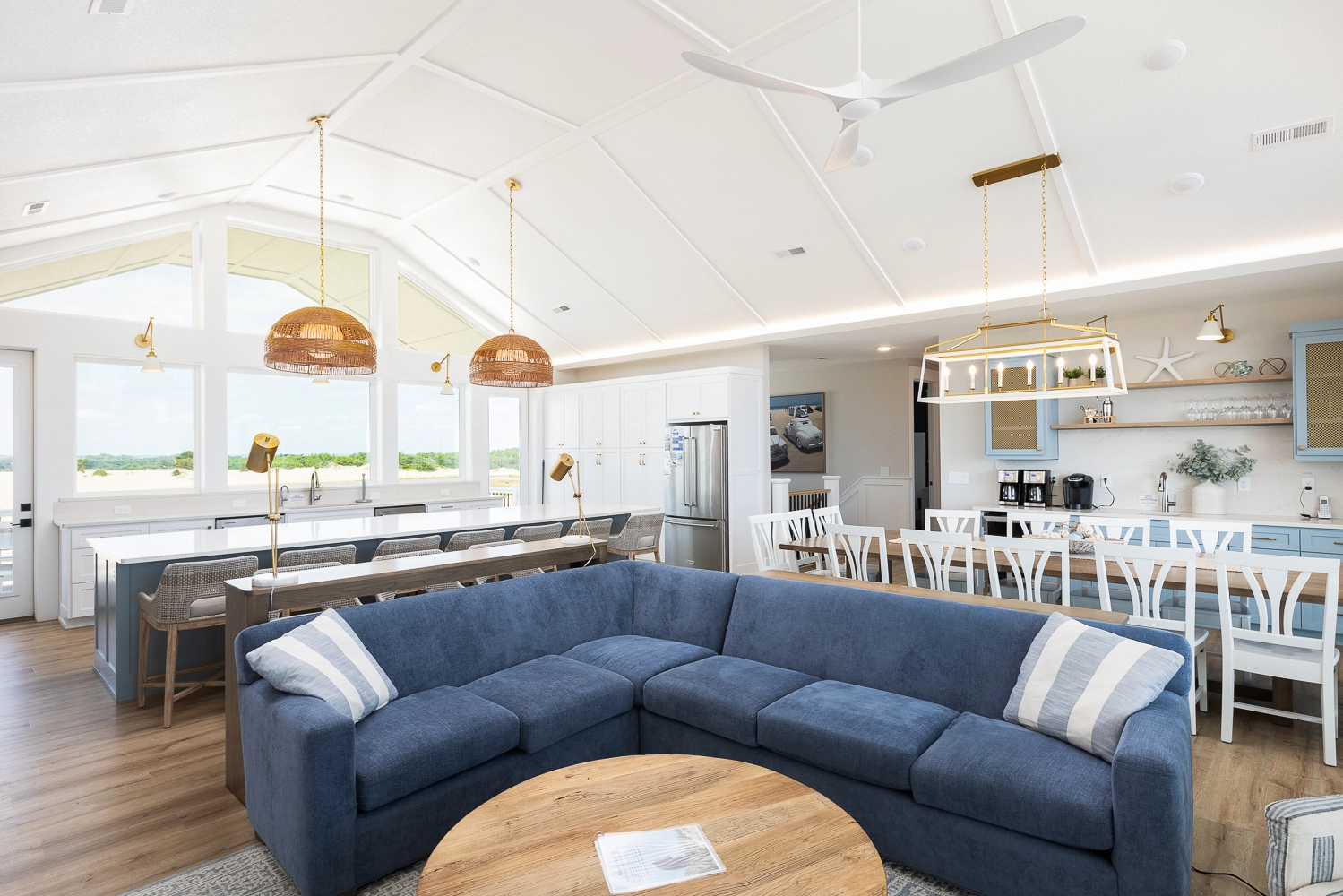 Great room with electric fireplace, kitchen, dining area, coffee bar with under counter refrigerator and sink.