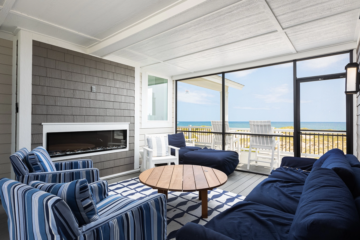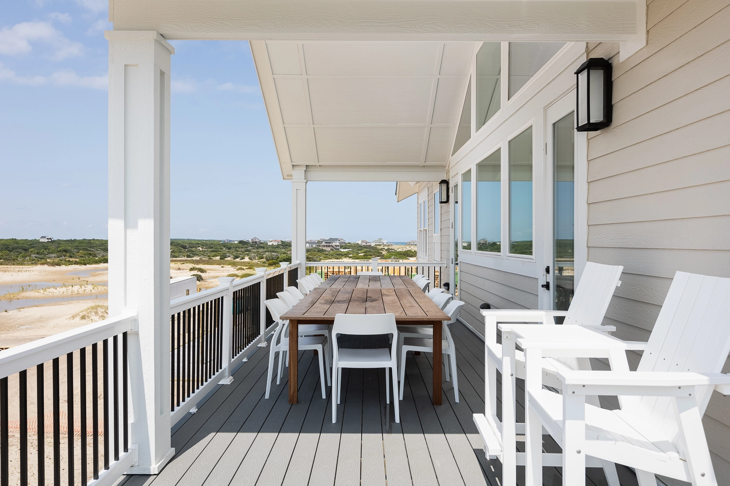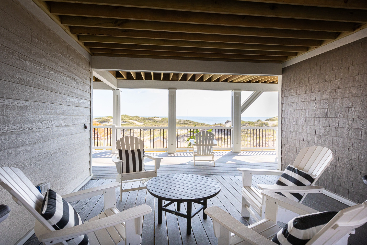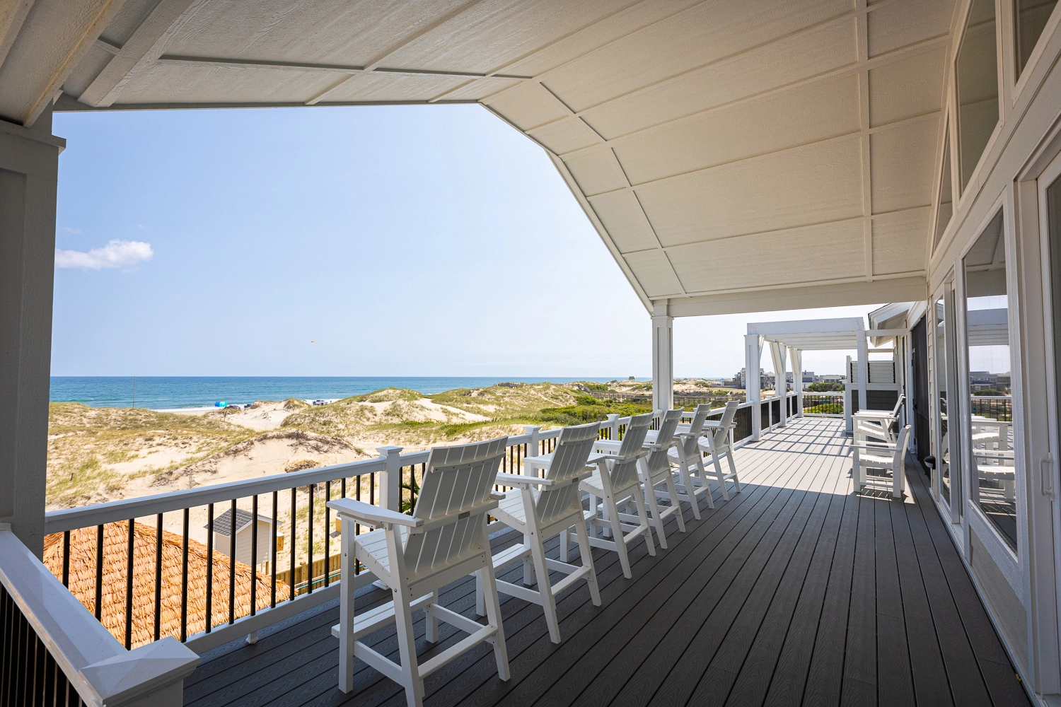 "We loved the location - right on the beach with beautiful views! The home was extremely clean and beautifully decorated (I'm an interior designer so that's important to me). The layout of the home was great, and it has so many amenities. We had private chefs all week and they LOVED the kitchen. The screened porch was one of our favorite places to hang out. We stayed in the bedroom in the separate section and never heard a thing from the main house (lots of grandkids up early). Loved having access to the deck from our bedroom and sleeping with the doors open so we could listen to the ocean (it's still cool at night). We also heard quite a bit of horse activity at night and saw them a lot during the day."