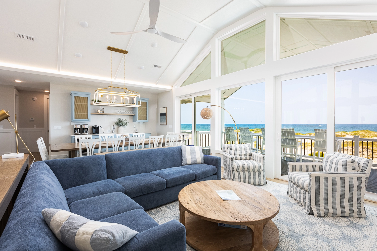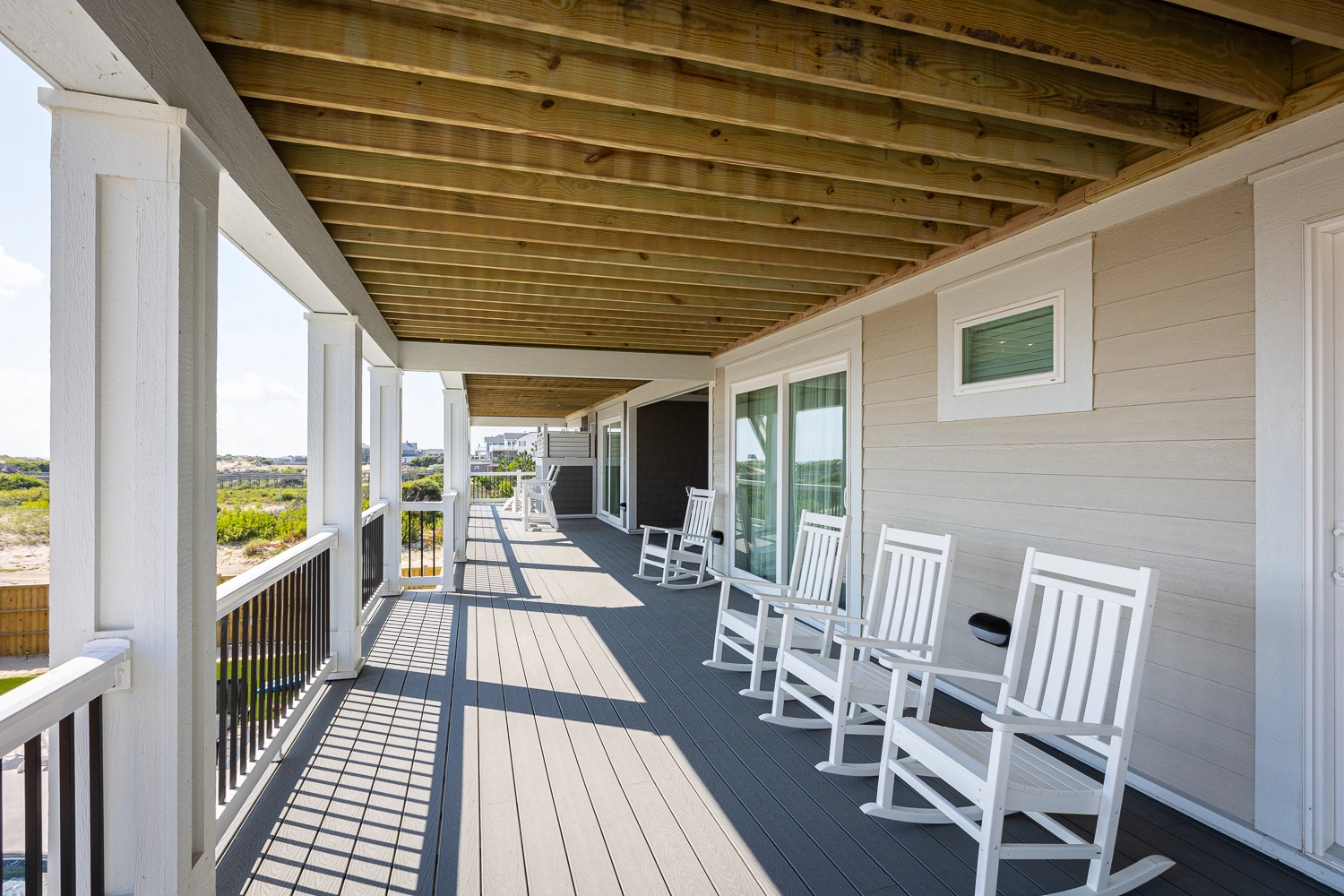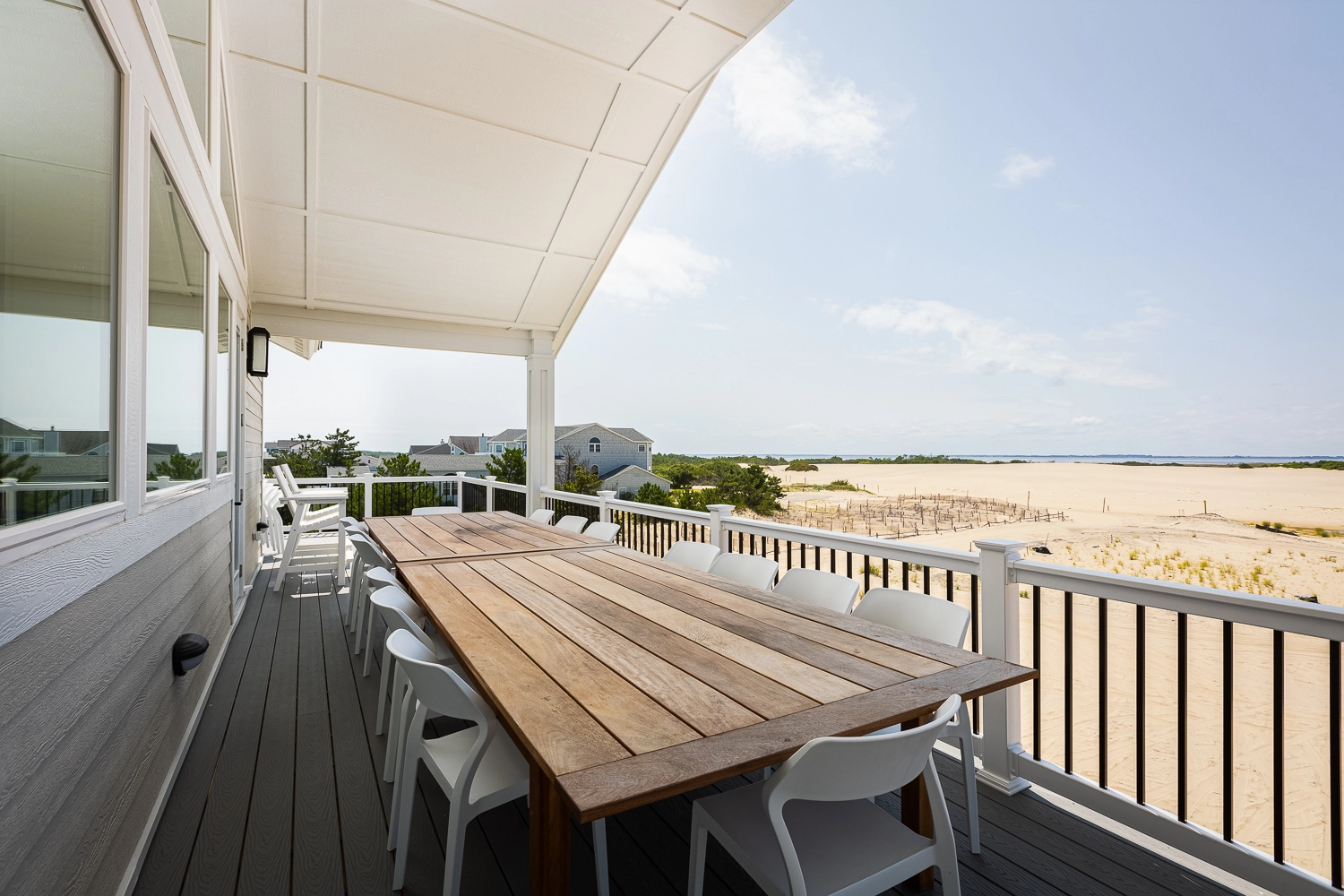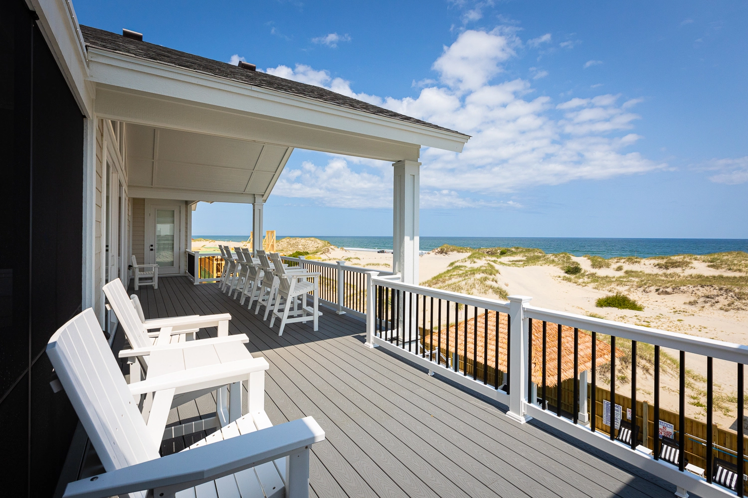 "We loved the location - right on the beach with beautiful views! The home was extremely clean and beautifully decorated (I'm an interior designer so that's important to me). The layout of the home was great, and it has so many amenities. We had private chefs all week and they LOVED the kitchen. The screened porch was one of our favorite places to hang out. We stayed in the bedroom in the separate section and never heard a thing from the main house (lots of grandkids up early). Loved having access to the deck from our bedroom and sleeping with the doors open so we could listen to the ocean (it's still cool at night). We also heard quite a bit of horse activity at night and saw them a lot during the day."