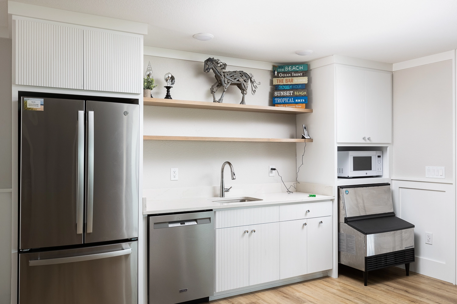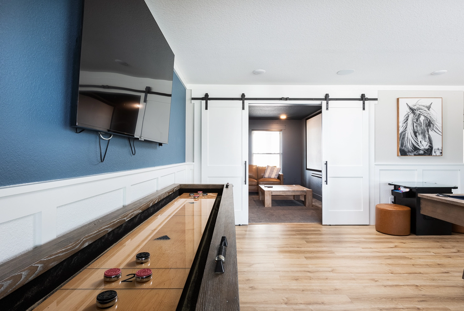Rec room with pool table, arcade game, shuffleboard, and kitchenette with refrigerator, ice machine, microwave, sink and dishwasher; theater room.