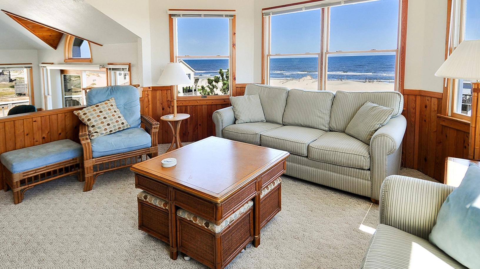 Great room; kitchen; dining area; screened porch with ocean and sound views; open decks.