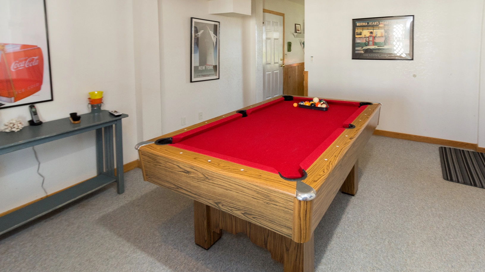 Rec room with pool table and refrigerator; outside bath with toilet and shower.